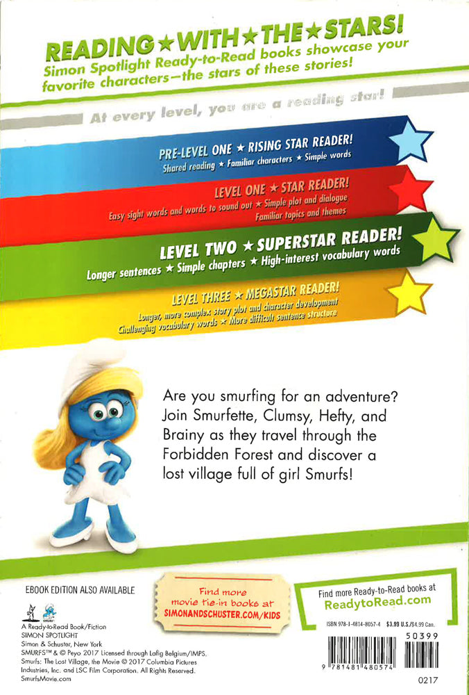 Travel through the mysterious Forbidden Forest in this Level 2 Ready-to-Read book based on Sony Pictures Animation's all-new, fully computer animated feature film, Smurfs: The Lost Village. Smurfs: The Lost Village--starring the voices of Demi Lovato as Smurfette, Rainn Wilson as Gargamel, Mandy Patinkin as Papa Smurf, Jack McBrayer as Clumsy, Danny Pudi as Brainy, and Joe Manganiello as Hefty--hits theaters April 7, 2017! Take a tour of the Forbidden Forest and discover the lost village of Smurfs in this book that reads like a visitor's guide! Fans of the movie will love meeting the new Smurfs, seeing how they protect their village from intruders, learning about dragonfly-riding, and more!