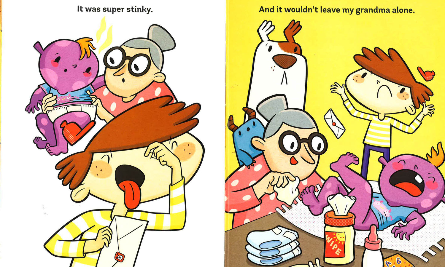 JP is excited to spend the day with Grandma, but his plans are derailed by the arrival of an unwanted, monstrous guest--a baby! This strange and stinky creature requires lots of Grandma's attention, and JP begins to worry that she will have no time to play with him. As JP's imagination runs wild, his jealousy builds. Will JP realize the day is better spent shared?