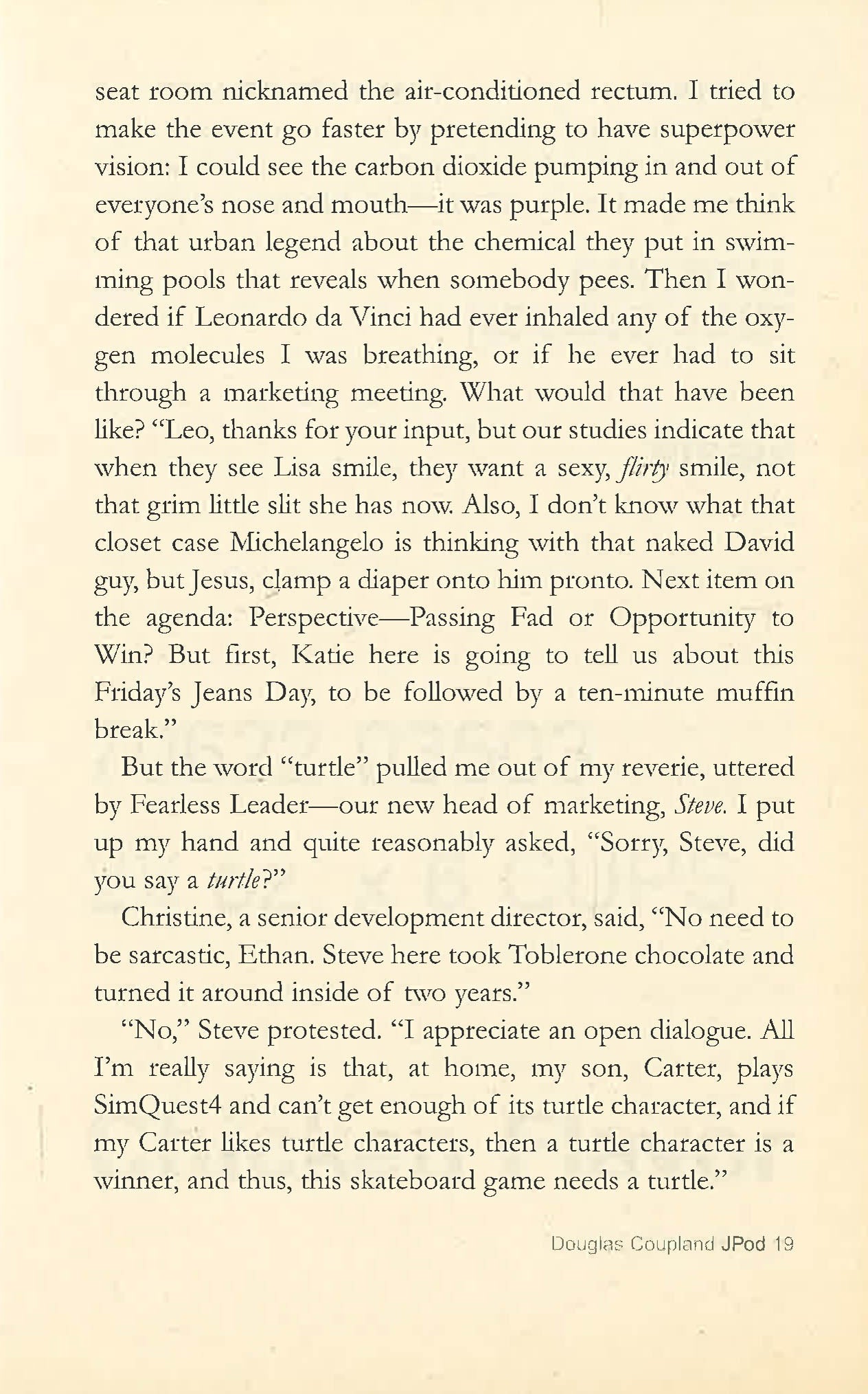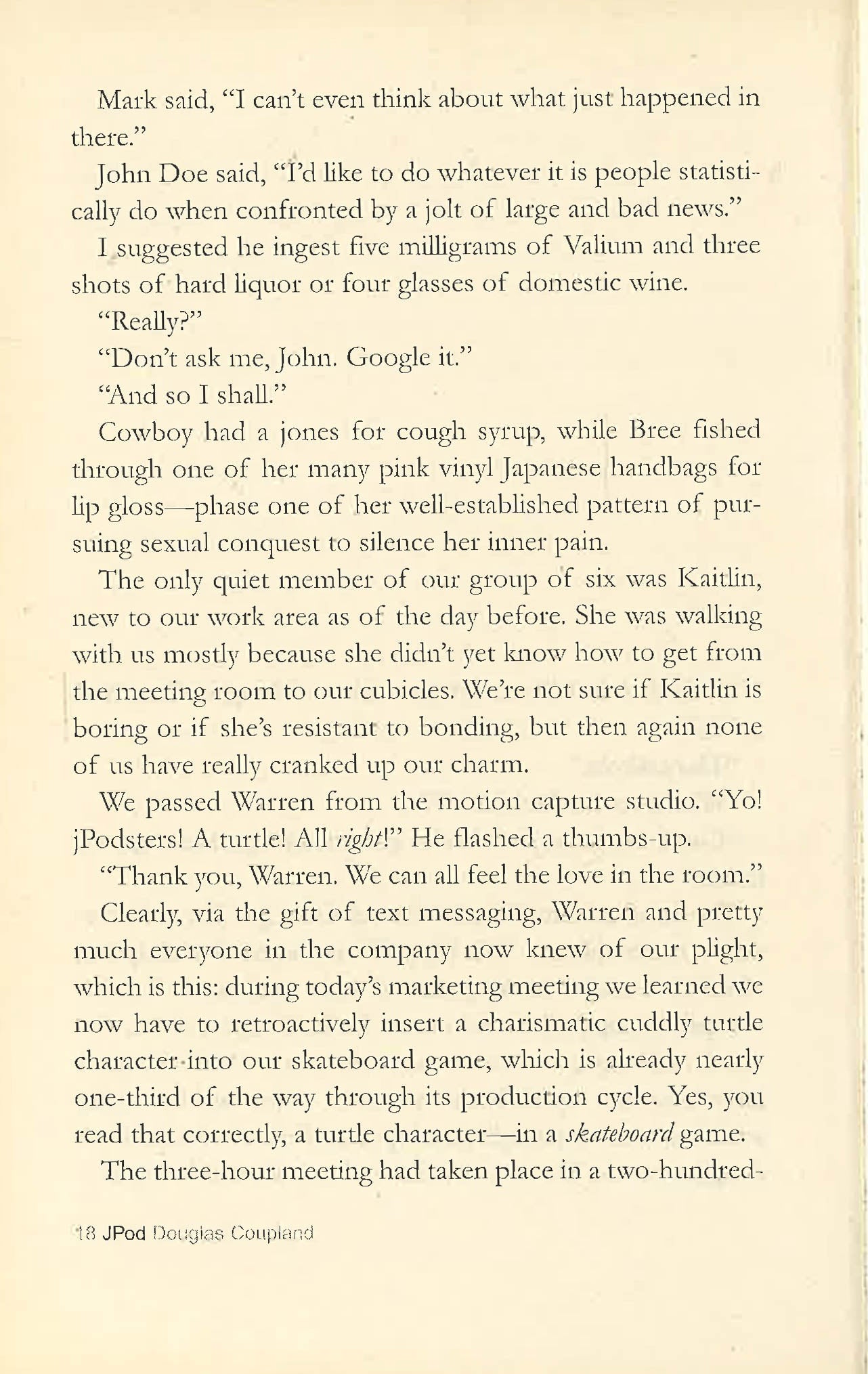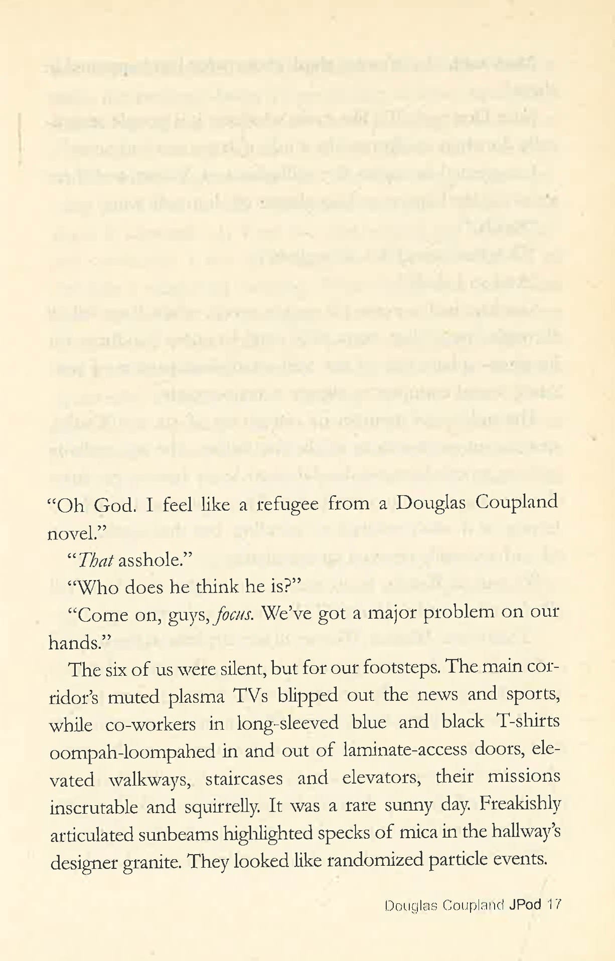 Ethan and his five co-workers are marooned in JPod, a no-escape architectural limbo on the fringes of a massive game-design company. There, they wage battle against the demands of boneheaded marketing staff who torture them with idiotic changes to already idiotic games. Meanwhile, Ethan's personal life is being invaded by marijuana grow-ops, people-smuggling, ballroom dancing, global piracy and the rise of China. Everybody in both worlds seems to inhabit a moral grey zone, and nobody is exempt, not even his seemingly strait-laced parents or Coupland himself.