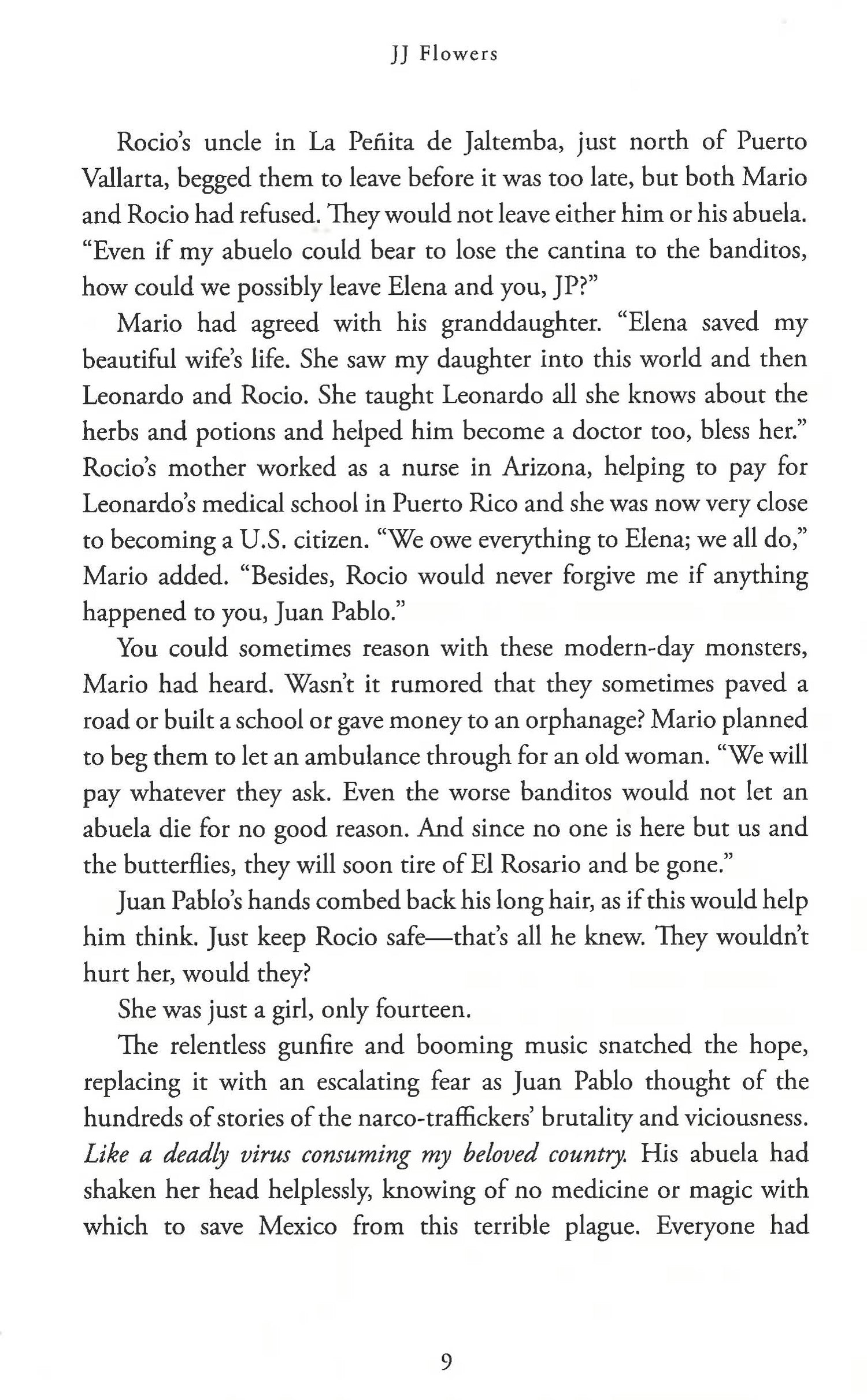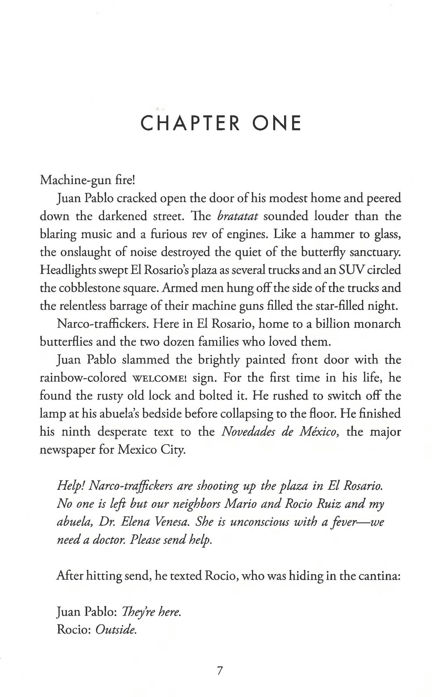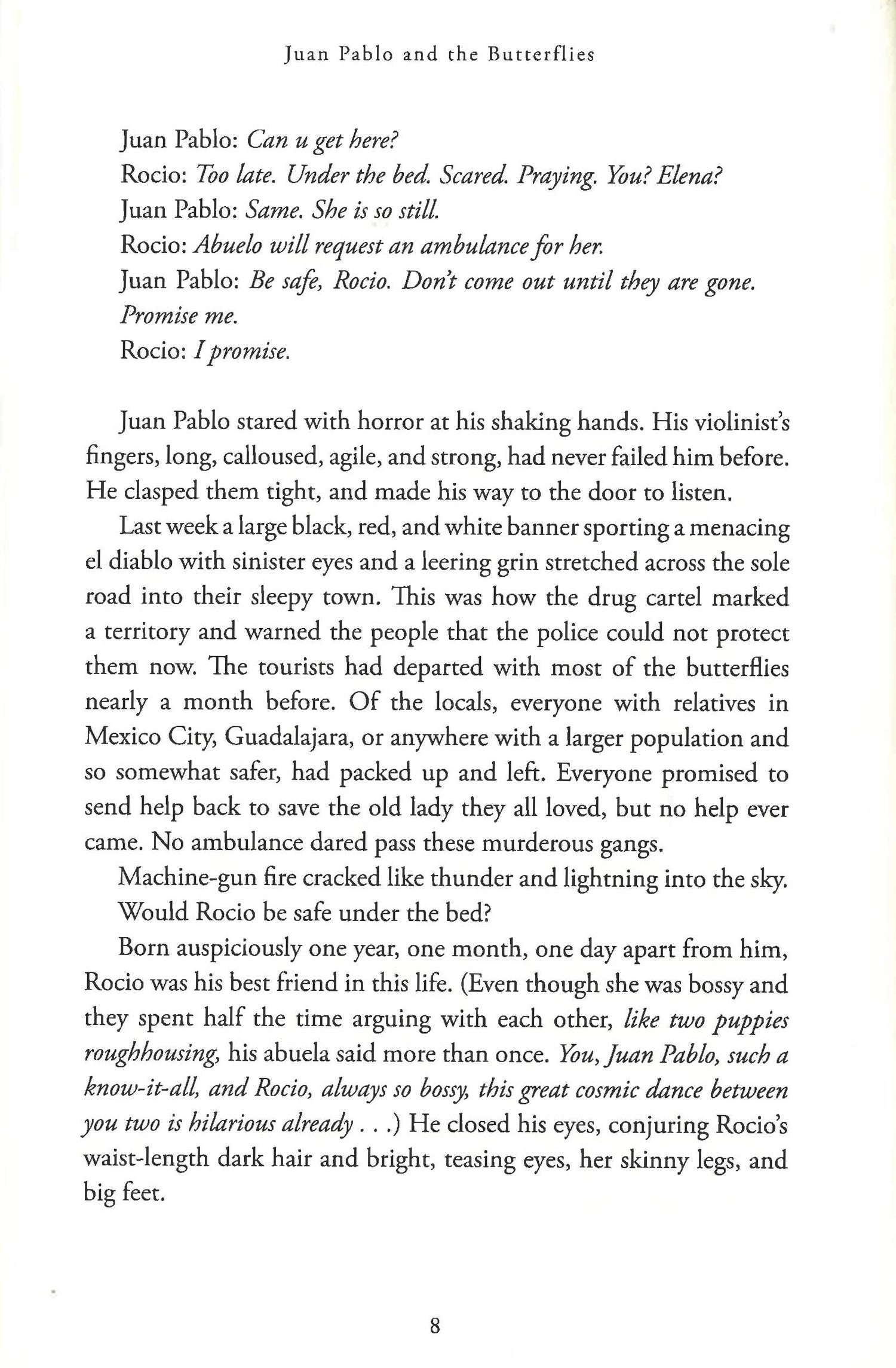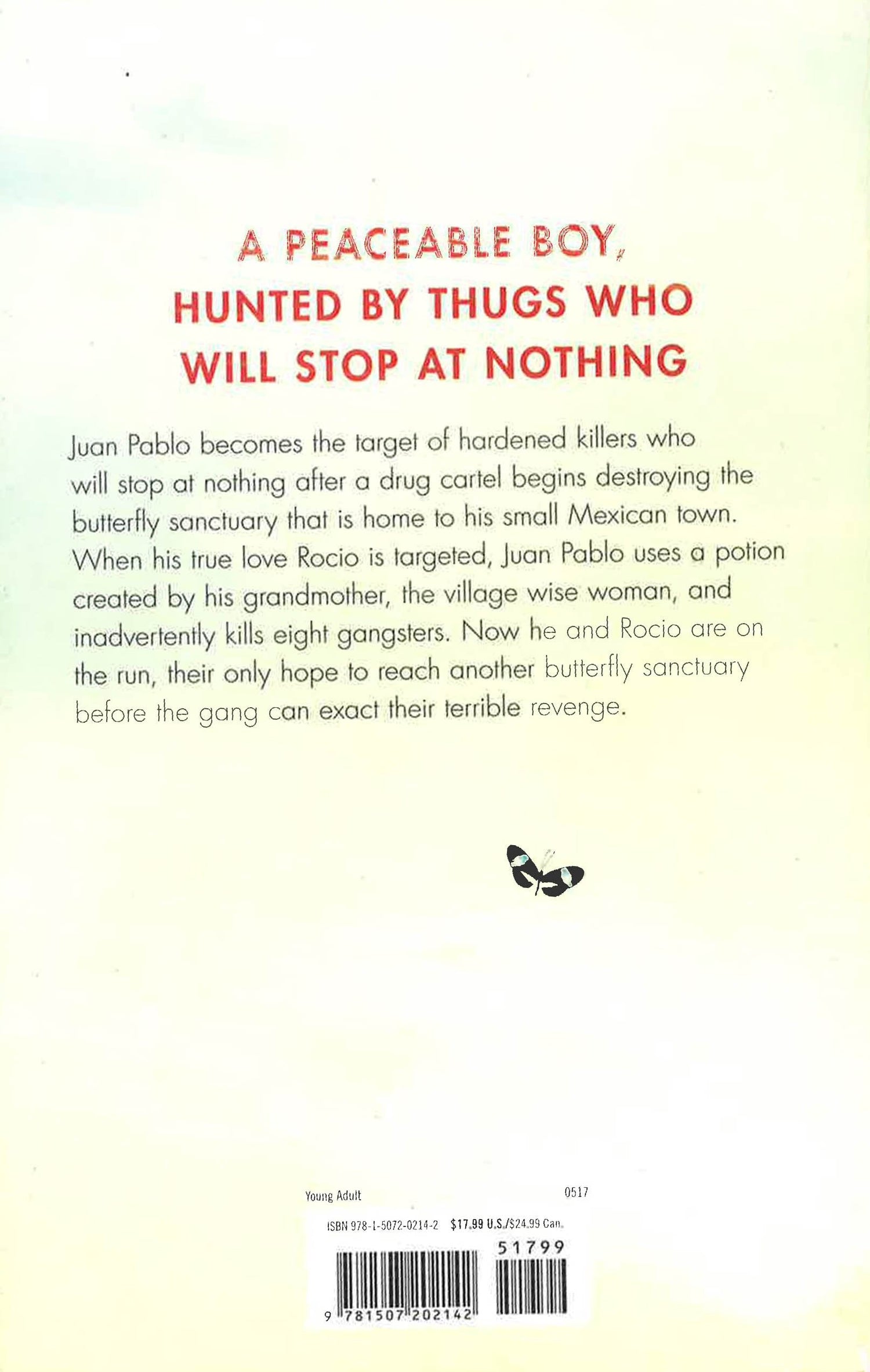 He loves his music, the butterflies, and his grandmother, who has fallen fatally ill--which is why he can't leave, even when a nefarious drug cartel overtakes the town. But the threat of the cartel becomes ever more menacing, finally endangering the life of his best friend Rocio, the girl he loves. In a heroic act of desperation to save her, Juan Pablo poisons eight members of the cartel.