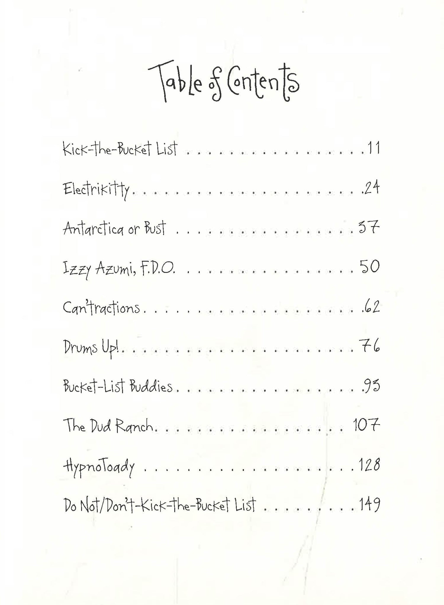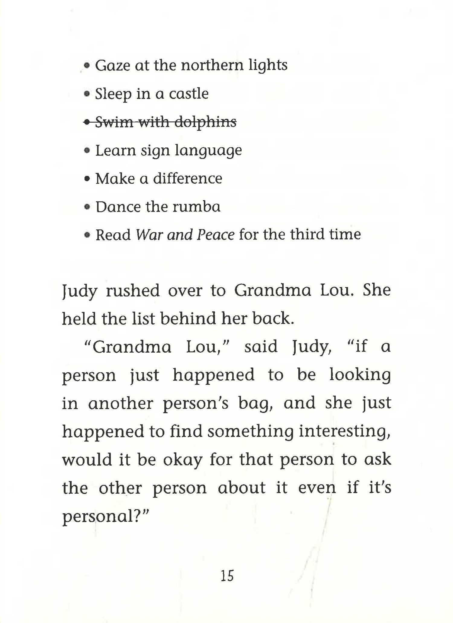 When Judy discovers Grandma Lou's "Bucket List", she comes up with her own list of things to accomplish before the Fourth Grade. That list leads Judy into an array of outlandish situations, and Judy can't help but wonder what it means that her grandmother's list is nearly complete.
