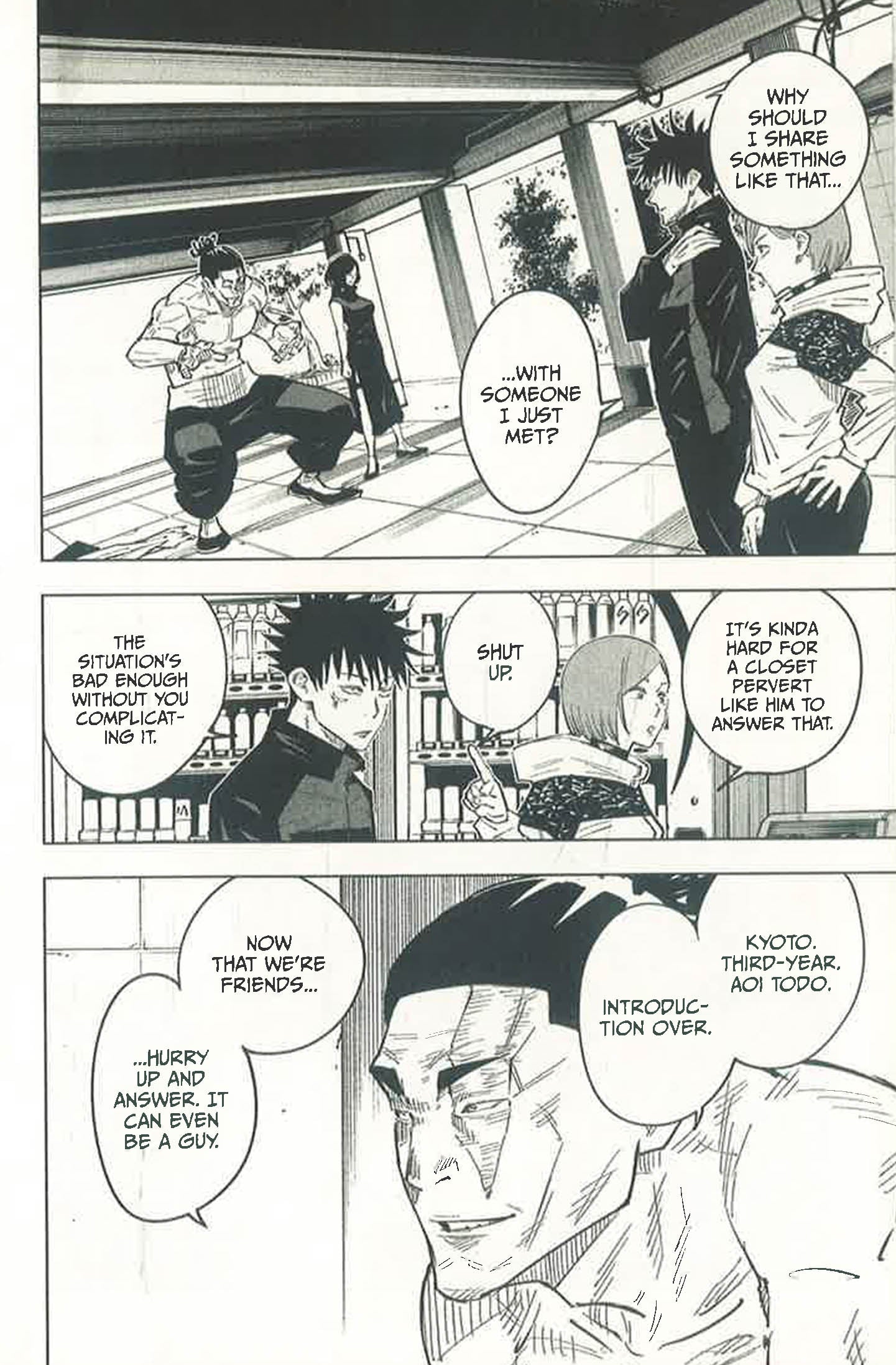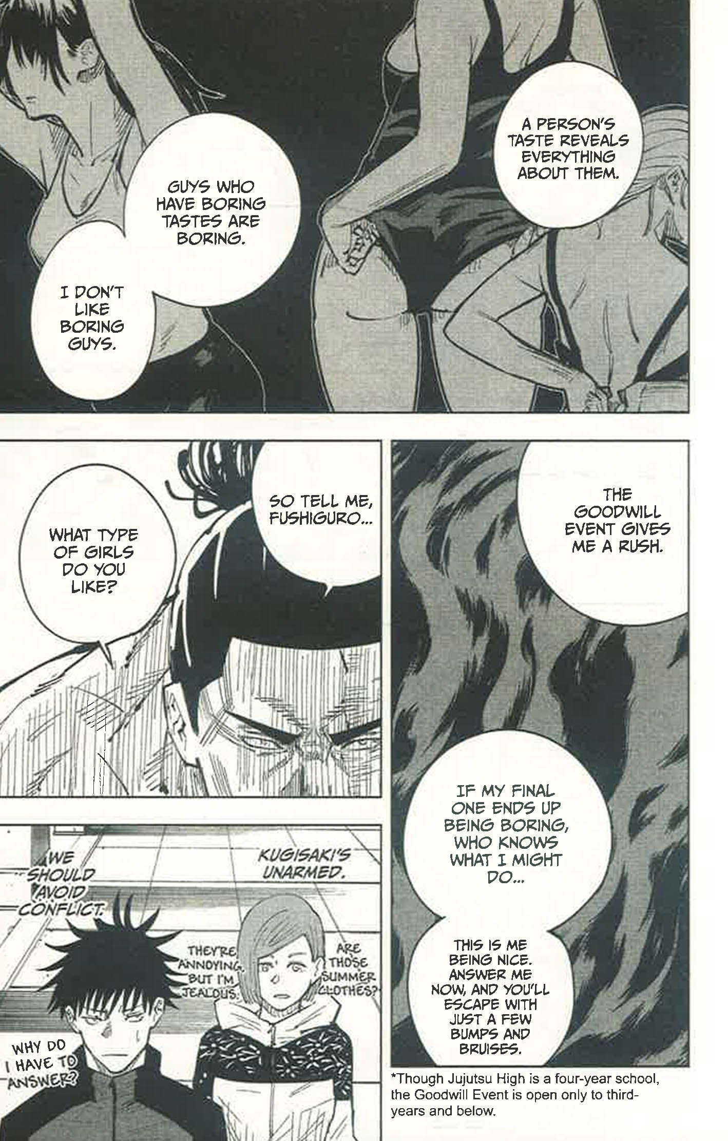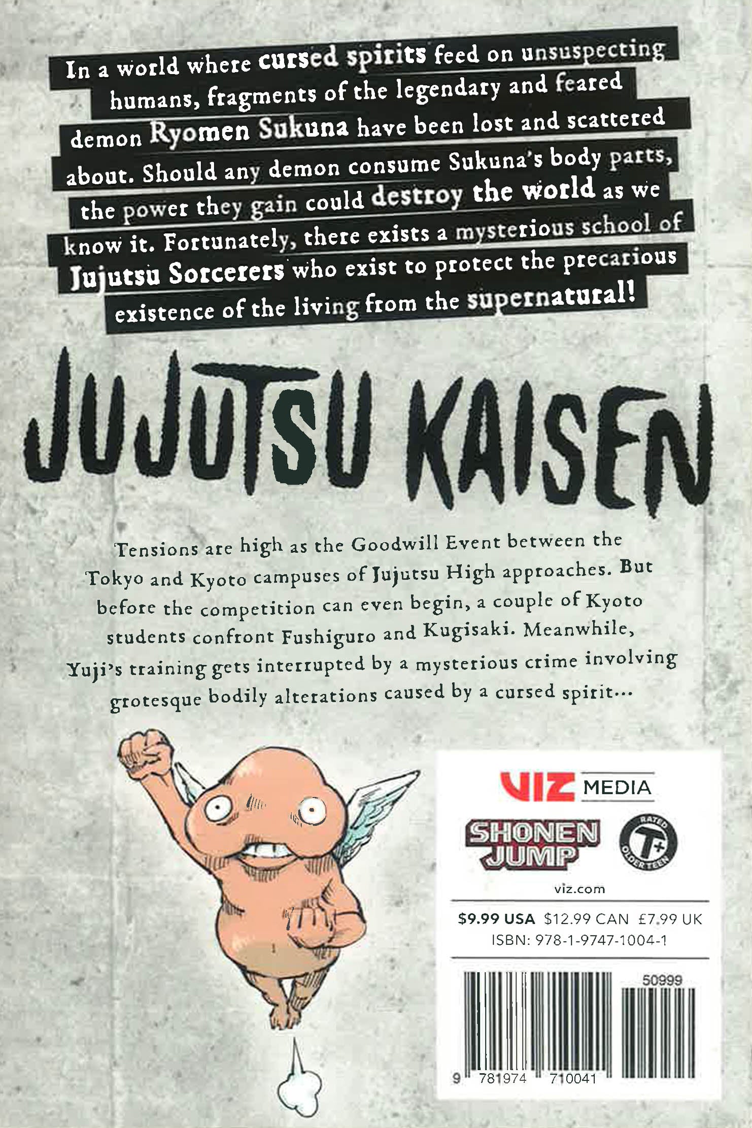 Tensions are high as the Goodwill Event between the Tokyo and Kyoto campuses of Jujutsu High approaches. But before the competition can even begin, a couple of Kyoto students confront Fushiguro and Kugisaki. Meanwhile, Yuji’s training gets interrupted by a mysterious crime involving grotesque bodily alterations caused by a cursed spirit...