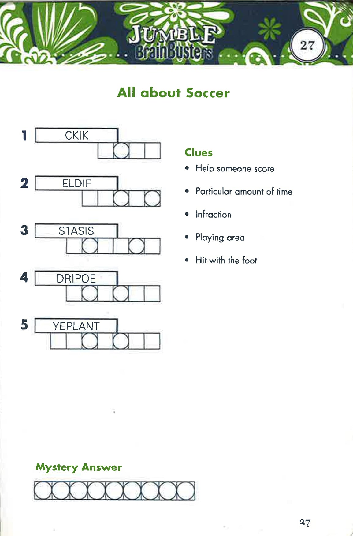 Pocket Posh Jumble BrainBusters 3features 100 puzzles that players must unscramble to reveal the ultimate answer.Jumble BrainBusters 3combines the popularity of challenging Jumble puzzles with the intrigue of trivia, riddles, math, and even crosswords. Players solve the puzzle using clues and the answer is revealed, but jumbled. Once the answers are filled in, the player unscrambles the circled letters to solve the mystery answer.