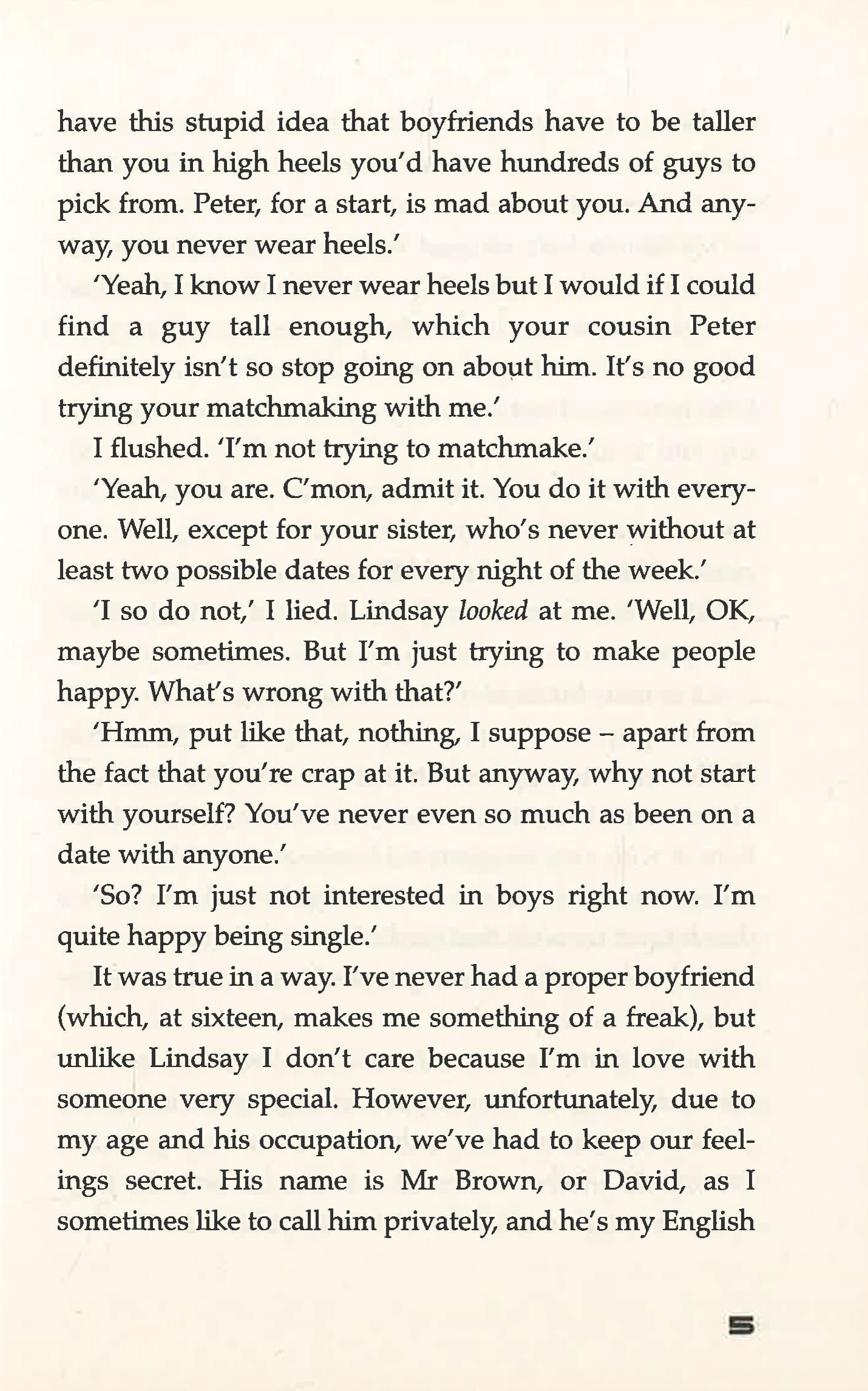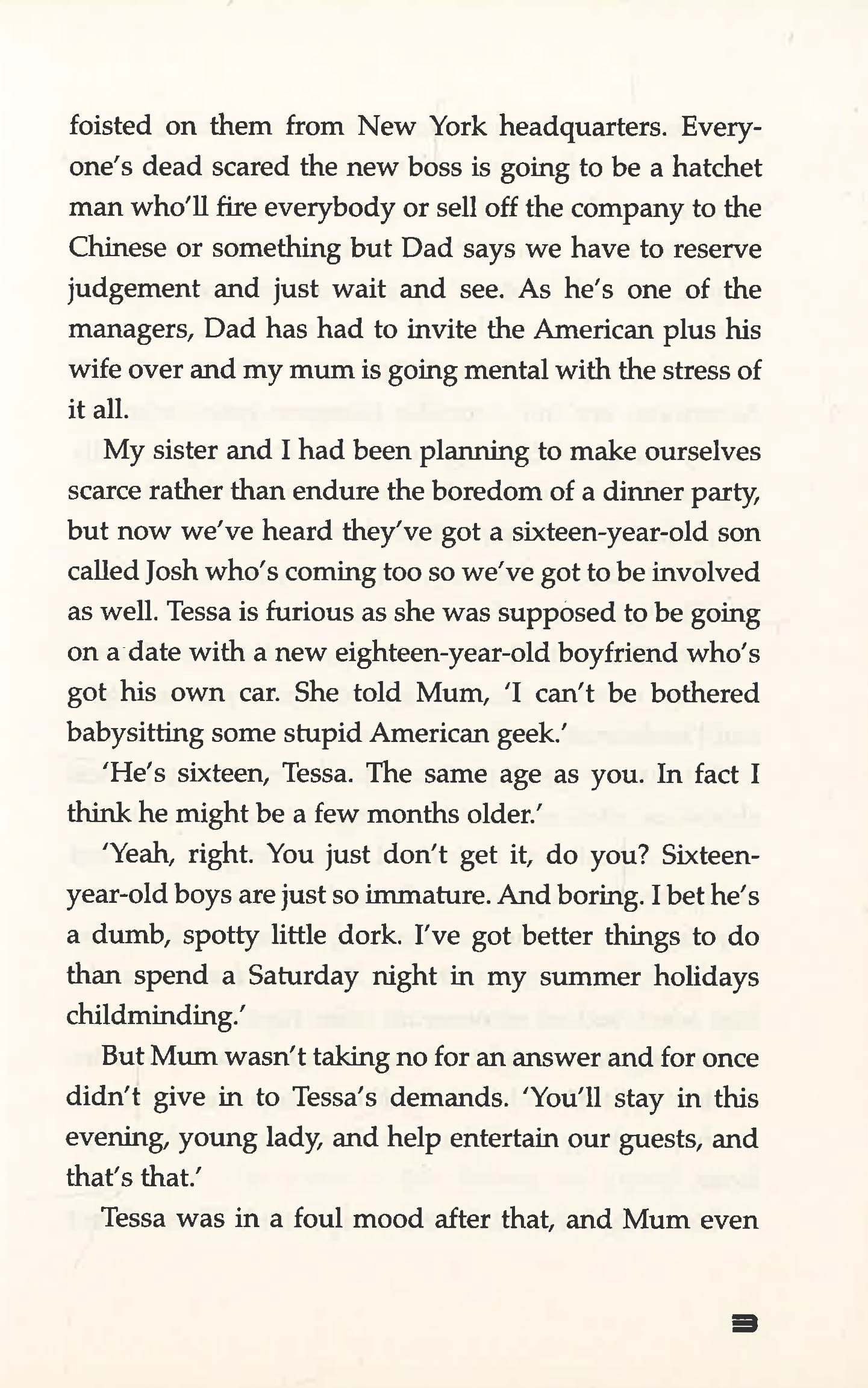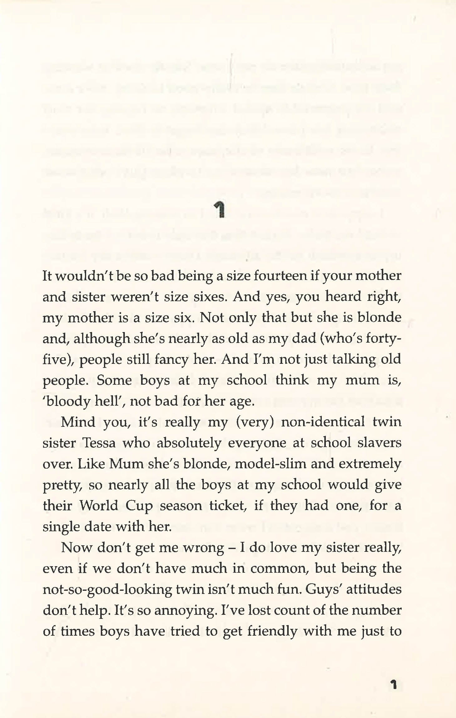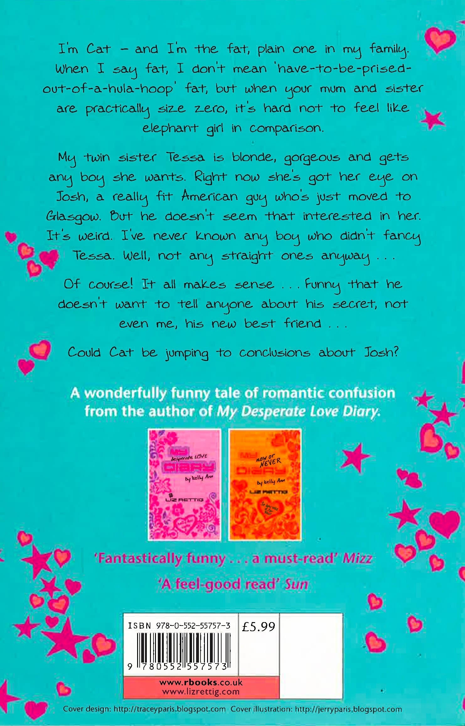 Cat is fat and boring - or so she thinks. Her mum is a stick insect and so is her twin sister Tessa - a bit of a spoilt brat who can get any boy she wants. There's a new arrival in their town from the USA - Josh, the son of their dad's boss. He's gorgeous so Tessa is keen and Cat knows she doesn't have a chance... But Josh seems strangely uninterested in Tess. Cat thinks there must be more to the situation... She and Josh become friends and eventually she thinks she's got to the bottom of the mystery...maybe Josh just isn't into girls at all...? Now she has a new best gay friend, cat's life is much happier, and she and Josh get on wonderfully. If only things could stay that simple...