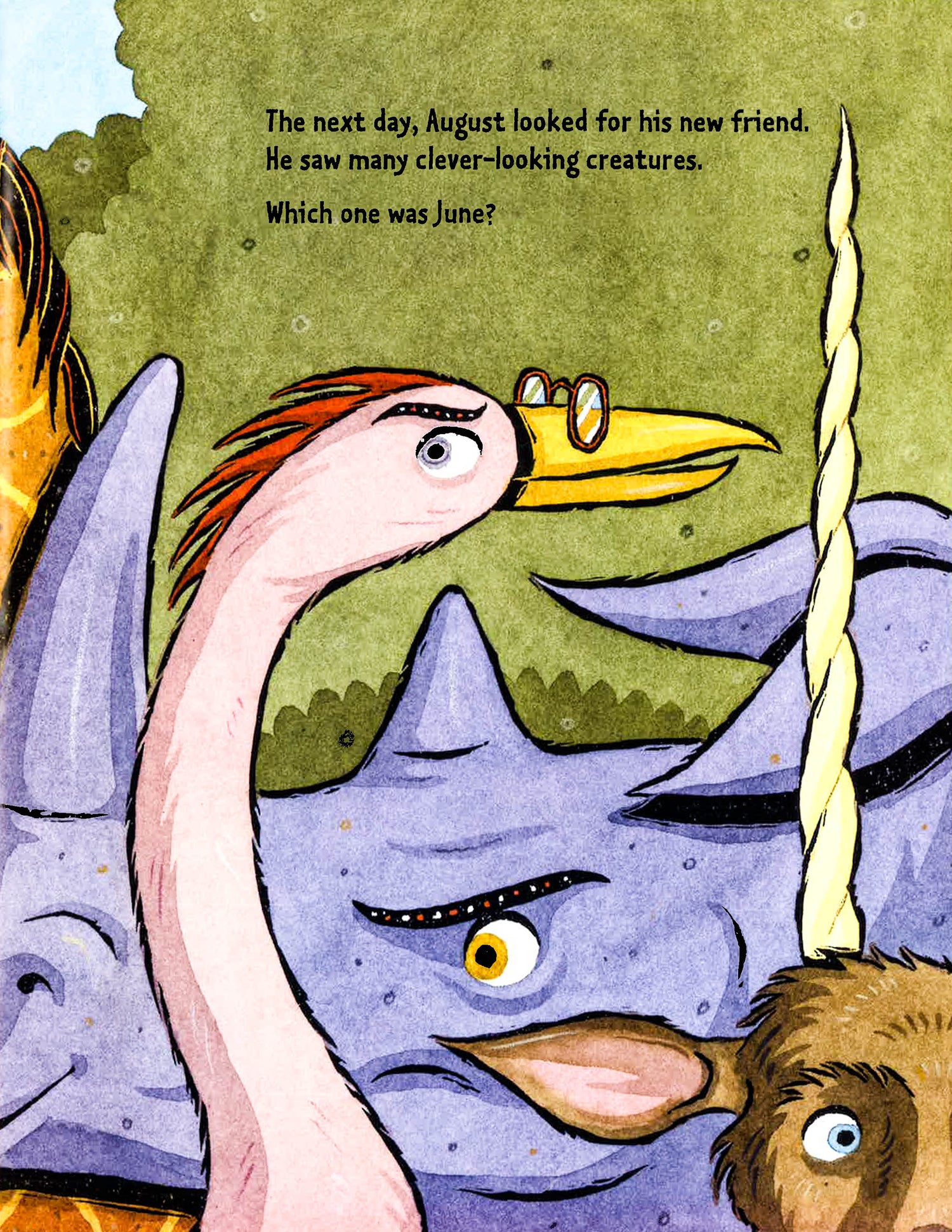 This imaginative story explores the concept that the greatest friendships can come to be if you are willing to overlook differences. Vivian Walsh is the co-creator of several bestselling books for children. In June and August she once again makes a misunderstanding the humorous but pivotal moment that brings together two very unlikely friends. One night in the jungle, June is thrilled to see a shooting star, while August loves looking at the moon. Although they can't see each other in the dark, the two promise to meet again the next day. But when morning dawns, they face a dilemma. How are June and August going to recognize each other?F&P level: K F&P genre: F