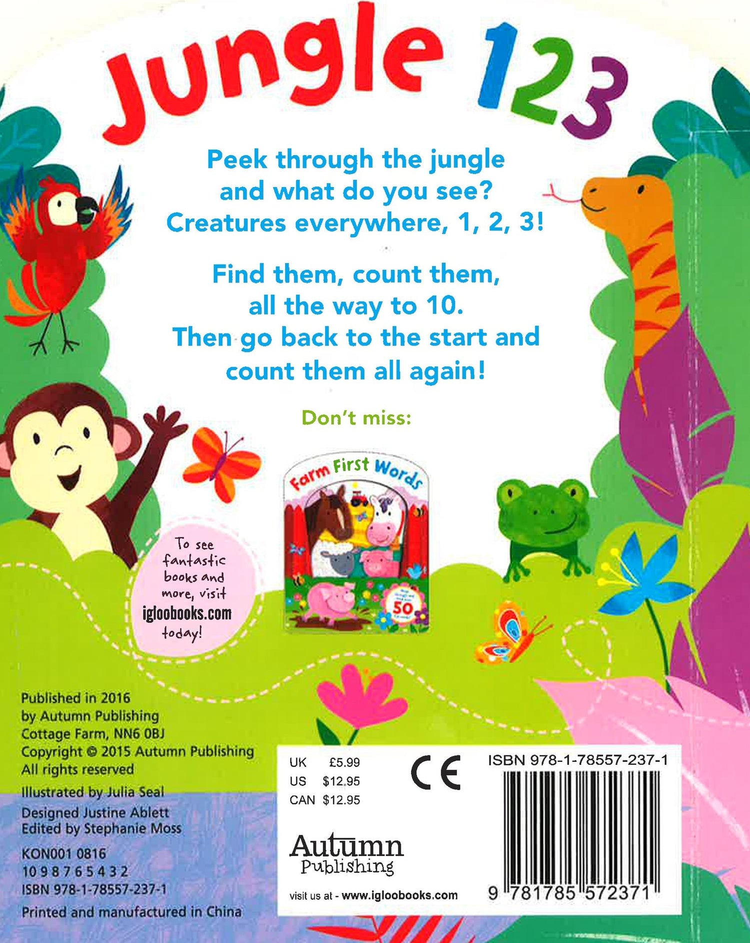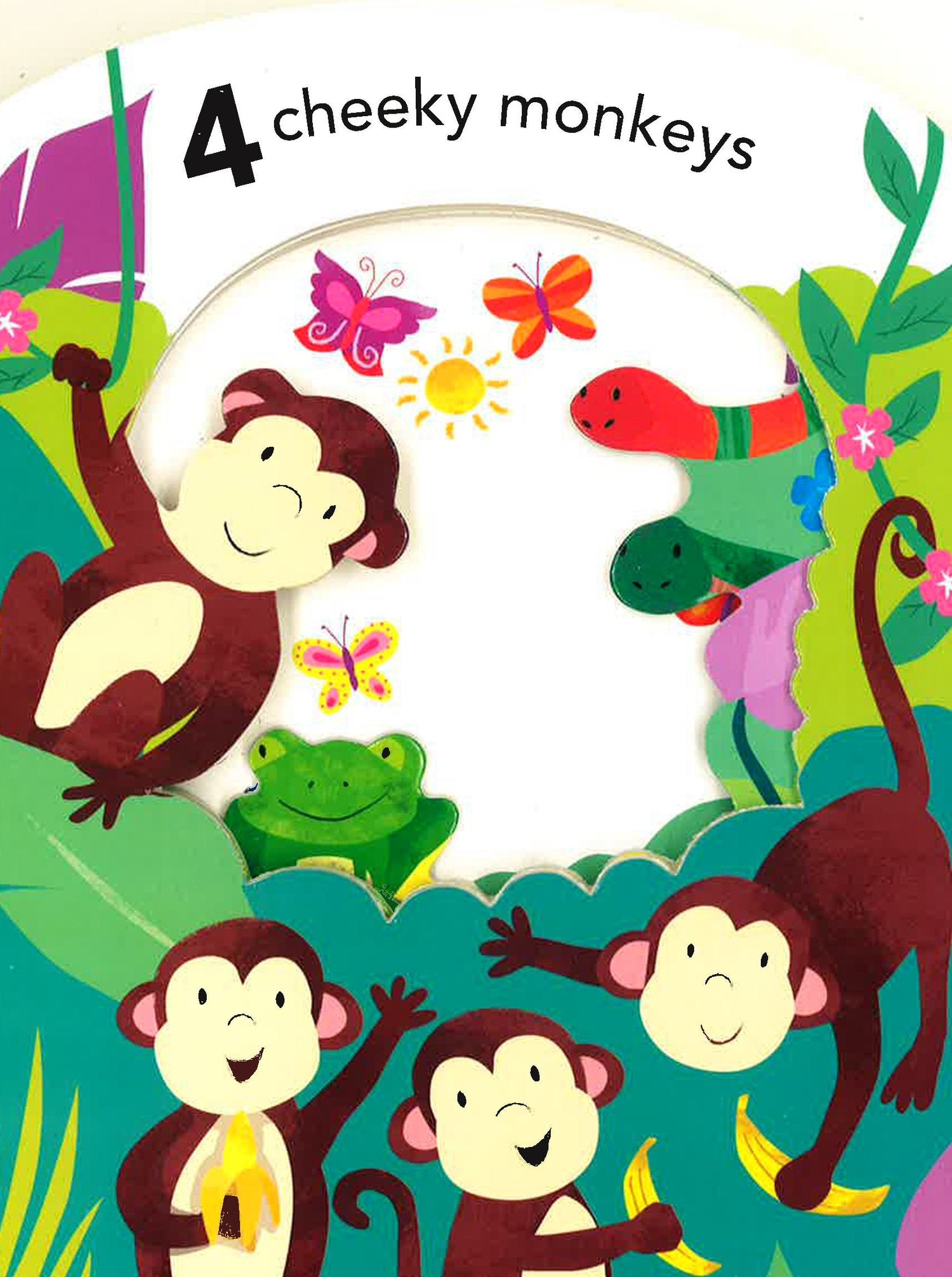 Peek through the jungle and what do you see? Creatures everywhere, 1, 2, 3,! Find them, count them, all they way to 10. Then go back to the start and count them all again!