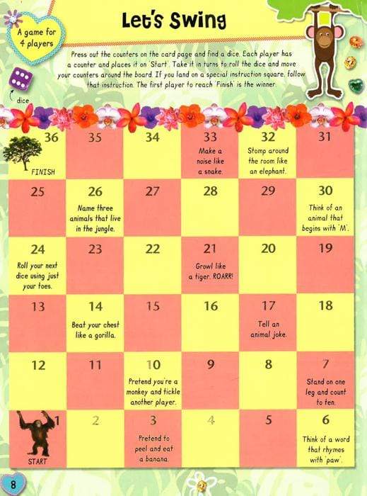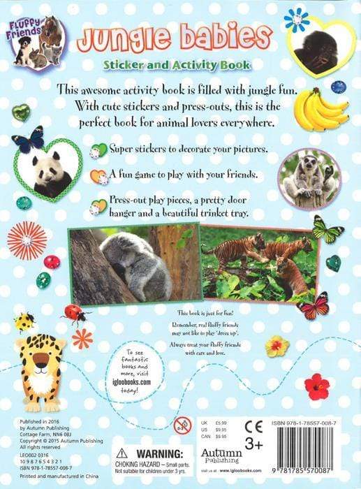 This awesome activity book is filled with jungle fun. With cute stickers and press-outs, this is the perfect book for animal lovers everywhere. - Super stickers to decorate your pictures. - A fun game to play with your friends. - Press-out play pieces, a pretty door hanger and a beautiful trinket tray.
