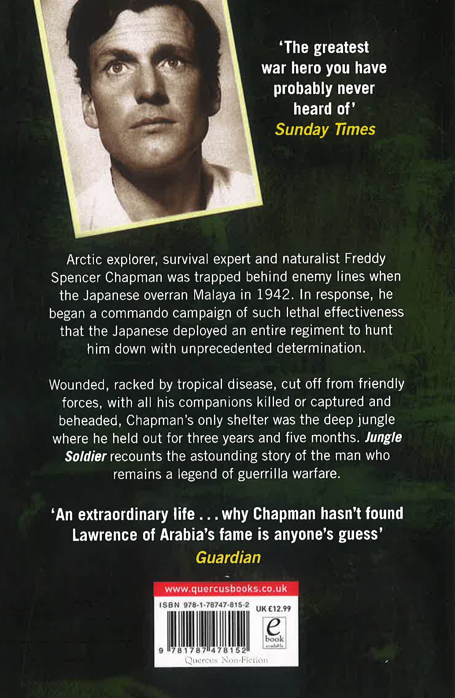 Arctic explorer, survival expert and naturalist Freddy Spencer Chapman was trapped behind enemy lines when the Japanese overran Malaya in 1942. His response was to begin a commando campaign of such lethal effectiveness that the Japanese deployed an entire regiment to hunt him down, believing that a 200-strong guerrilla army was responsible for the wholesale destruction of their convoys. He was wounded, and racked by tropical disease. His companions were killed, or captured and then beheaded. Cut off from friendly forces, his only shelter the deep jungle, Chapman held out for three years and five months. Jungle Soldier recounts the thrilling and unforgettable adventures of the North country orphan who survived against all odds to become a legend of guerrilla warfare.