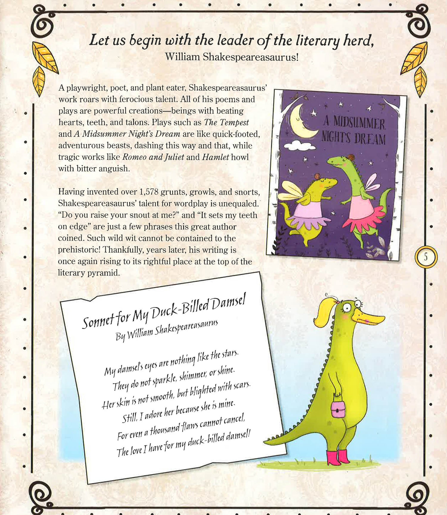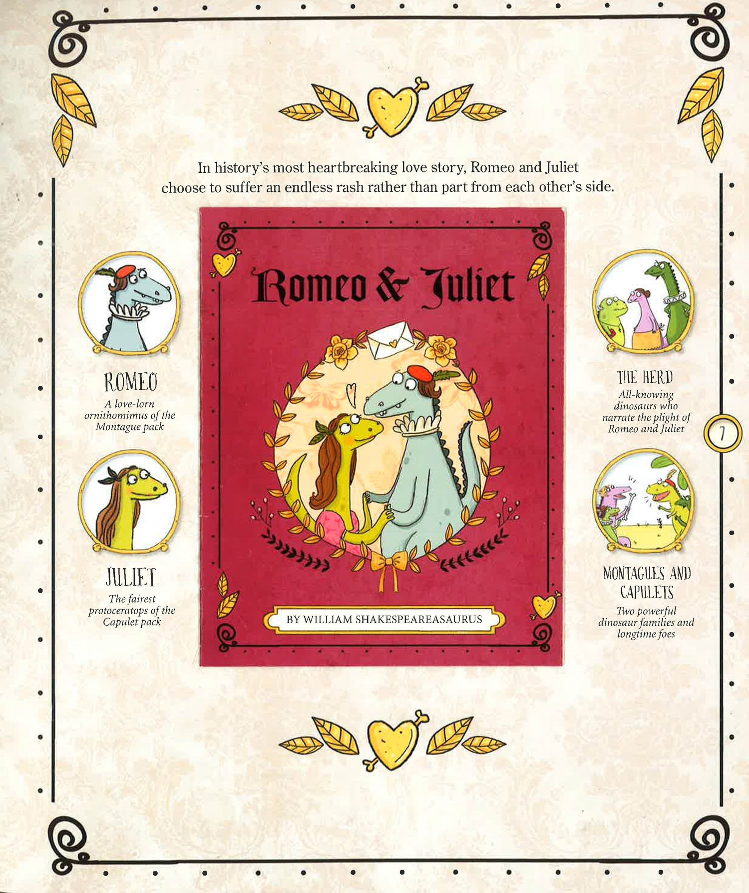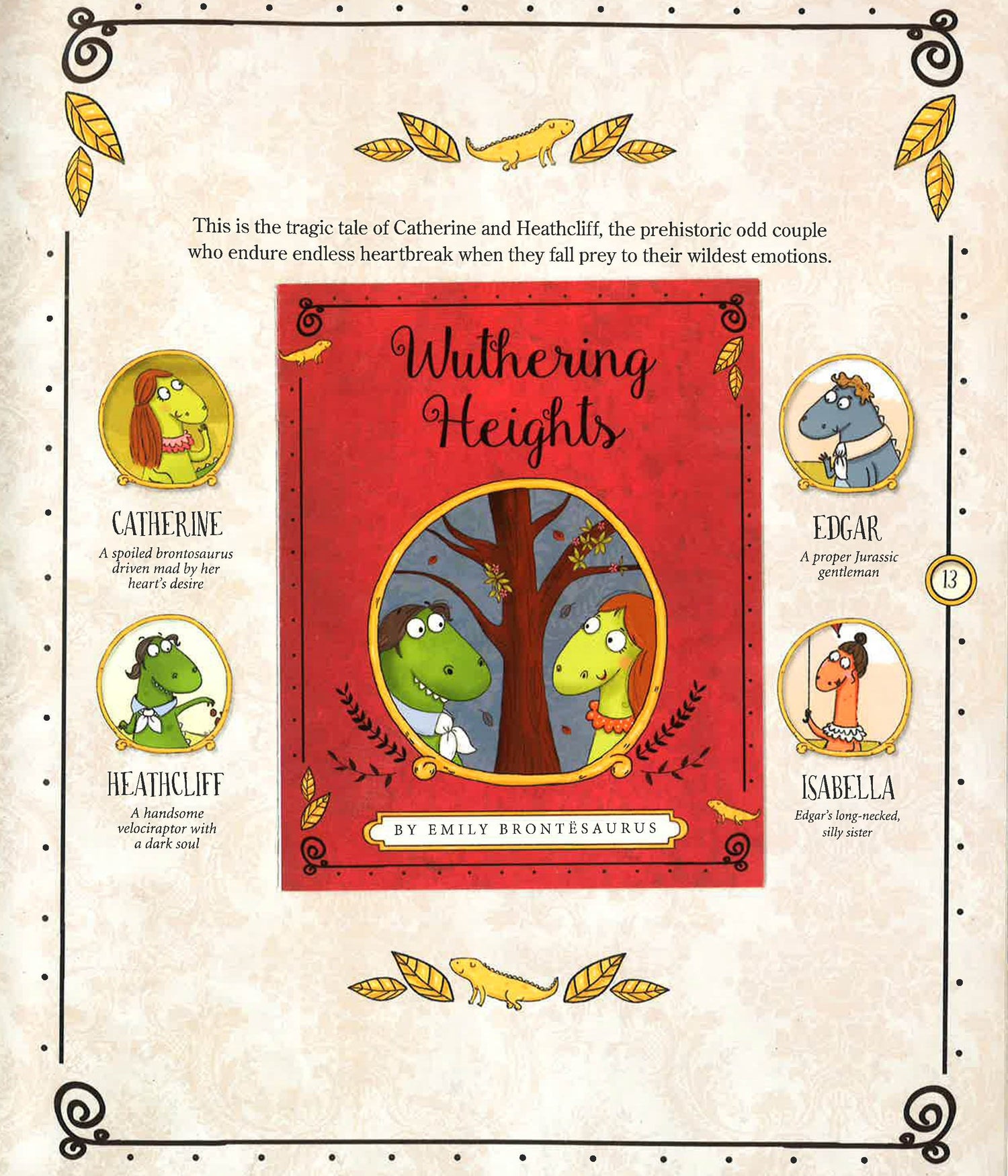 Romeo and Juliet by William Shakespeareasaurus, a timeless play about forbidden romance.Wuthering Heights by Emily Brontesaurus, the tortured tale of doomed dinosaur love.The Raven by Edgar Allan Pterodactyl, a ghoulish poem with a haunting ending.The Adventures of Tom Sawyer by Mark Twainceratops, the story of a mischievous young dinosaur growing up in the Cretaceous age.A Tale of Two Cities by Charles Dickensodocus, a prehistoric epic about love, war, and sacrifice.Pride and Prejudice by Jane Austenlovenator, a clever critique of dinosaur manners disguised as a love story.