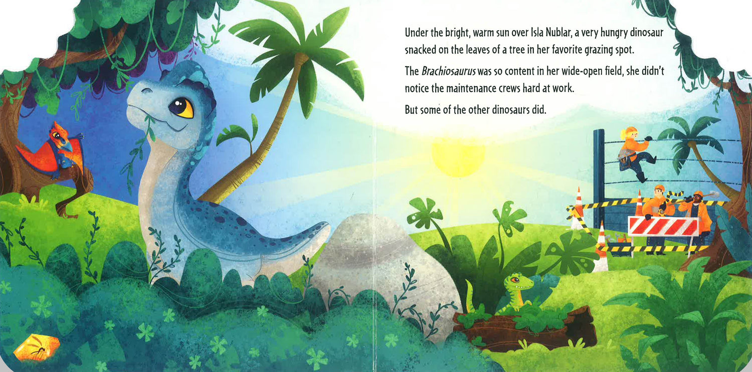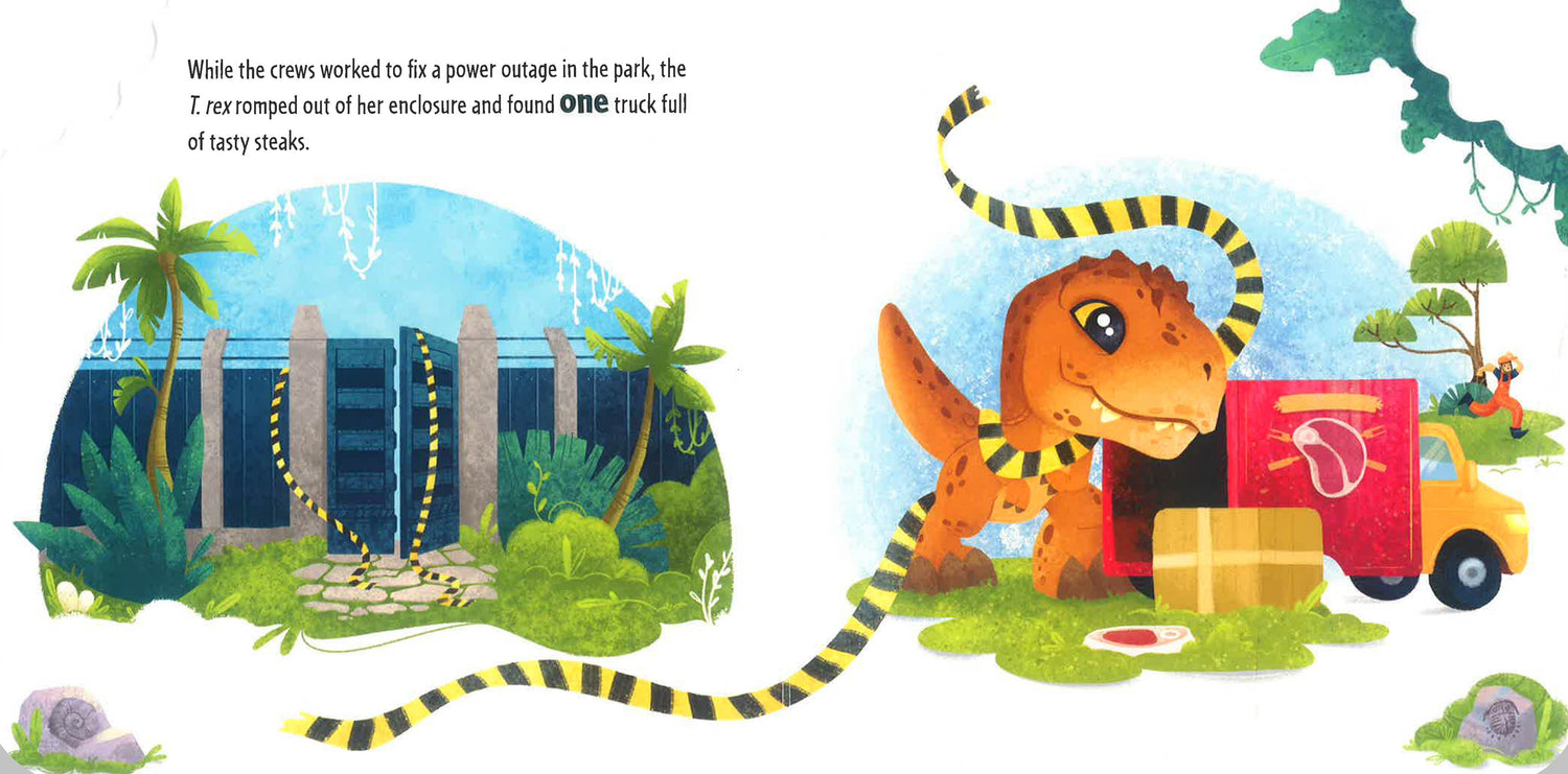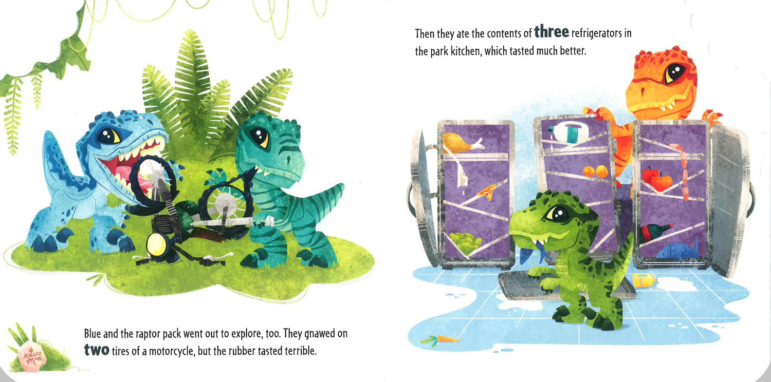 Follow the adventures of Jurassic World’s dinos as they eat their way across the island. The story begins with a very hungry herbivore gleefully chomping on foliage. Soon, the other dinos escape containment and playfully rampage through the park eating all manner of strange things.