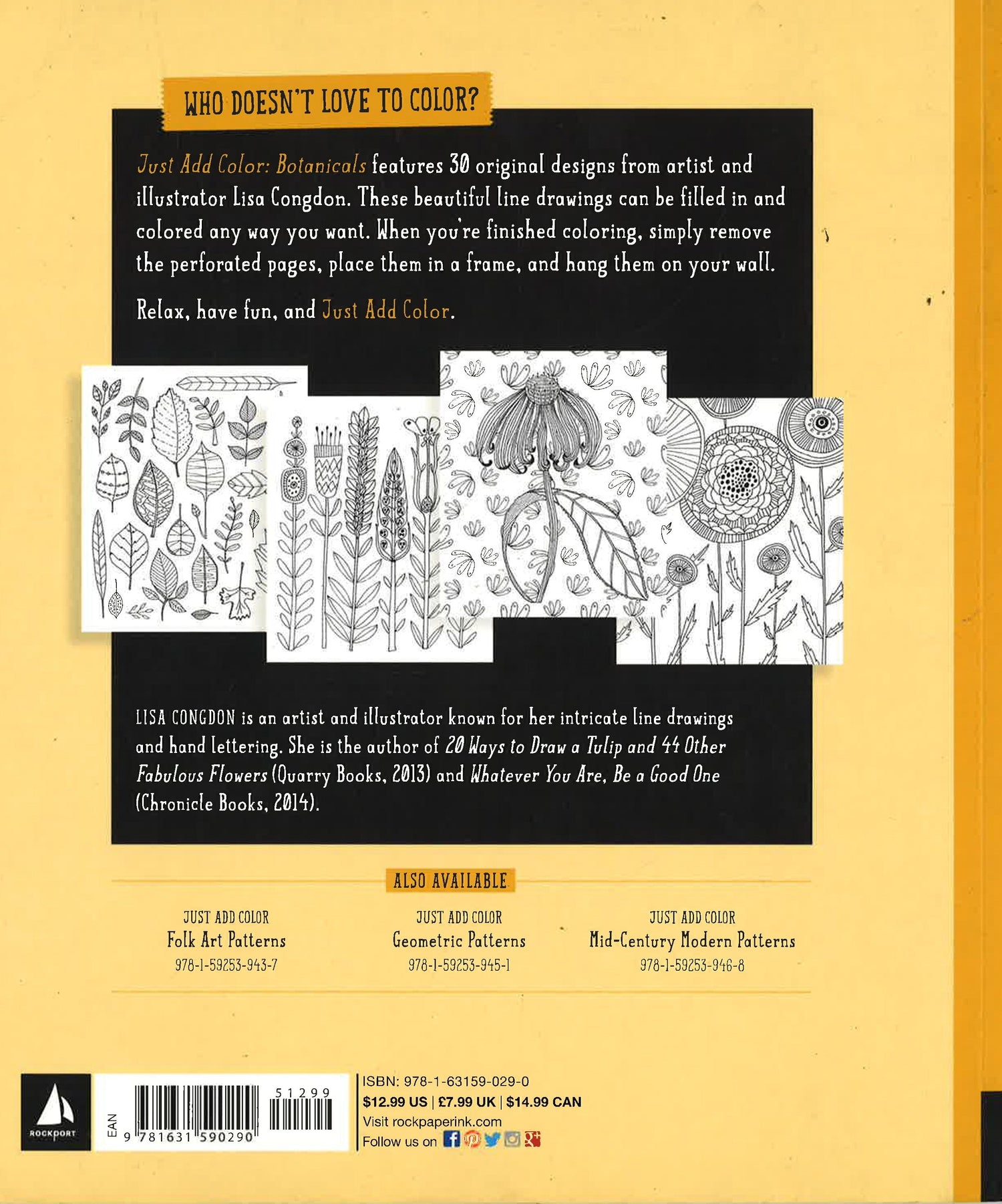 Who doesn't love to color? As an adult, now that you can stay in the lines, you only need to think about what color to use! Rockport Publishers presents a series of grown-up coloring books for art and design lovers. Just Add Color: Botanicals includes 30 original designs from artist and illustrator Lisa Congdon. Each book contains 64 perforated pages to make it easy to share, frame and hang your artwork. You'll be inspired by the sumptuous artwork in this book, and the use of color is endless. Relax, have fun, and Just Add Color.