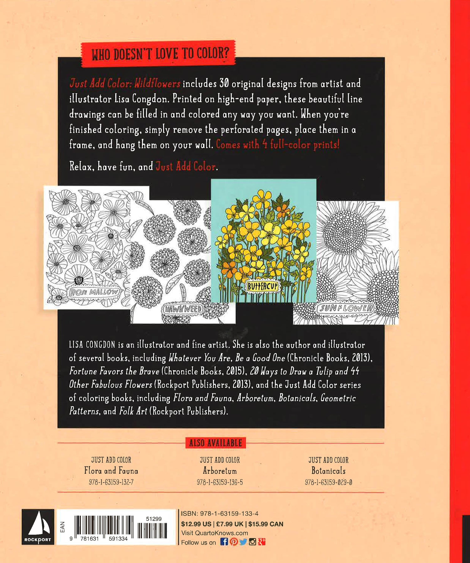 Who doesn't love to color? As an adult, now that you can stay in the lines, you only need to think about what color to use! Rockport Publishers presents a series of grown-up coloring books for art and design lovers. Just Add Color: Wildflowers includes 30 original designs from artist and illustrator Lisa Congdon. From coneflowers and poppies to foxgloves and zinnias, you'll find 64 perforated pages of beautiful wildflowers to color and frame. You'll be inspired by the sumptuous artwork in this book, and the use of color is endless. Relax, have fun, and Just Add Color.