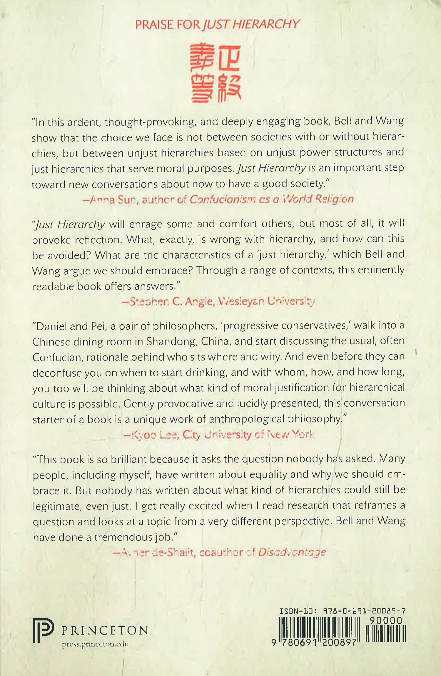 All complex and large-scale societies are organized along certain hierarchies, but the concept of hierarchy has become almost taboo in the modern world. Just Hierarchy contends that this stigma is a mistake. In fact, as Daniel Bell and Wang Pei show, it is neither possible nor advisable to do away with social hierarchies. Drawing their arguments from Chinese thought and culture as well as other philosophies and traditions, Bell and Wang ask which forms of hierarchy are justified and how these can serve morally desirable goals. They look at ways of promoting just forms of hierarchy while minimizing the influence of unjust ones, such as those based on race, sex, or caste.