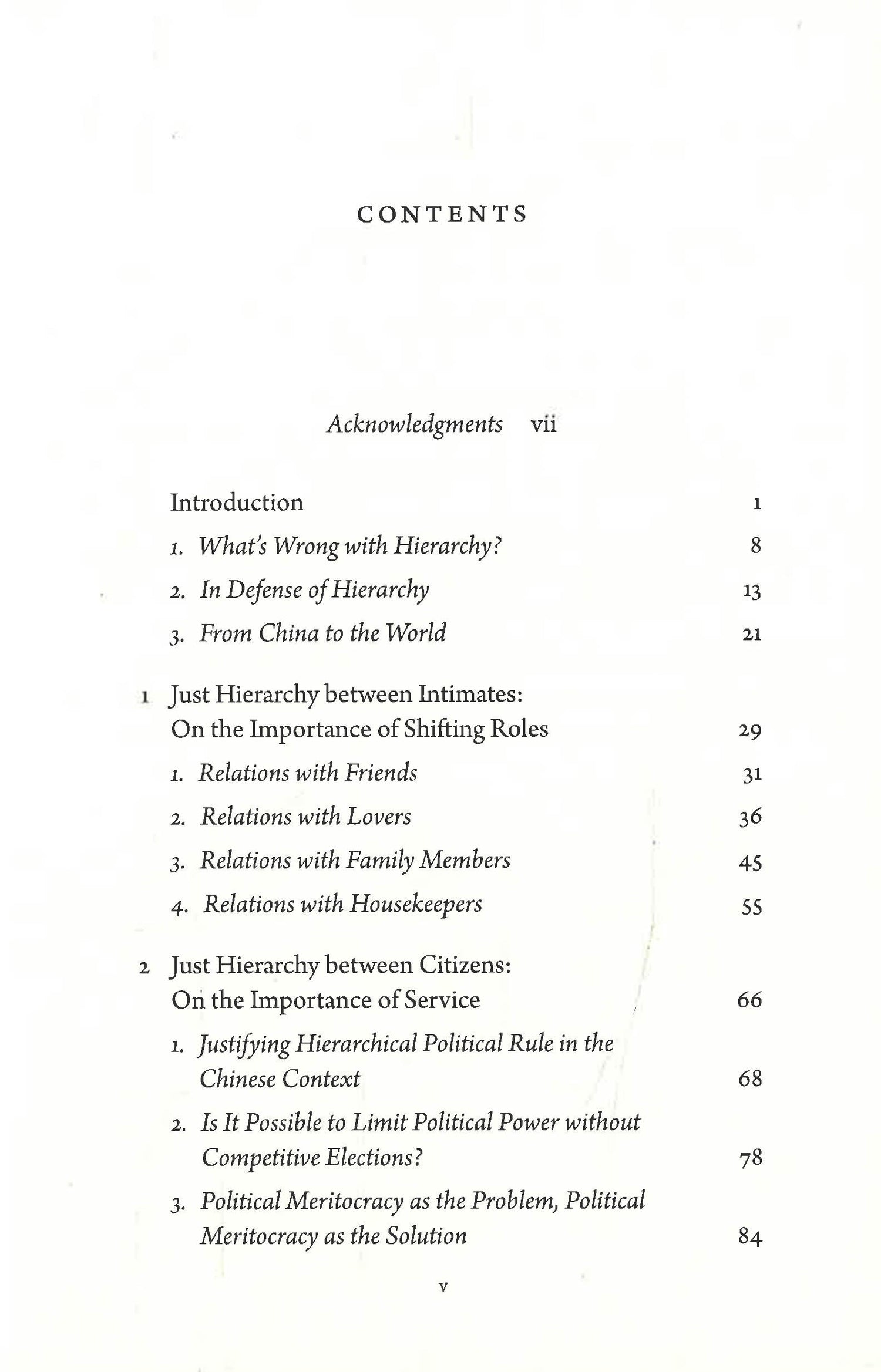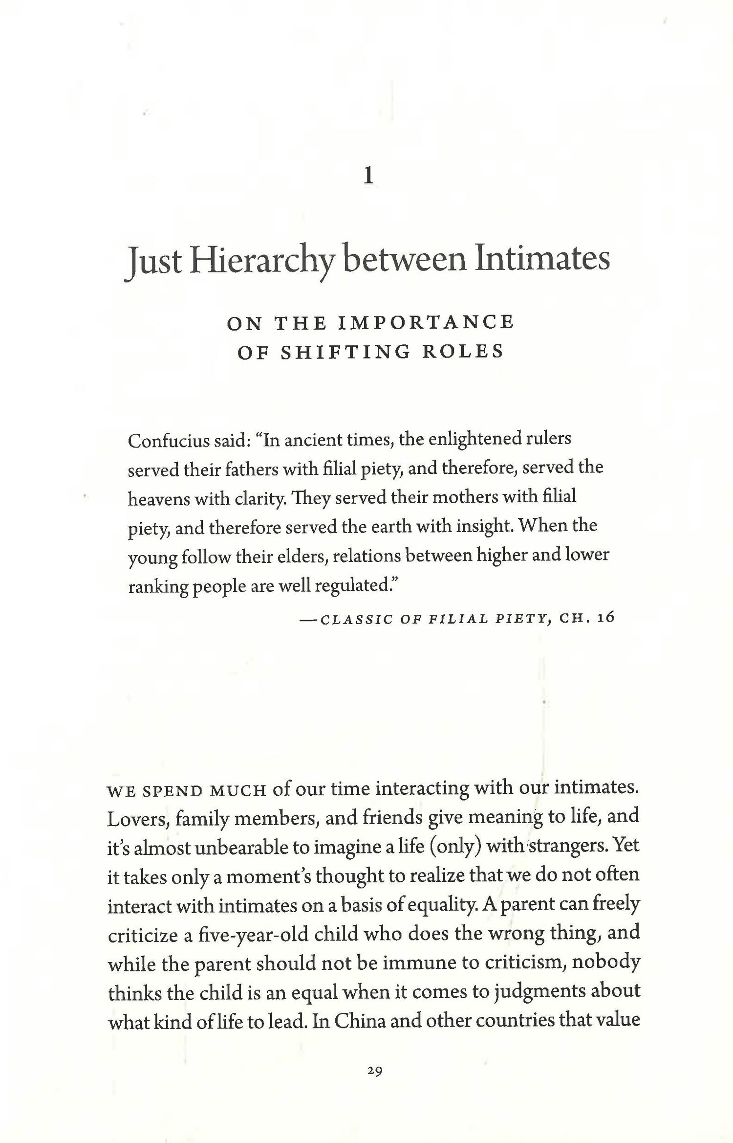Which hierarchical relations are morally justified and why? Bell and Wang argue that it depends on the nature of the social relation and context. Different hierarchical principles ought to govern different kinds of social relations: what justifies hierarchy among intimates is different from what justifies hierarchy among citizens, countries, humans and animals, and humans and intelligent machines. Morally justified hierarchies can and should govern different spheres of our social lives, though these will be very different from the unjust hierarchies that have governed us in the past.