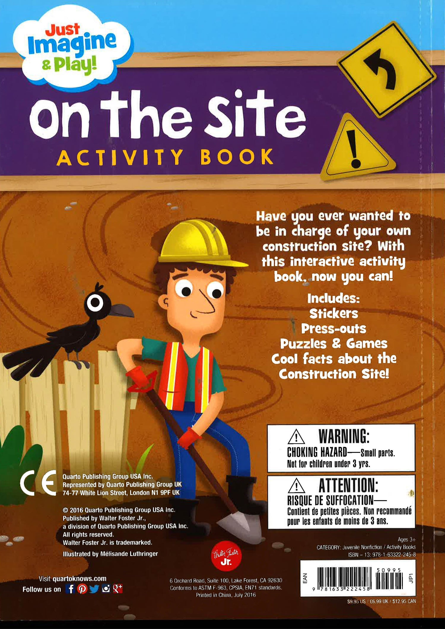 Just Imagine & Play! On the SiteJust Imagine & Play! On the Site is an activity book set on a bustling construction site! Kids will love the facts, games and fold-out construction site scene. Rev the engine on your earth movers and bulldozers because it's construction time! Just Imagine & Play! On the Site is your chance to be in charge of your own construction site. With this awesome activity book, you'll be able to: Learn fun facts about construction equipmentColor some construction scenesComplete mazesFinish dot-to-dots to reveal the tools and equipmentPlay tic-tac-toeSpot the difference between the toolboxesPlay the memory gamePlay a board gameLearn to draw a safety cone, a wrench, and a building. In addition to the fun activities, use your imagination to play on the construction site! Unfold this book, and there's the stand-up play scene. Customize your construction site with the reusable stickers and punch-out, stand-up characters, and you're ready for action. With your fun scene, you can play with the construction workers, vehicles, and tools! What kinds of things you build on your construction site is up to you! Use dump trucks, excavators and bulldozers to move dirt and build houses and skyscrapers. It's never a dull day on the construction site!Just Imagine & Play! On the Site includes cool facts about construction site tools and vehicles, puzzles, and games, plus punch-out characters, reusable stickers, and a fold-out construction site scene.