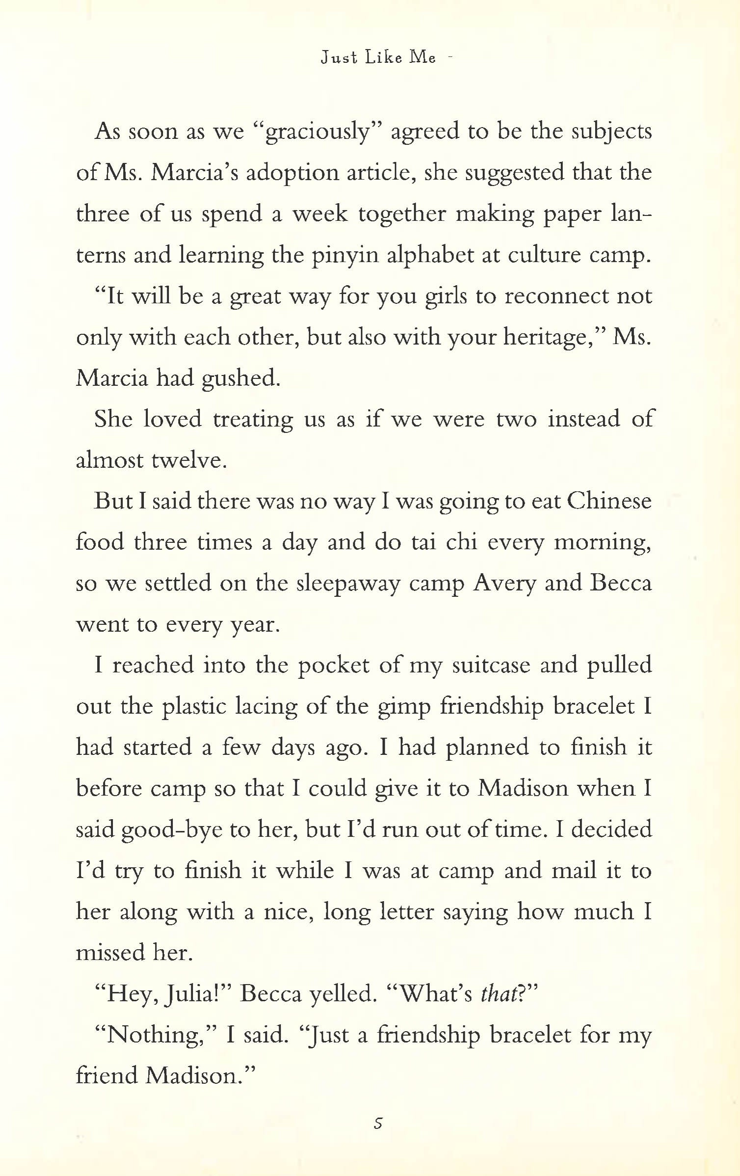 In the tradition of Every Soul a Star and Inside Out & Back Again, Just Like Me is a funny, uplifting summer camp story about unlikely friendships and finding your place in the world from the award-winning author of This Journal Belongs to Ratchet. Who eats Cheetos with chopsticks?! Avery and Becca, my "Chinese Sisters," that's who. We're not really sisters-we were just adopted from the same orphanage. And we're nothing alike. They like egg rolls, and I like pizza. They're wave around Chinese fans, and I pretend like I don't know them. Which is not easy since we're all going to summer camp to "bond." (Thanks, Mom.) To make everything worse, we have to journal about our time at camp so the adoption agency can do some kind of "where are they now" newsletter. I'll tell you where I am: At Camp Little Big Lake in a cabin with five other girls who aren't getting along, competing for a camp trophy and losing (badly), wondering how I got here...and where I belong. Told through a mix of traditional narrative and journal entries, don't miss this funny, surprisingly sweet summer read! "A tender and honest story about a girl trying to find her place in the world, and the thread that connects us all." -Liesl Shurtliff, Author of Rump: The True Story of Rumpelstiltskin "A heartwarming story about the universal struggle of yearning to be an individual while longing to fit in."-Karen Harrington, author of Sure Kinds of Crazy