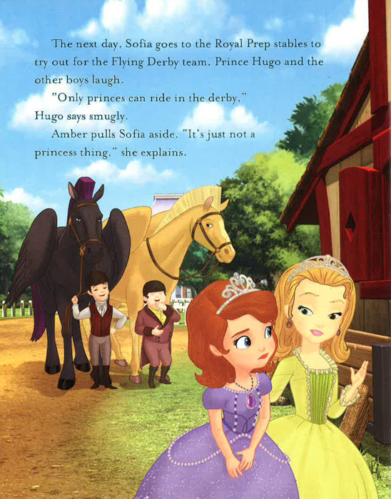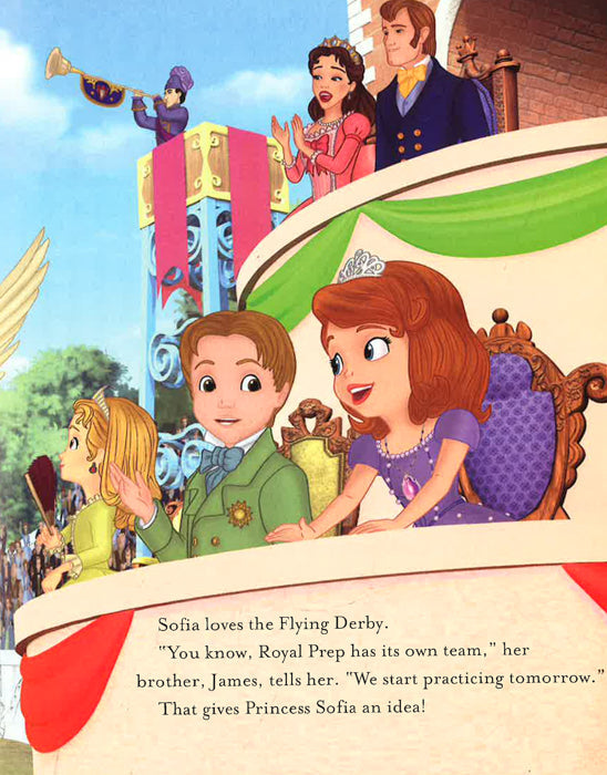 Sofia and her family are going to watch a flying derby race. During the race, James tells Sofia that Royal Prep has its own flying derby team and that the try-out race is next week. After the race is finished, Sofia decides to go to the try-out practice at Royal Prep tomorrow. Sofia arrives at the tryouts the next day but, to everyone's shock, Sofia wants to try out for the Flying Derby team herself instead of just watching but is told by Hugo that flying derby is only for princes, though she believes it could be. After being encouraged by Clover, Sofia announces that she will try out for the team. While her parents and Baileywick are supportive, Amber and James on the other hand are not. Amber still insists that princesses shouldn't be derby racers, while James is only worried that his little sister will make him a laughing stock. When he points out that Sofia doesn't even know how to ride a horse much less about being a Flying Derby racer, his father suggests that James could teach her, and at the same time get in some much-needed practice himself.