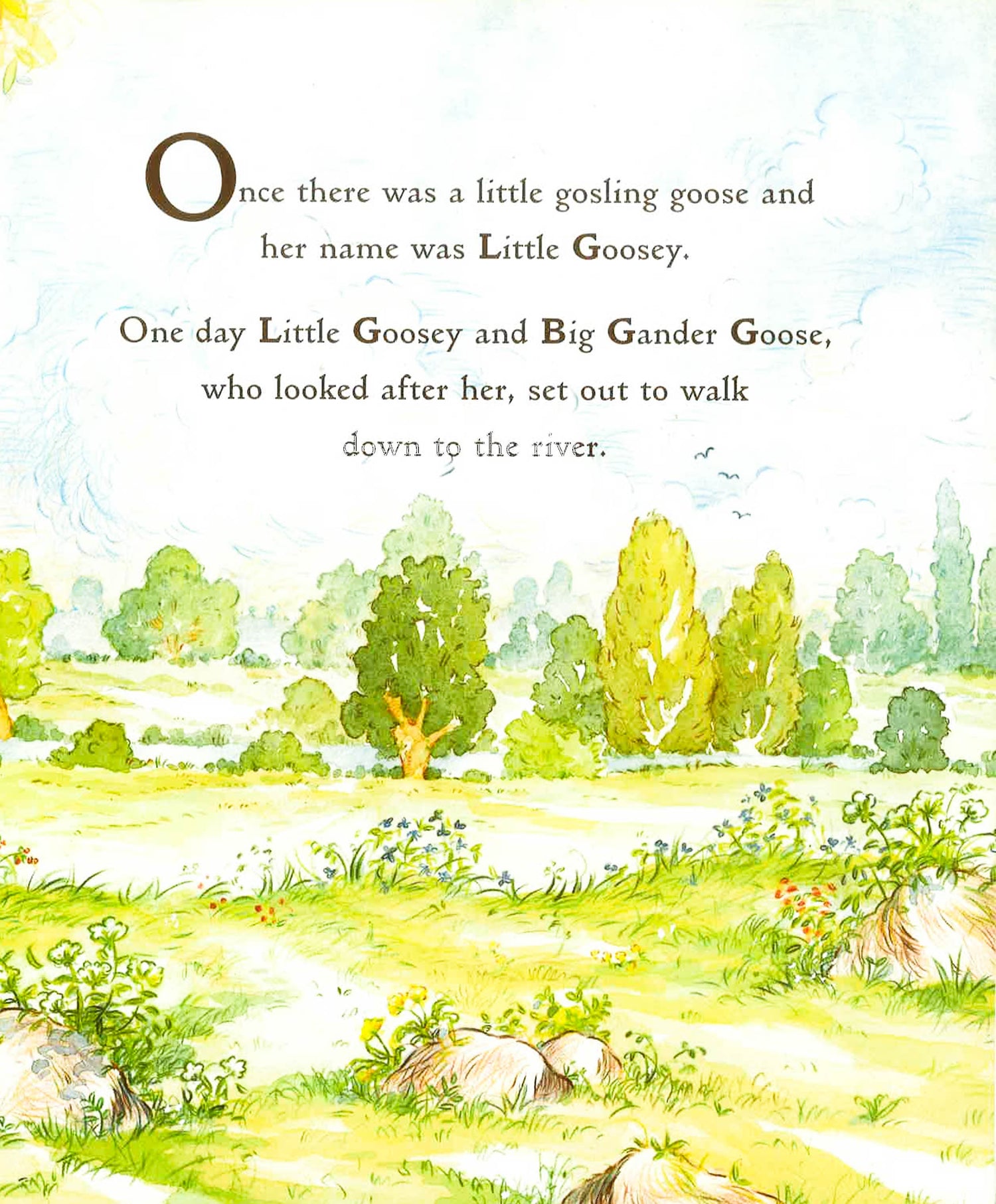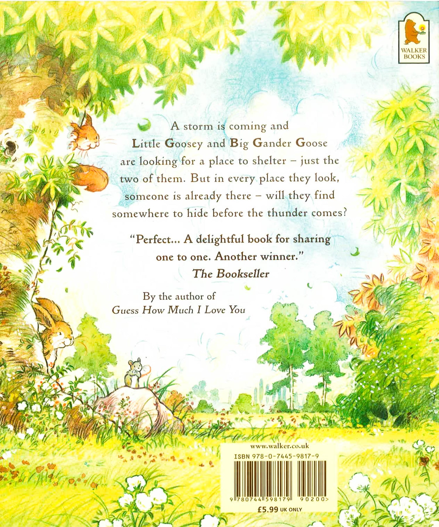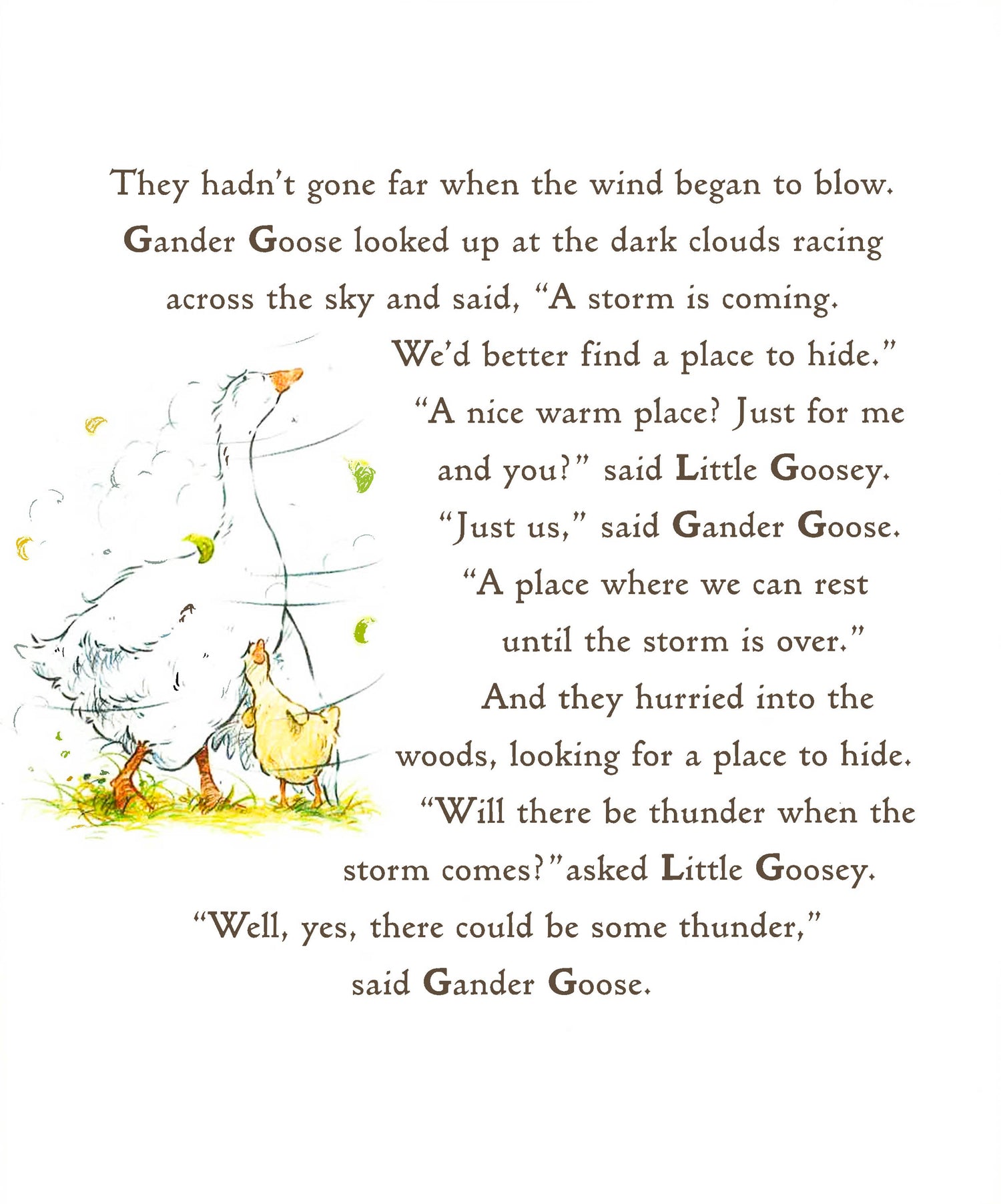Little Goosey and Big Gander Goose need a place to hide from the storm. But everywhere they look, someone else is there already. In the ditch there's a small greywhiskered mouse; among the roots of a tall tree is a squirrel; in the cave among the rocks is a rabbit...Little Goosey doesn't want to share. Will they ever find a place just for the two of them?