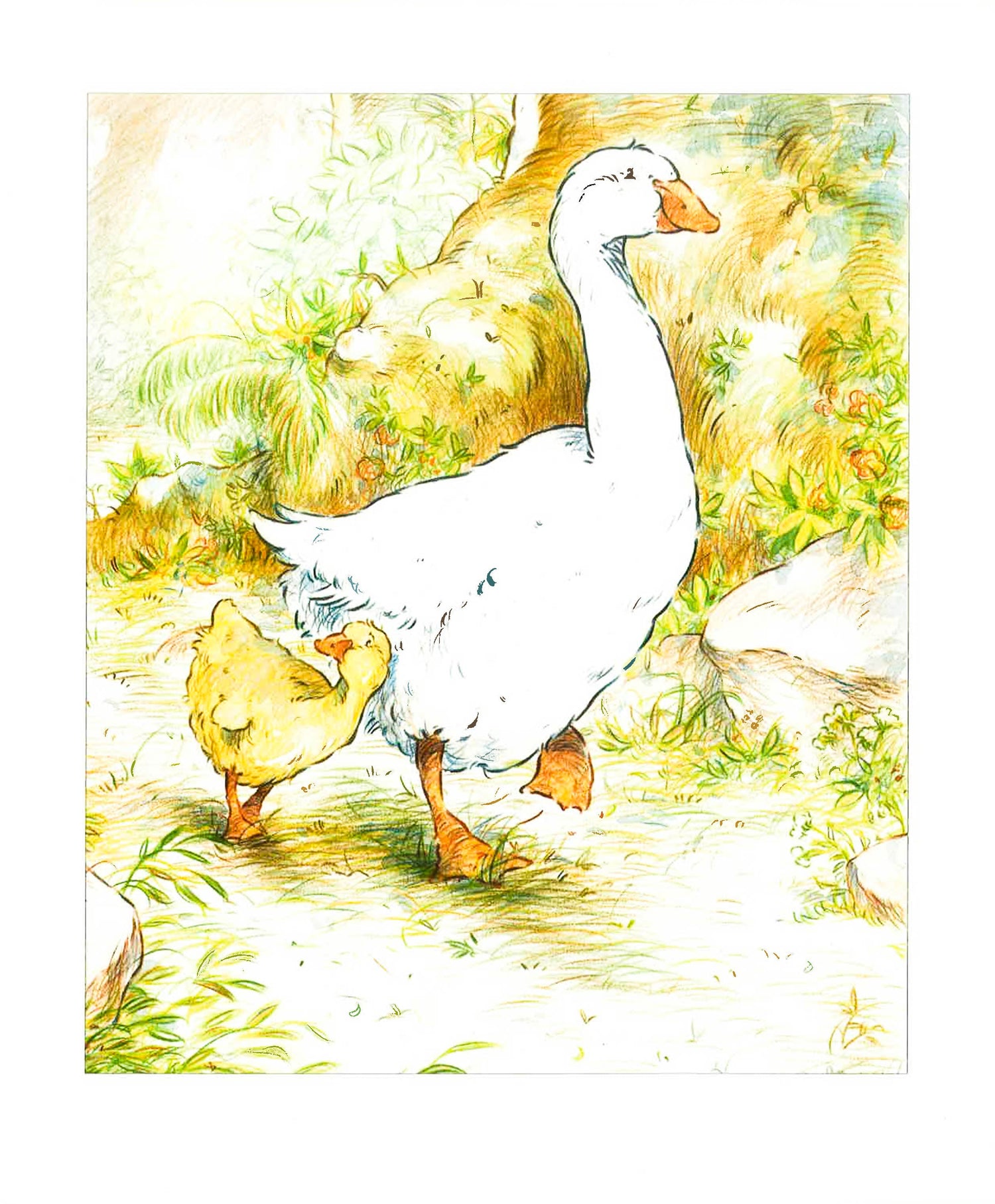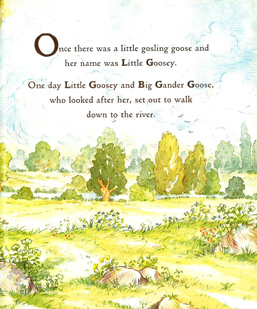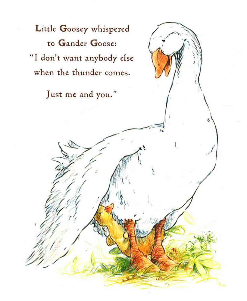 Little Goosey and Big Gander Goose need a place to hide from the storm. But everywhere they look, someone else is there already. In the ditch there's a small greywhiskered mouse; among the roots of a tall tree is a squirrel; in the cave among the rocks is a rabbit...Little Goosey doesn't want to share. Will they ever find a place just for the two of them?