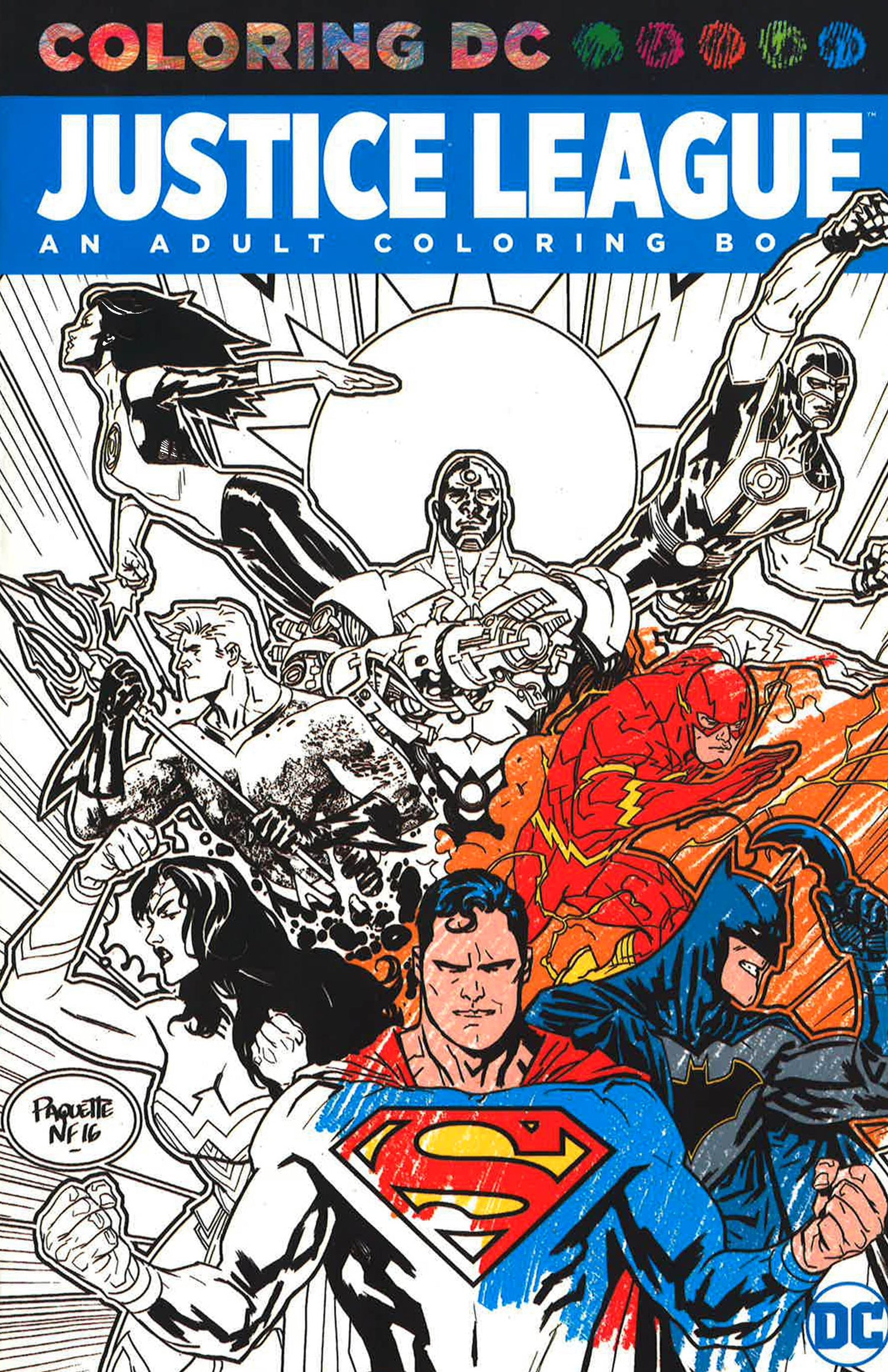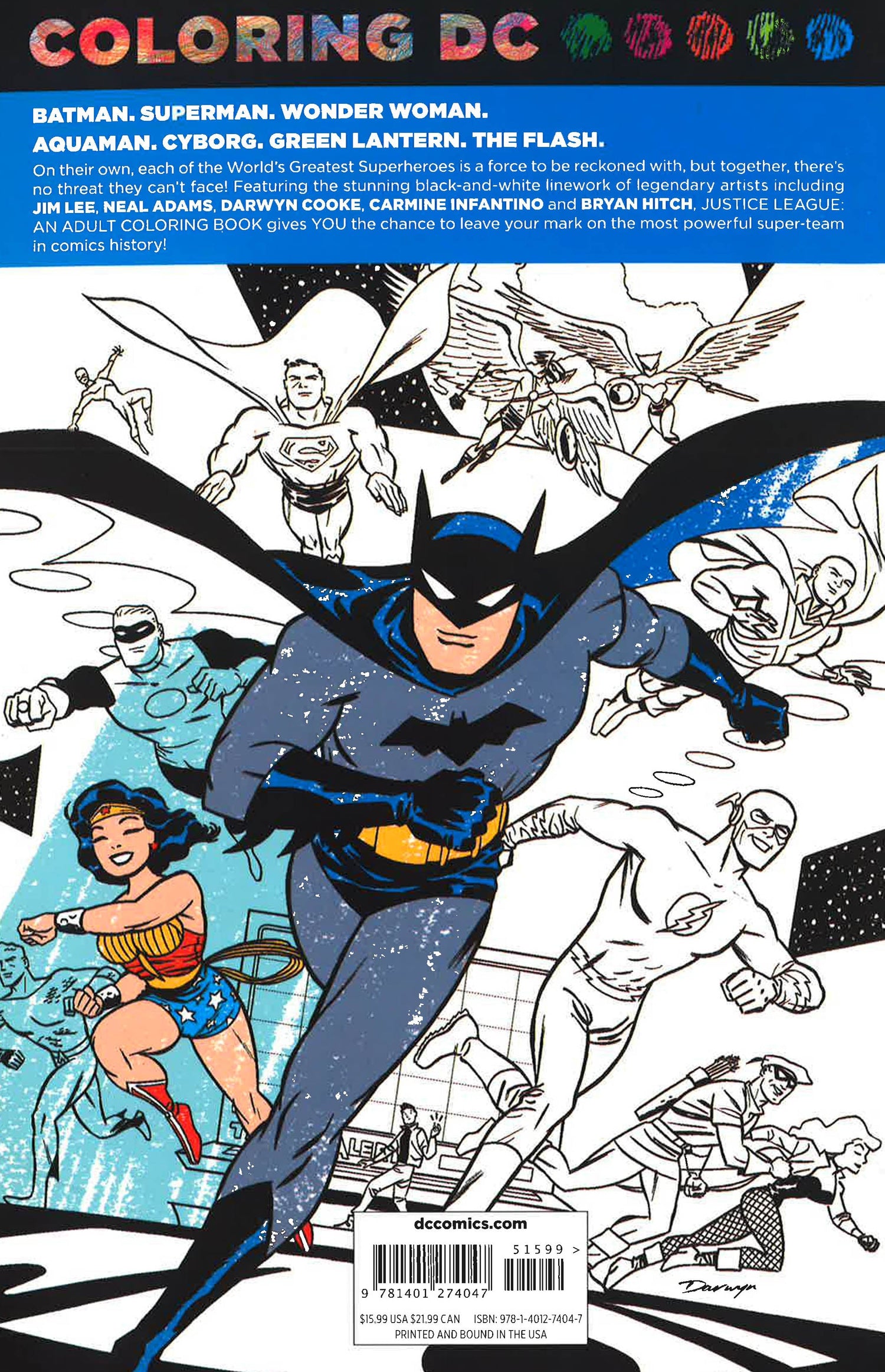 DC presents an adult coloring book featuring the World's Greatest Superheroes. Batman, Superman, Wonder Woman, Aquaman, Cyborg, Green Lantern and The Flash are the Justice League! On their own, each of the World's Greatest Superheroes is a force to be reckoned with, but together, there's no threat they can't face! Featuring the stunning black-and-white line work of legendary artists including Jim Lee, Neal Adams, Darwyn Cooke, Carmine Infantino and Bryan Hitch, JUSTICE LEAGUE: AN ADULT COLORING BOOK gives YOU the chance to leave your mark on the most powerful super-team in comics history!