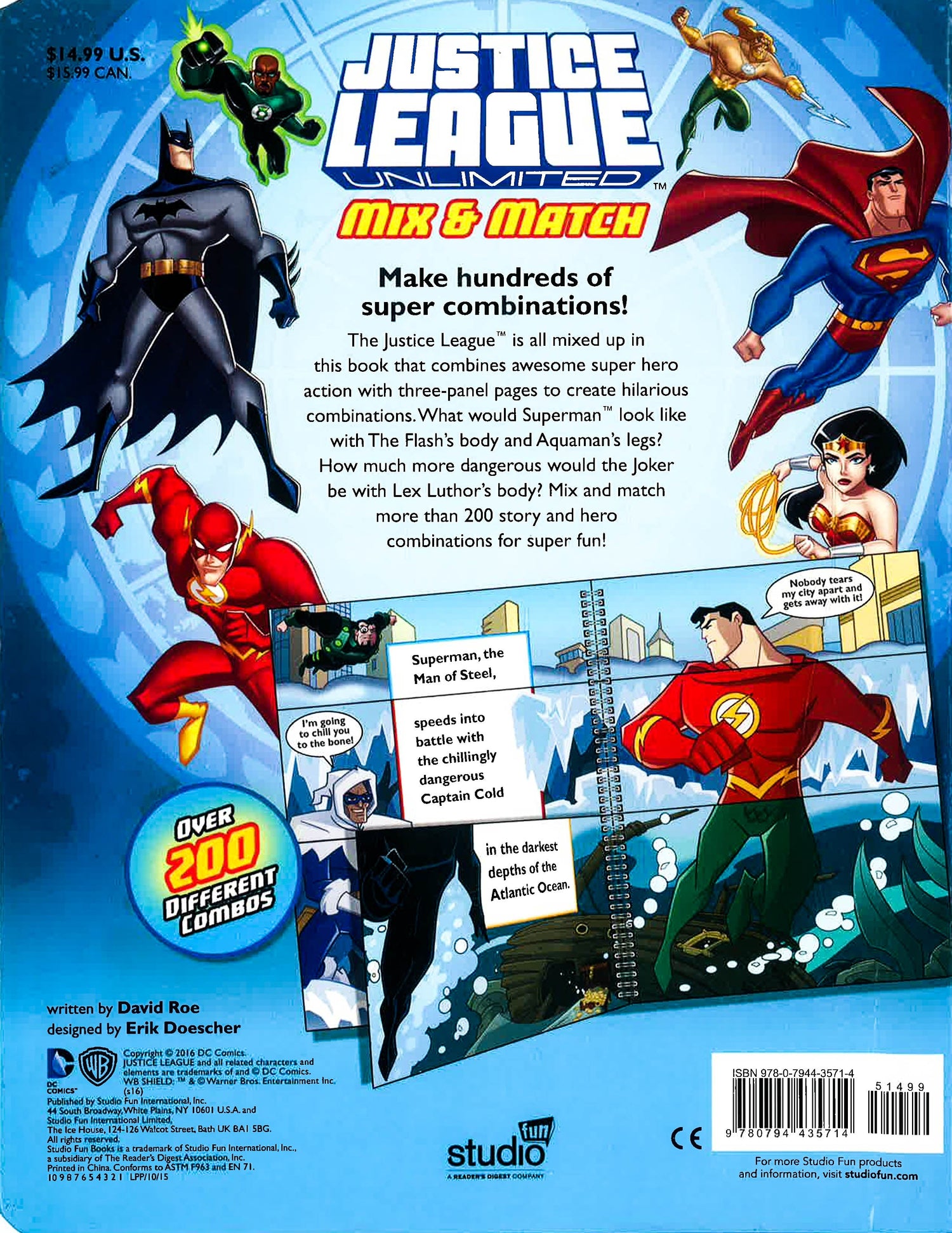 Mash-up and create over 200 combinations of some of your favorite DC Justice League heroes, including Superman and Batman! The Justice League is all mixed up in this book that combines awesome super hero action with 3-panel pages to create amazing combinations. What would Batman look like with Superman?s body and Aquaman?s legs? How much more dangerous would the Joker be with Lex Luthor?s body armor? Mix and match more than 200 story and Super Hero combinations for super fun!