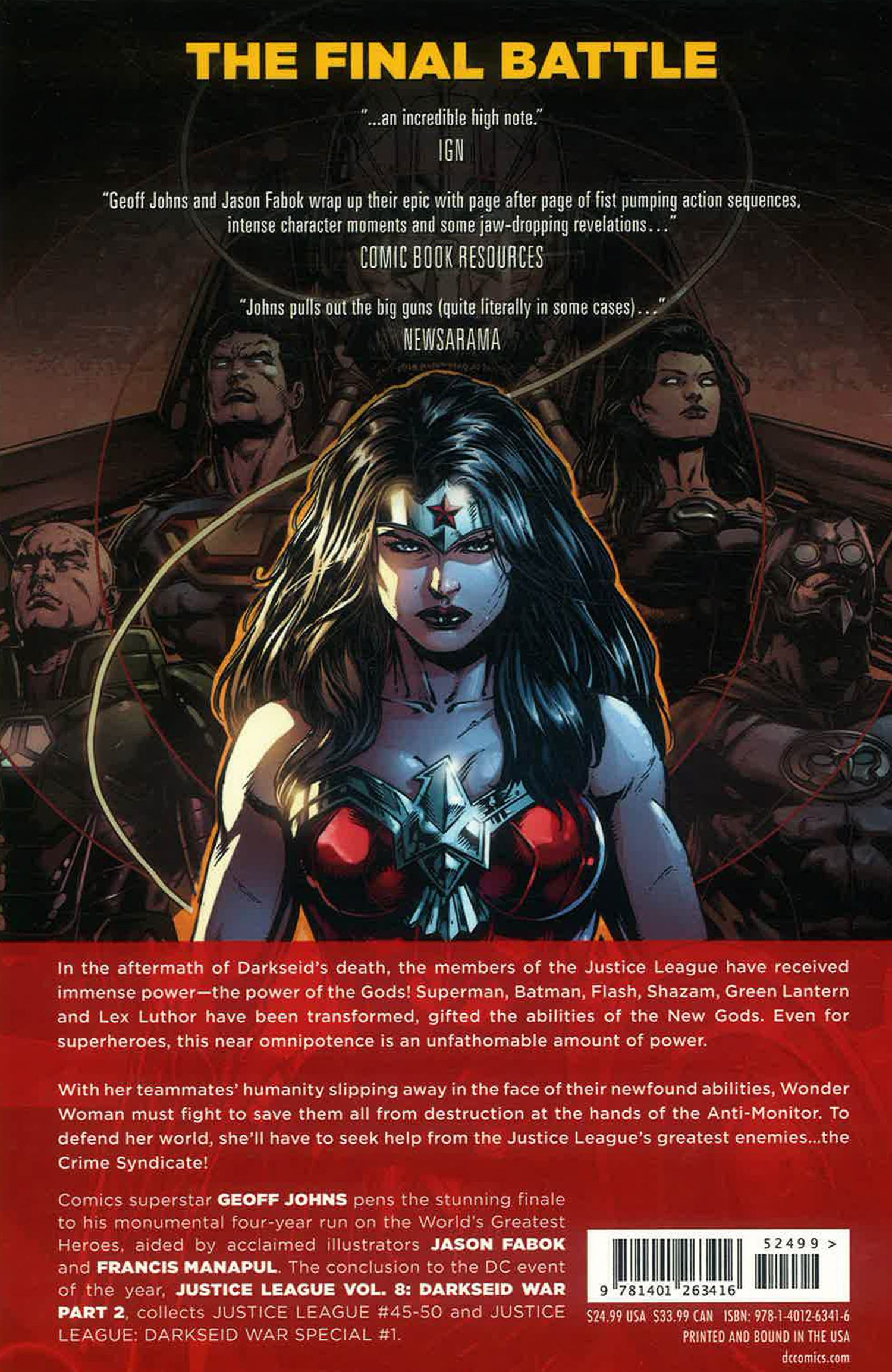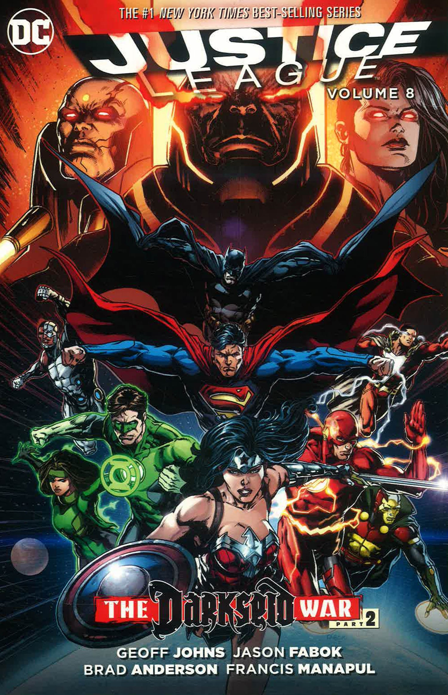 Comics superstars Geoff Johns, in his finale to his monumental run on the World’s Greatest Heroes—along with critically acclaimed illustrators Jason Fabok and Francis Manapul—presents the stunning conclusion to the superhero DC event of the year: JUSTICE LEAGUE VOL. 8: DARKSEID WAR PART 2. The darkness is here—are you ready? Collects JUSTICE LEAGUE #45-50 and JUSTICE LEAGUE: DARKSEID WAR SPECIAL #1.