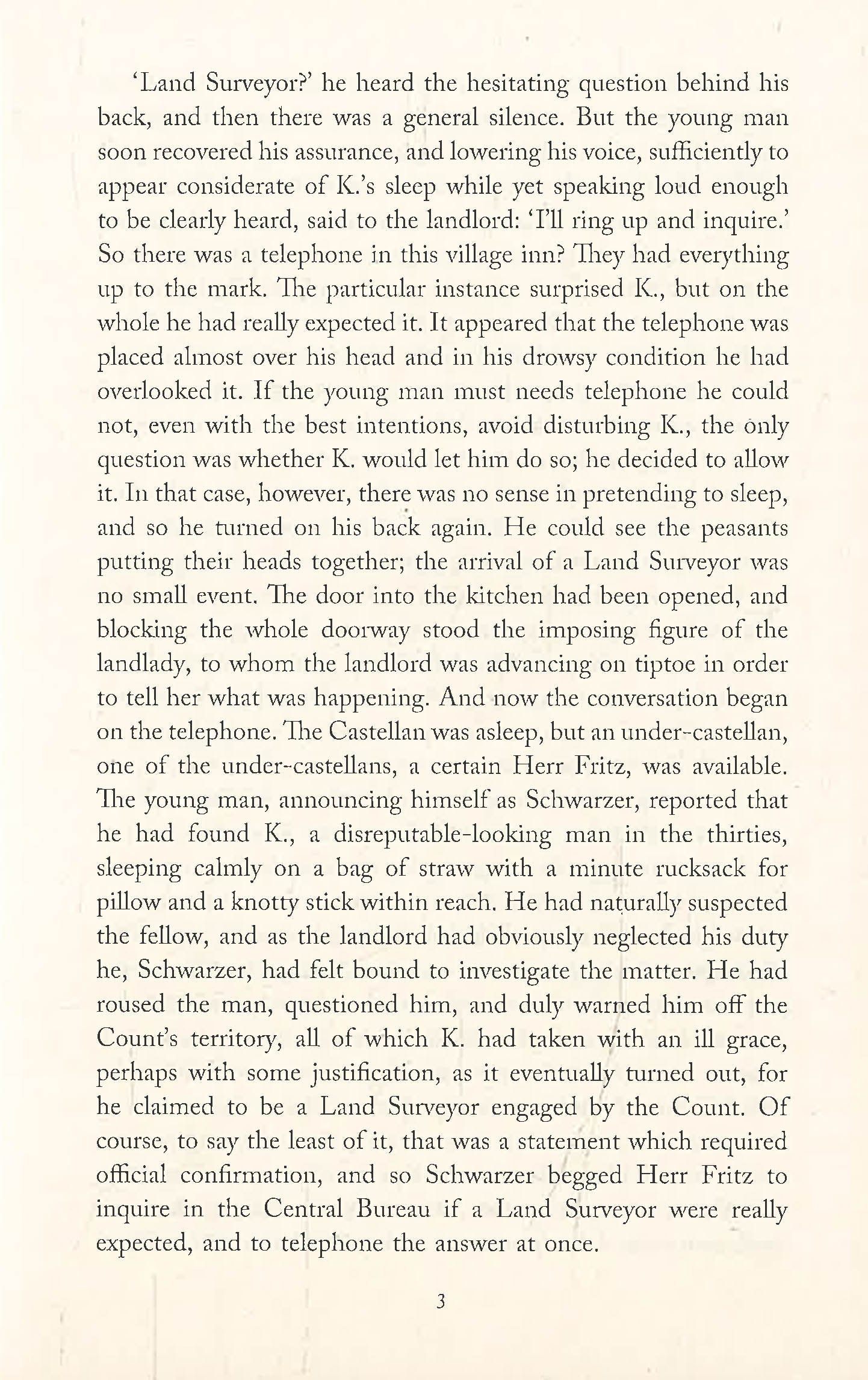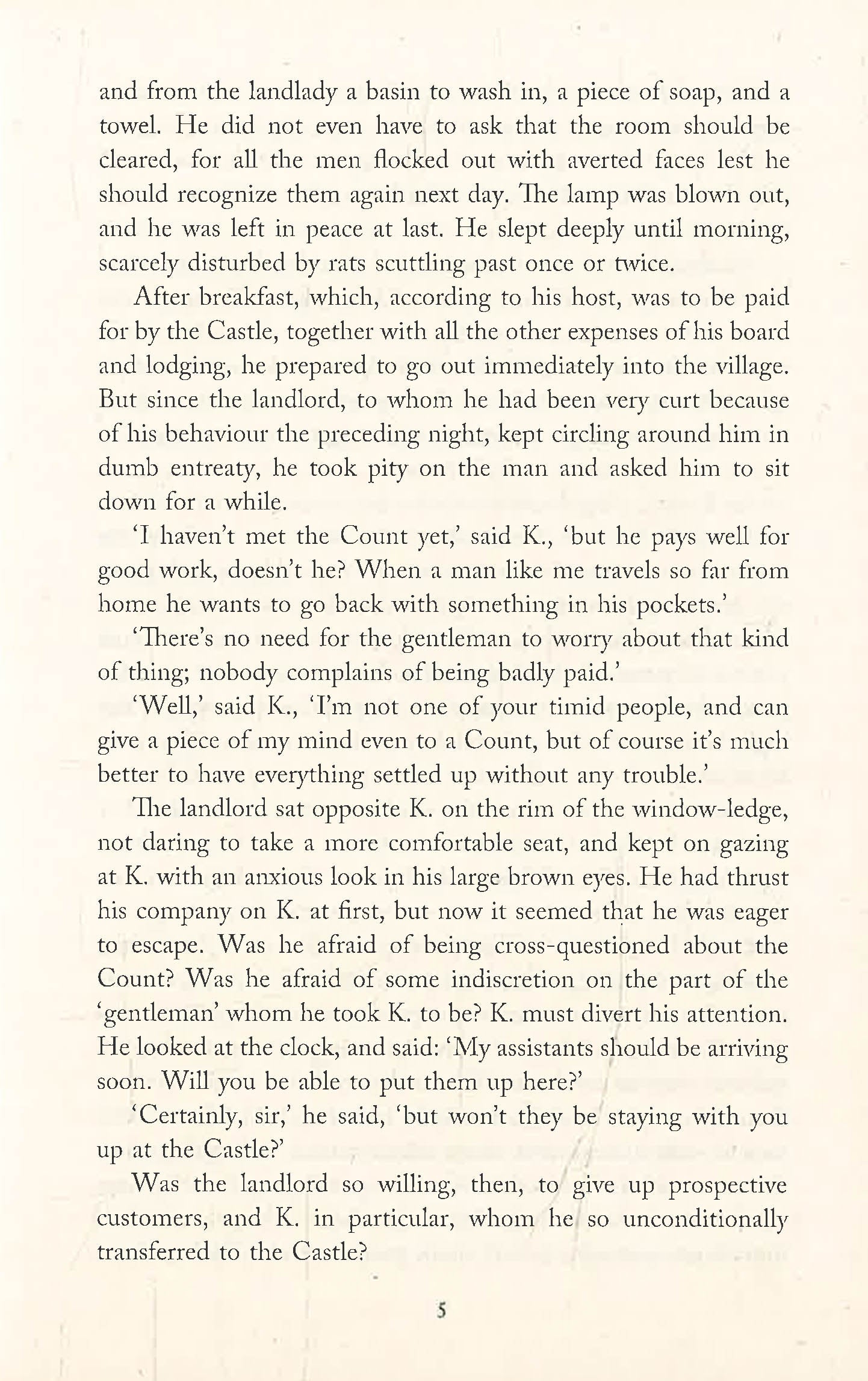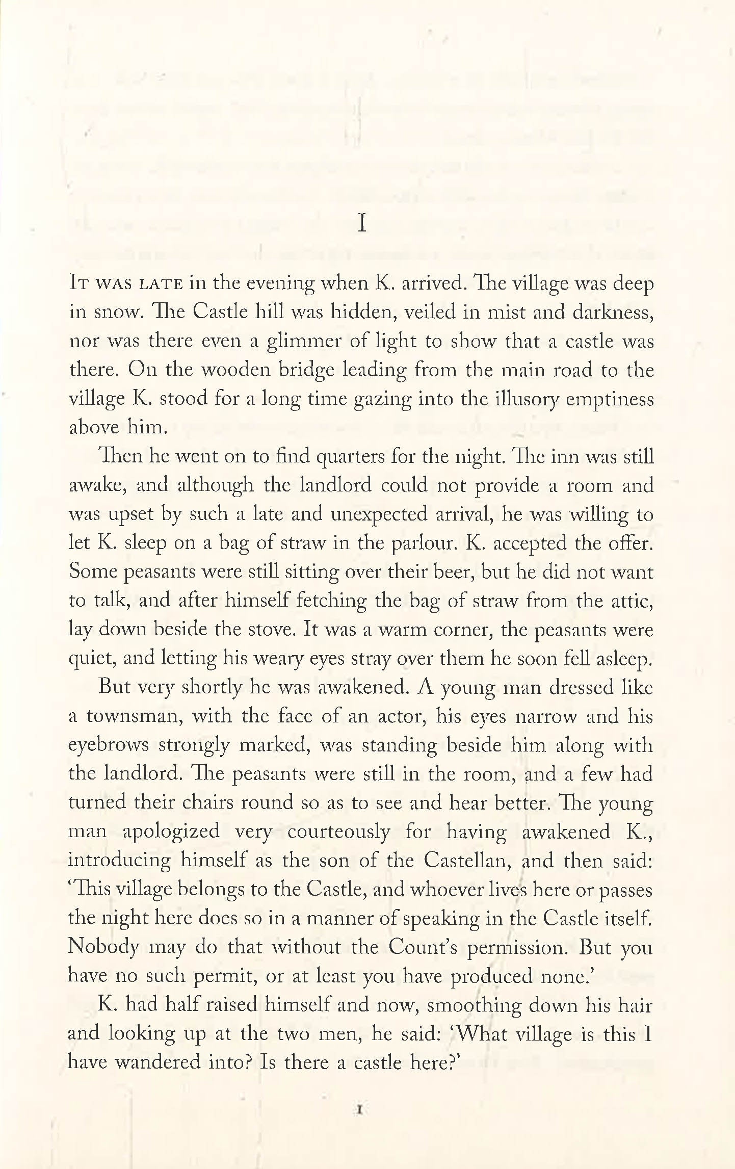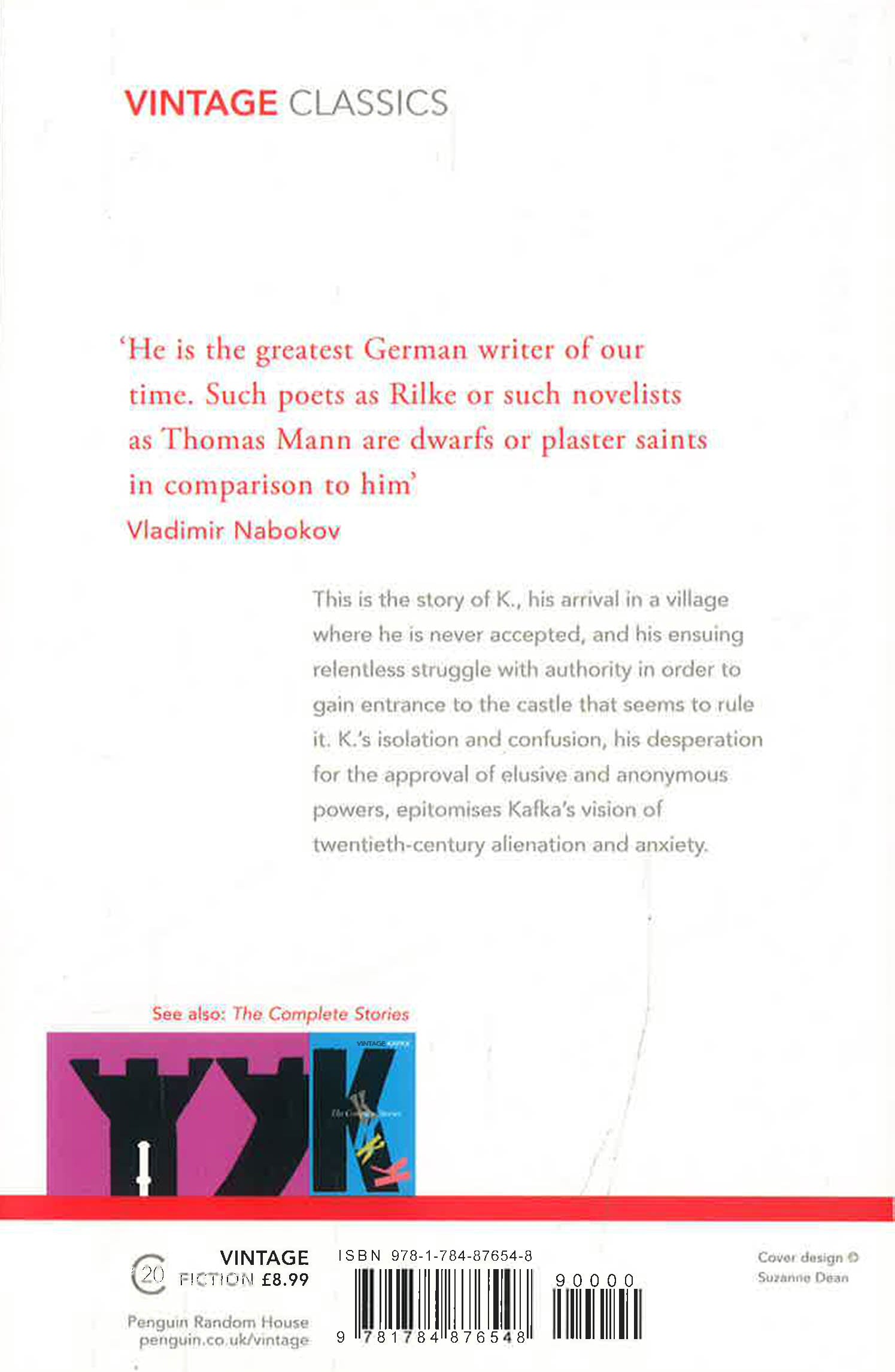 This is the story of K., his arrival in a village where he is never accepted, and his ensuing relentless struggle with authority in order to gain entrace to the castle that seems to rule it. K's isolation and confusion, his desperation for the approval of elusive and anonymous powers, epitomises Kafka's vision of twentieth-century alienation and anxiety.
