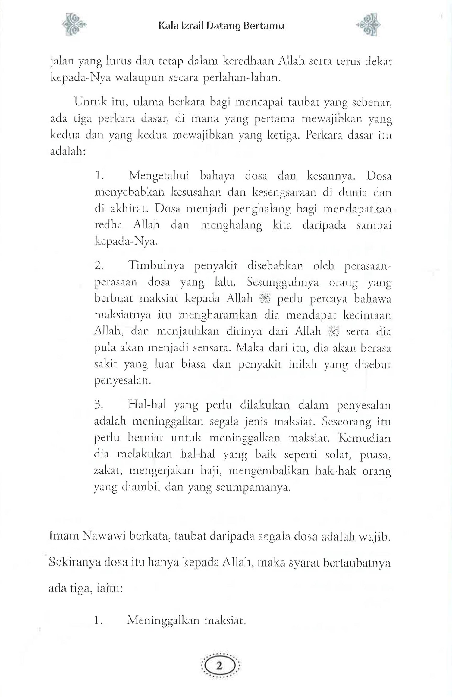 Panduan yang diberikan dalam buku ini bukan sekadar menjadikan kita tahu, malah membuatkan hati kita bersedia bagi menghadapi hari datangnya Izrail. Buku inilah yang perlu dimiliki untuk menjadi manusia yang bijak, iaitu manusia yang sentiasa mengingati mati.