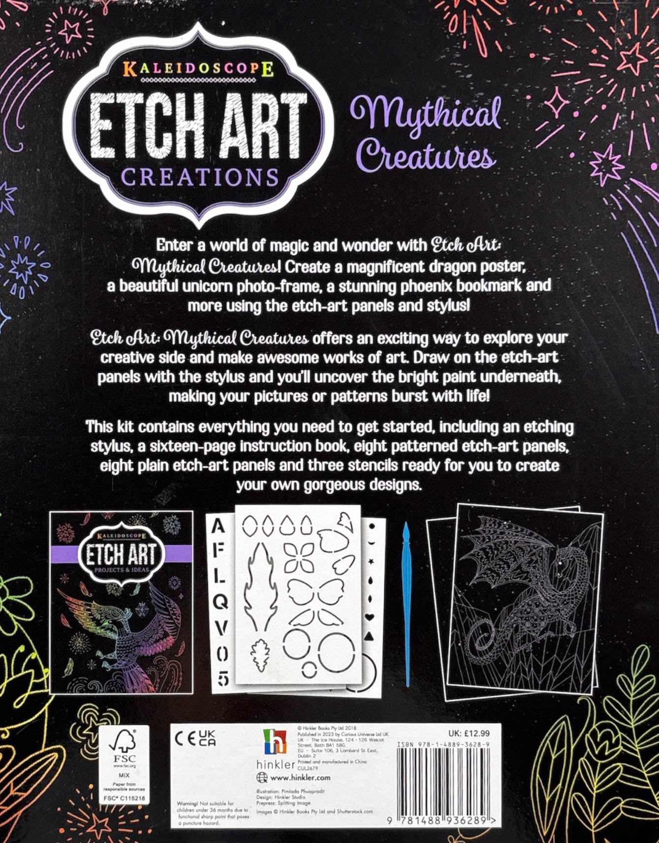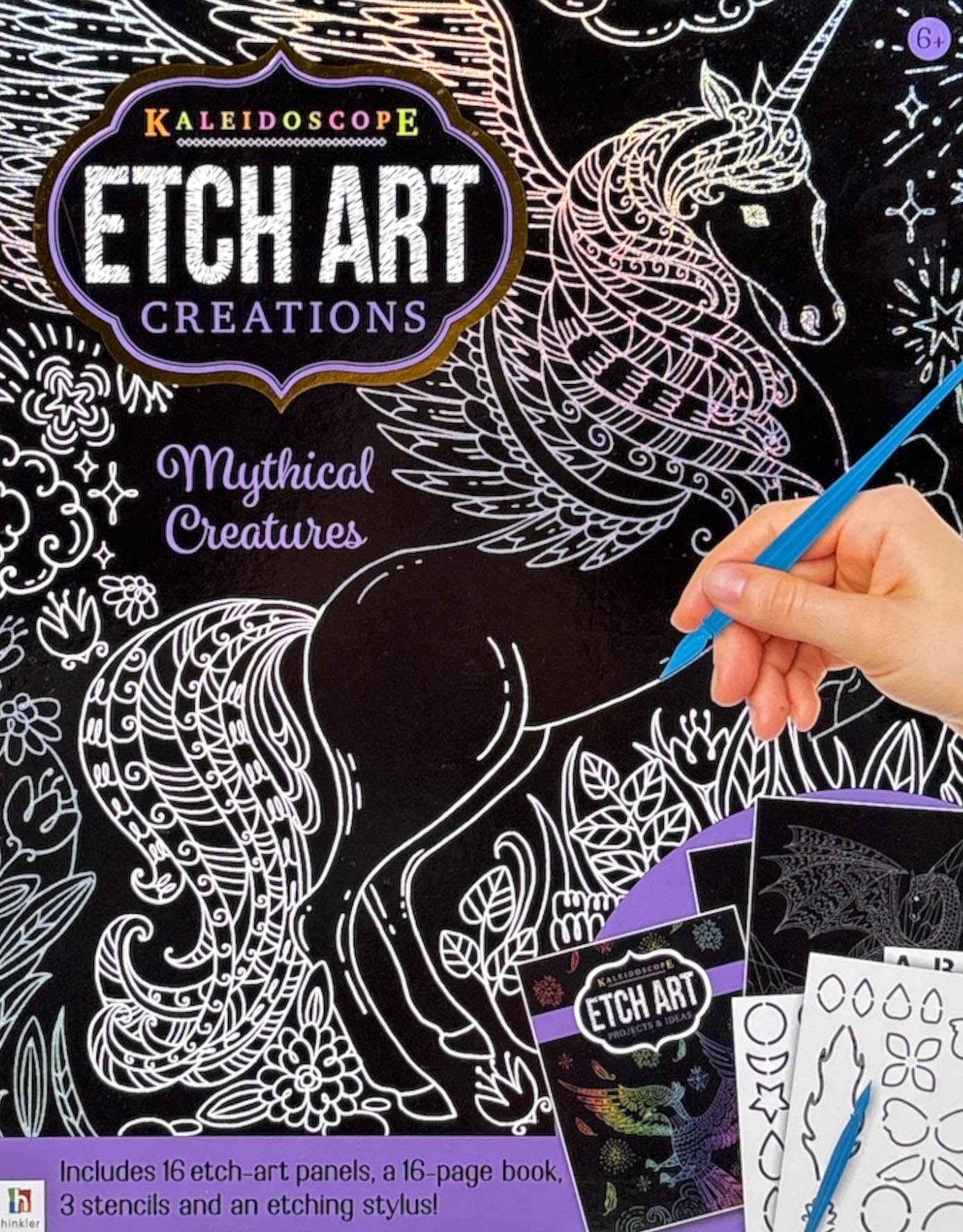 This kit contains everything you need to get started, including an etching stylus, a 16-page instruction book, eight patterned etch-art panels, eight plain etch-art panels and three stencils ready for you to create your own gorgeous designs.