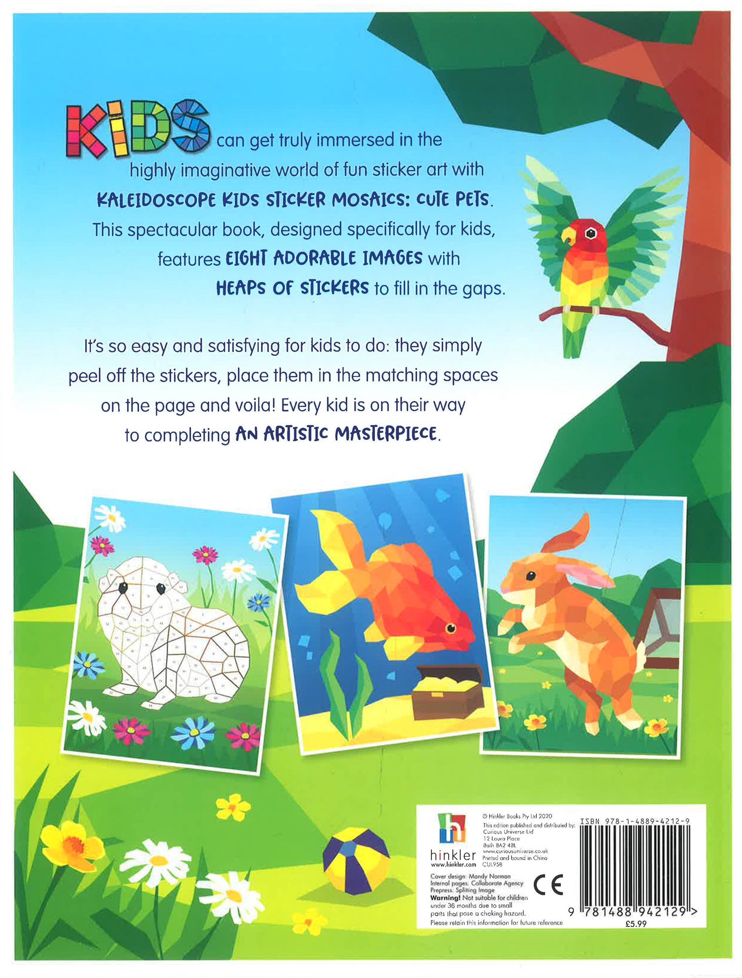 Each page contains an awesome geometric image of everyone's favourite pets, whether it's a kitten, puppy, rabbit, guinea pig or hamster! It's so easy and satisfying for kids to do: they simply peel off the stickers, place them in the matching spaces on the page and voila! Every kid is on their way to completing an artistic masterpiece.