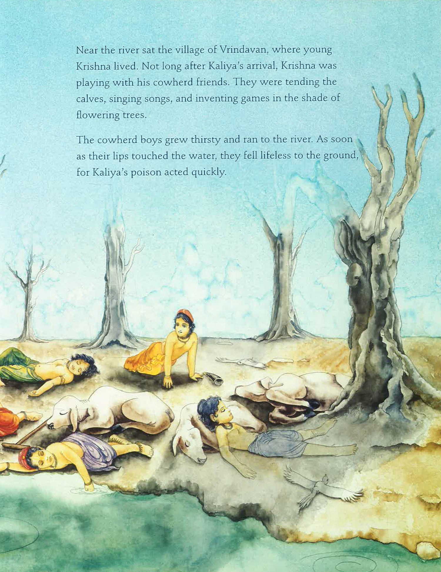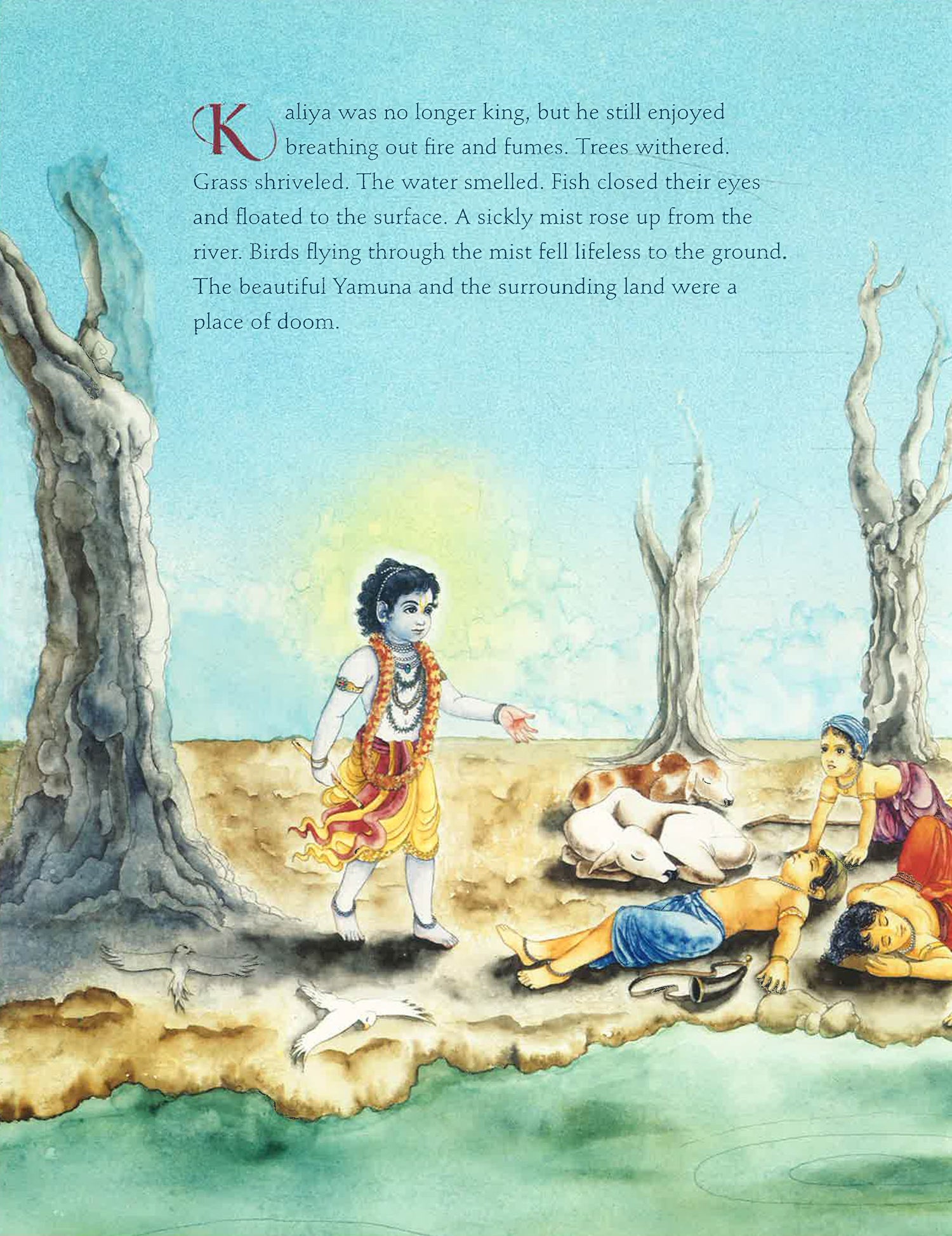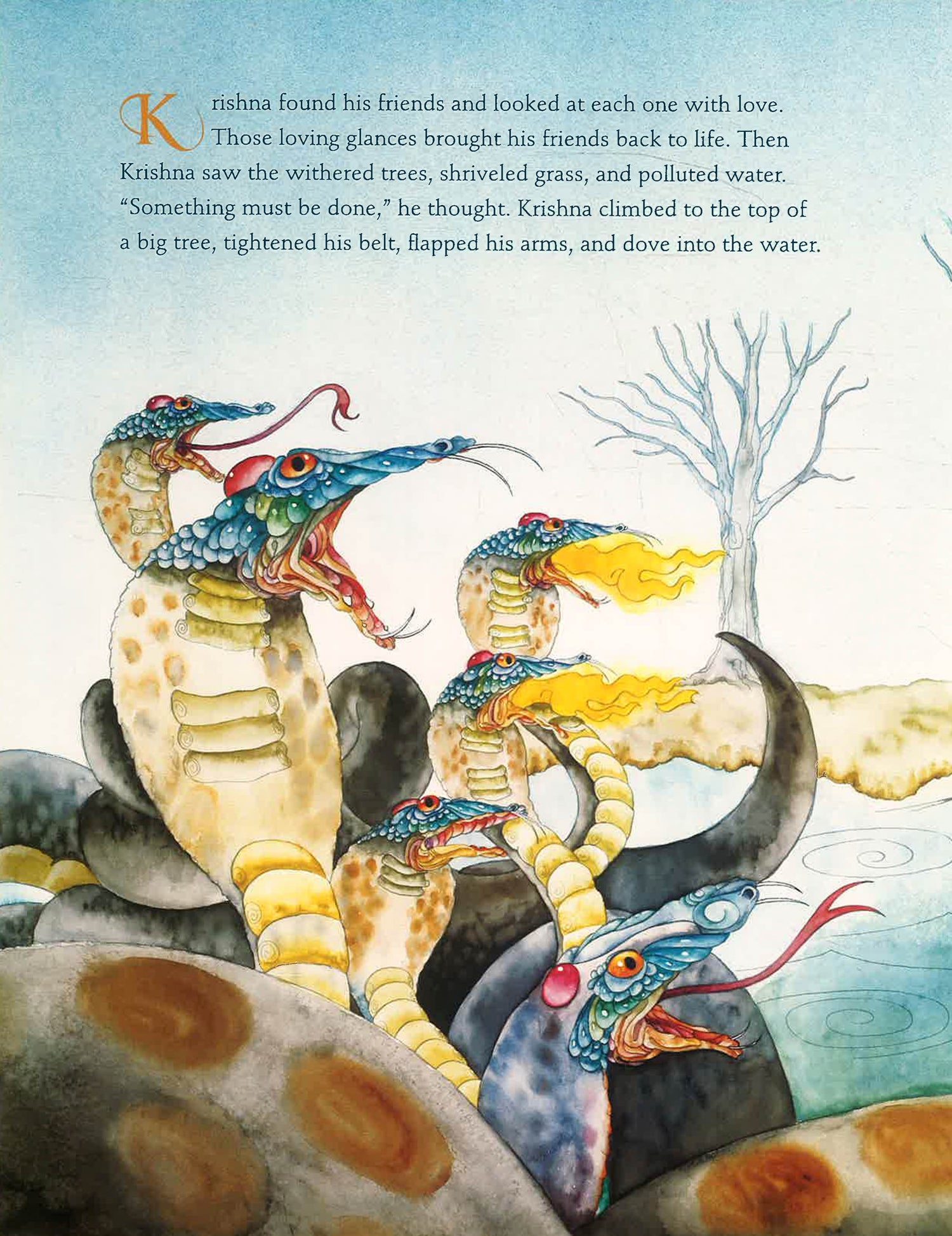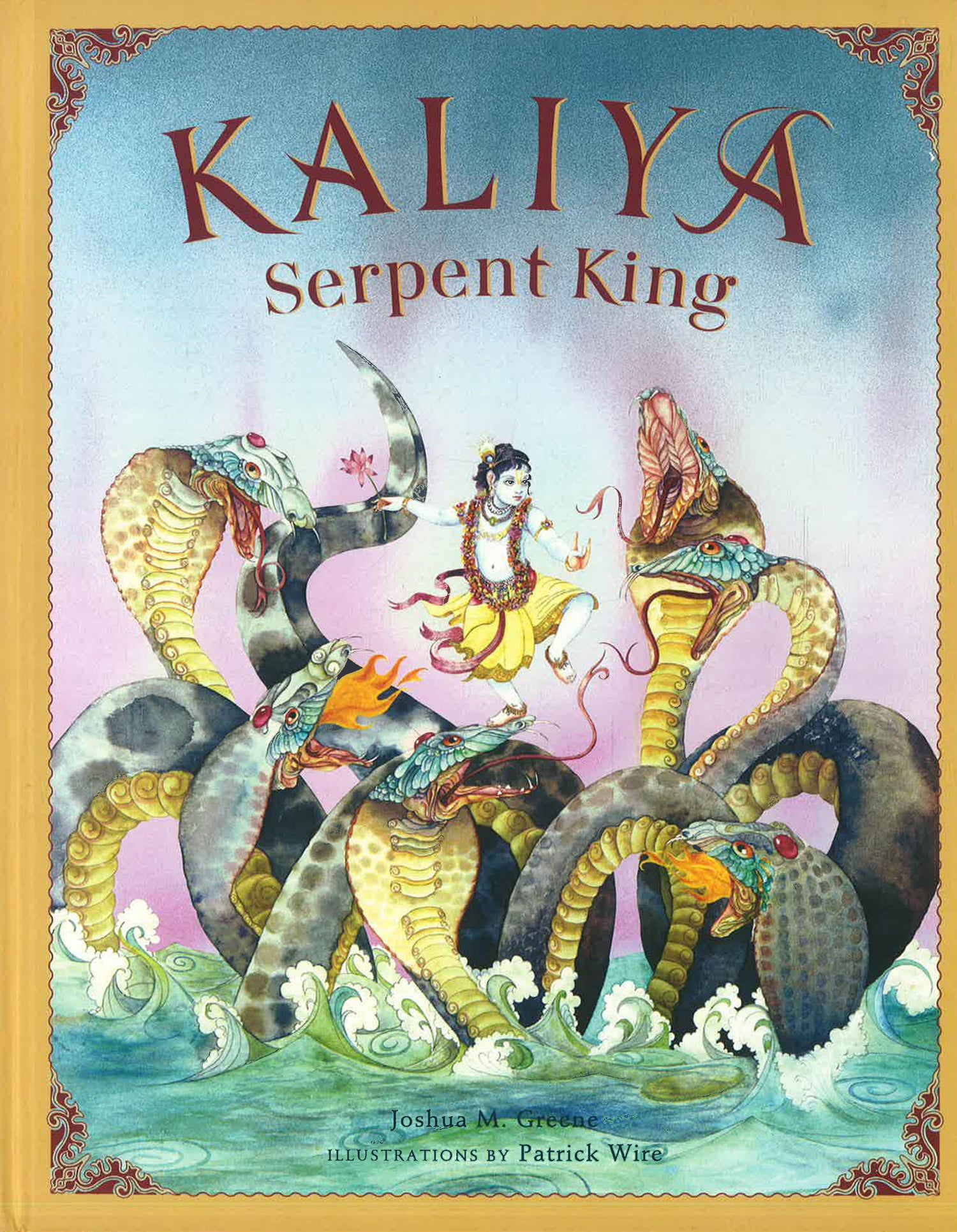 Rich illustrations and lyrical storytelling illuminate this ancient Sanskit story from India about bravery and respect for nature. Kaliya, king of ancient India's serpent people, crosses the gods and must leave. He takes his serpentine wives and offspring and relocates to the pristine Yamuna River, which flows by young Krishna's village of Vrindavan. The serpent king's venom poisons the river. Birds fall lifeless to the ground, trees and vegetation dry up, and the lives of the villagers are in danger. Although only a child, Krishna has sworn to protect the environment and safeguard the many animals and people who depend on the river for their existence. Whether one views Krishna as a divine being or as a mischievous child, his respect for nature is exemplary. This tale from India's ancient Sanskrit wisdom texts transcends its moment in remote history to deliver a message as relevant as today's news. Artist Patrick Wire's luminous illustrations recall the vibrant palette of Maxfield Parrish and complement author Joshua Greene's lyrical retelling of this classic story.