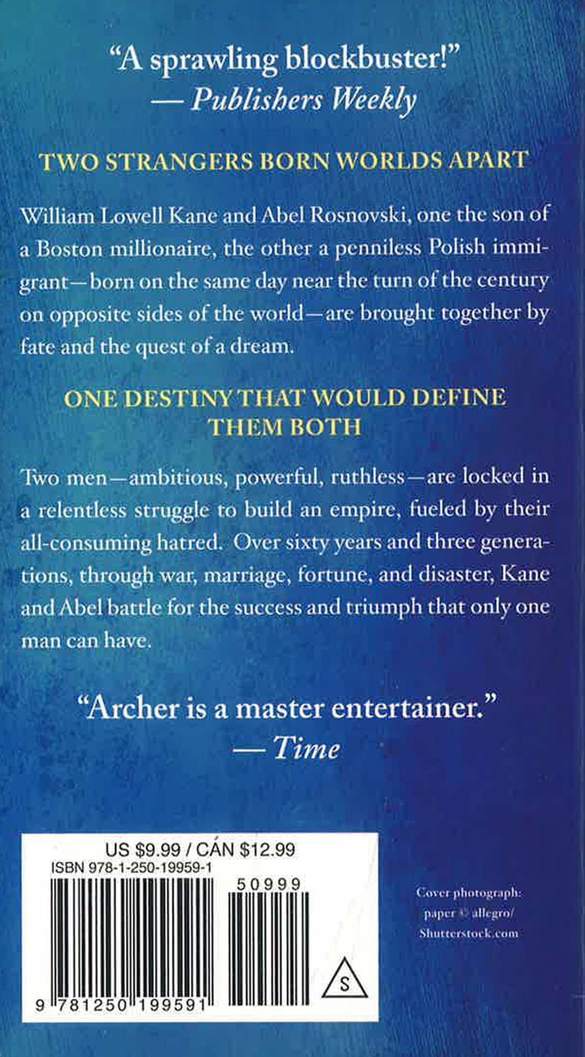 Two men--ambitious, powerful, ruthless--are locked in a relentless struggle to build an empire, fueled by their all-consuming hatred. Over sixty years and three generations, through war, marriage, fortune, and disaster, Kane and Abel battle for the success and triumph that only one man can have.