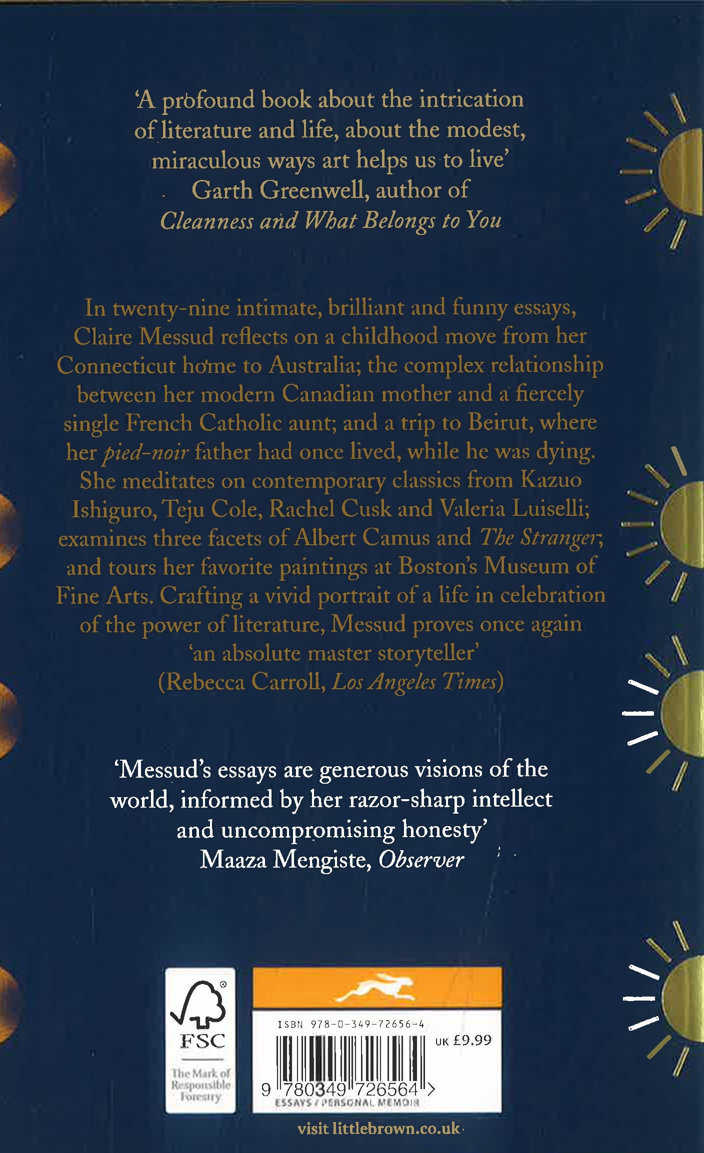 In twenty-nine intimate, brilliant and funny essays, Claire Messud reflects on a childhood move from her Connecticut home to Australia; the complex relationship between her modern Canadian mother and a fiercely single French Catholic aunt; and a trip to Beirut, where her pied-noir father had once lived, while he was dying. She meditates on contemporary classics from Kazuo Ishiguro, Teju Cole, Rachel Cusk and Valeria Luiselli; examines three facets of Albert Camus and The Stranger; and tours her favorite paintings at Boston's Museum of Fine Arts. Crafting a vivid portrait of a life in celebration of the power of literature, Messud proves once again 'an absolute master storyteller' (Rebecca Carroll, Los Angeles Times).