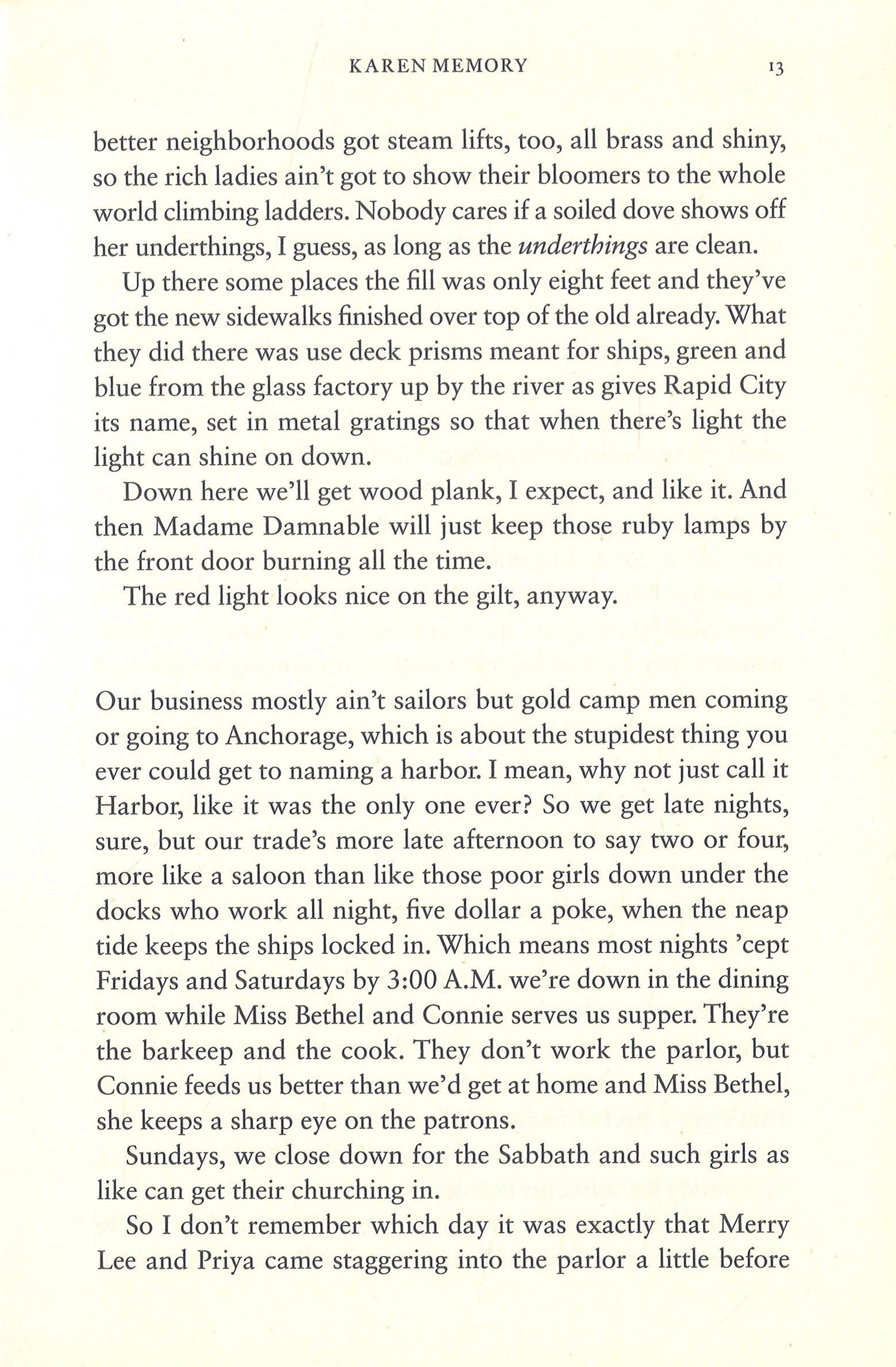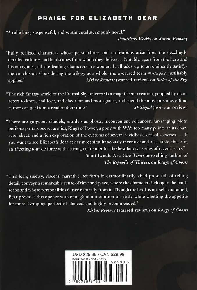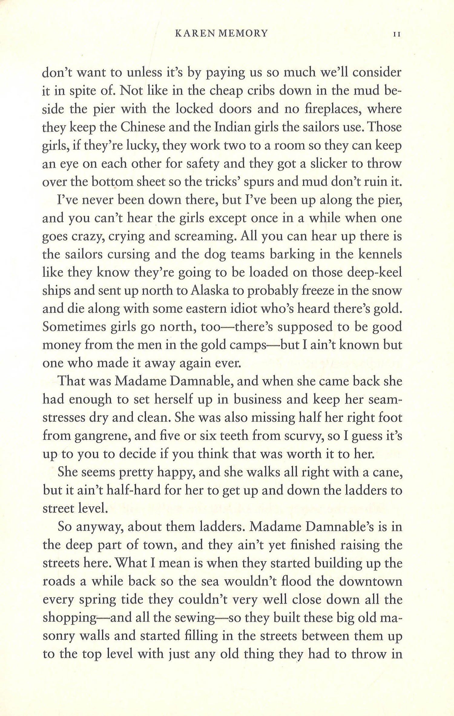 Set in the late 19th century - when the city we now call Seattle Underground was the whole town (and still on the surface), when airships plied the trade routes, would-be gold miners were heading to the gold fields of Alaska, and steam-powered mechanicals stalked the waterfront, Karen is a young woman on her own, making the best of her orphaned state by working in Madame Damnable's high-quality bordello. Through Karen's eyes we get to know the other girls in the house - a resourceful group - and the poor and the powerful of the town. Trouble erupts one night when a badly injured girl arrives at their door, begging sanctuary, followed by the man who holds her indenture, and who has a machine that can take over anyone's mind and control their actions. And as if that wasn't bad enough, the next night brings a body dumped in their rubbish heap - a streetwalker who has been brutally murdered. Bear brings alive this Jack-the-Ripper yarn of the old west with a light touch in Karen's own memorable voice, and a mesmerizing evocation of classic steam-powered science.