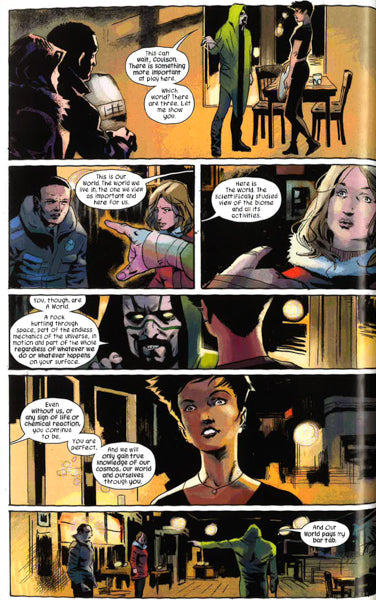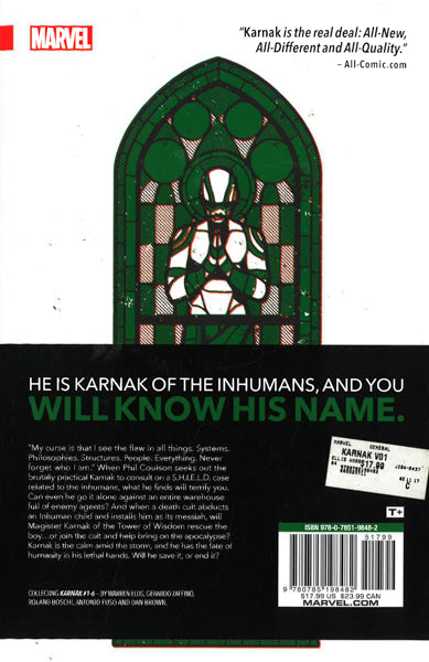 My curse is that I see the flaw in all things. Systems. Philosophies. Structures. People. Everything. Never forget who I am. I am Karnak of the Inhumans." You may not know who Karnak is now, but you will when Warren Ellis (MOON KNIGHT, PLANETARY) and Gerardo Zaffi no are done with you. Phil Coulson goes to Karnak to help with a S.H.I.E.L.D. case with Inhuman implications and what he's going to find will terrify you