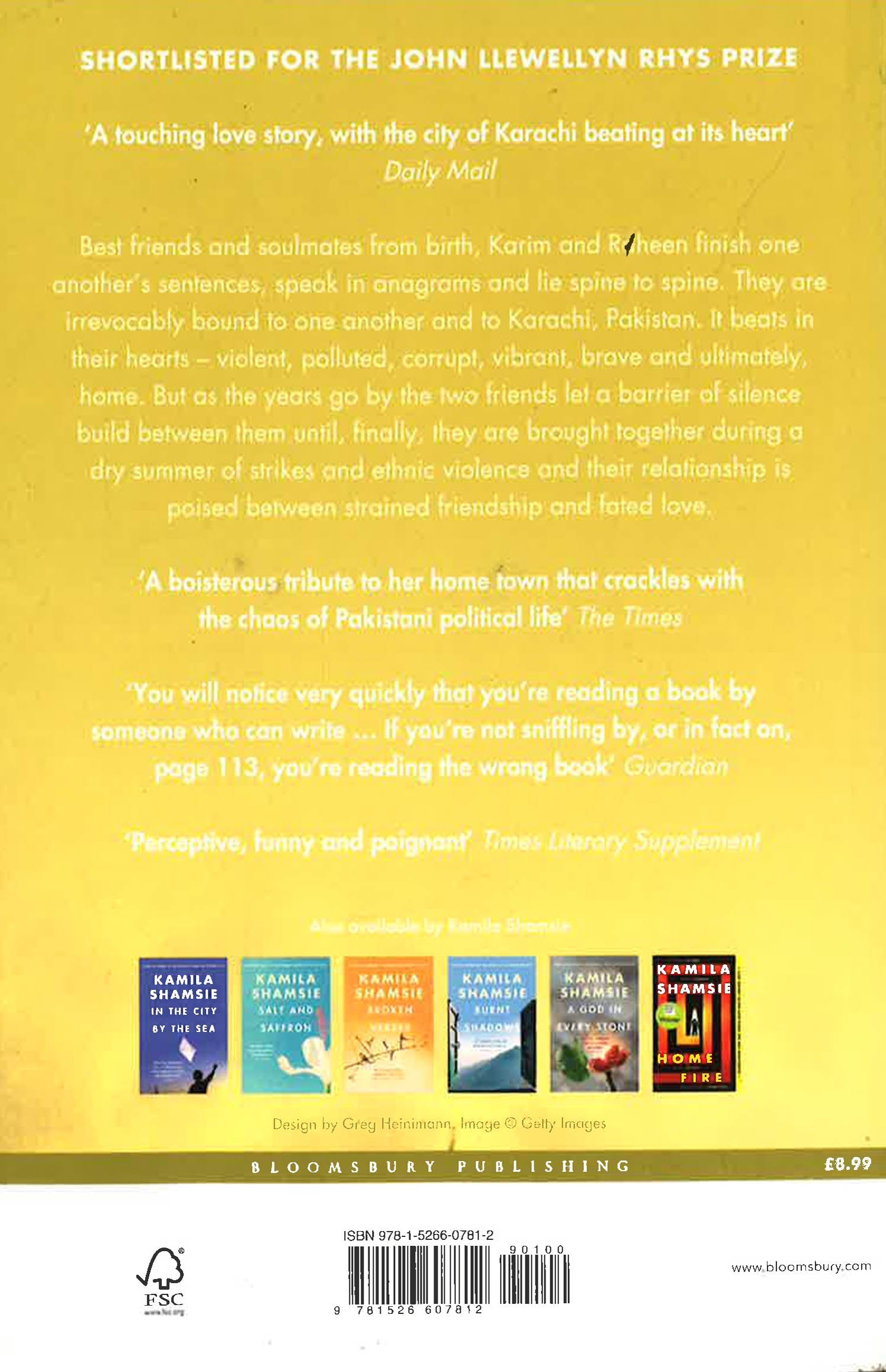 Shortlisted for the John Llewellyn Rhys Prize By the acclaimed winner of the Women's Prize for Fiction 2018 Soul mates from birth, Karim and Raheen finish one another's sentences, speak in anagrams and lie spine to spine. They are irrevocably bound to one another and to Karachi, Pakistan. It beats in their hearts - violent, polluted, corrupt, vibrant, brave and ultimately, home. As the years go by they let a barrier of silence build between them until, finally, they are brought together during a dry summer of strikes and ethnic violence and their relationship is poised between strained friendship and fated love.