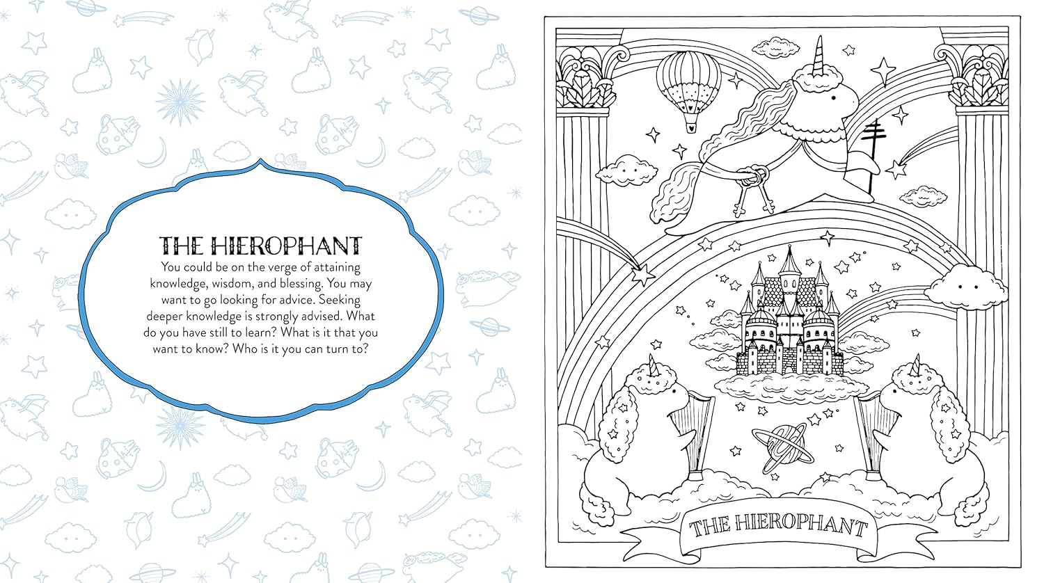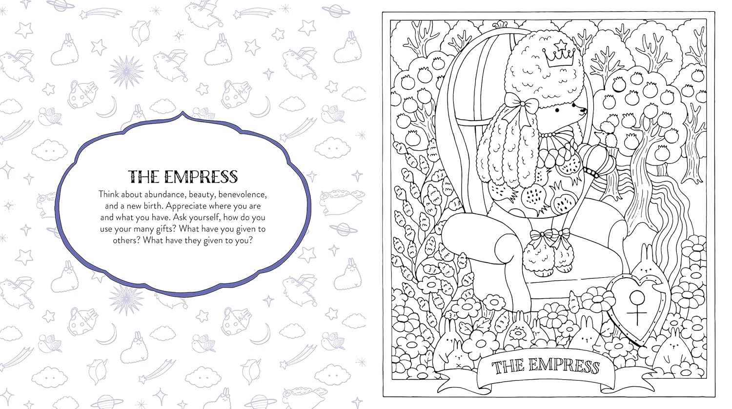 For centuries, tarot decks have taken many forms, and thousands of different art styles have graced their cards. But has there ever before been a cuter tarot deck? In Kawaii Tarot Coloring Book, the Major Arcana cards, which represent archetypes drawn from mythology and medieval society, include a lucky cat as The Fool, a fluffy unicorn as the High Priestess, a fancy Poodle as The Empress, and two cuddly bunnies as The Lovers. The cards of the Minor Arcana are also packed with silly and cute creatures, all waiting for you to color them in!