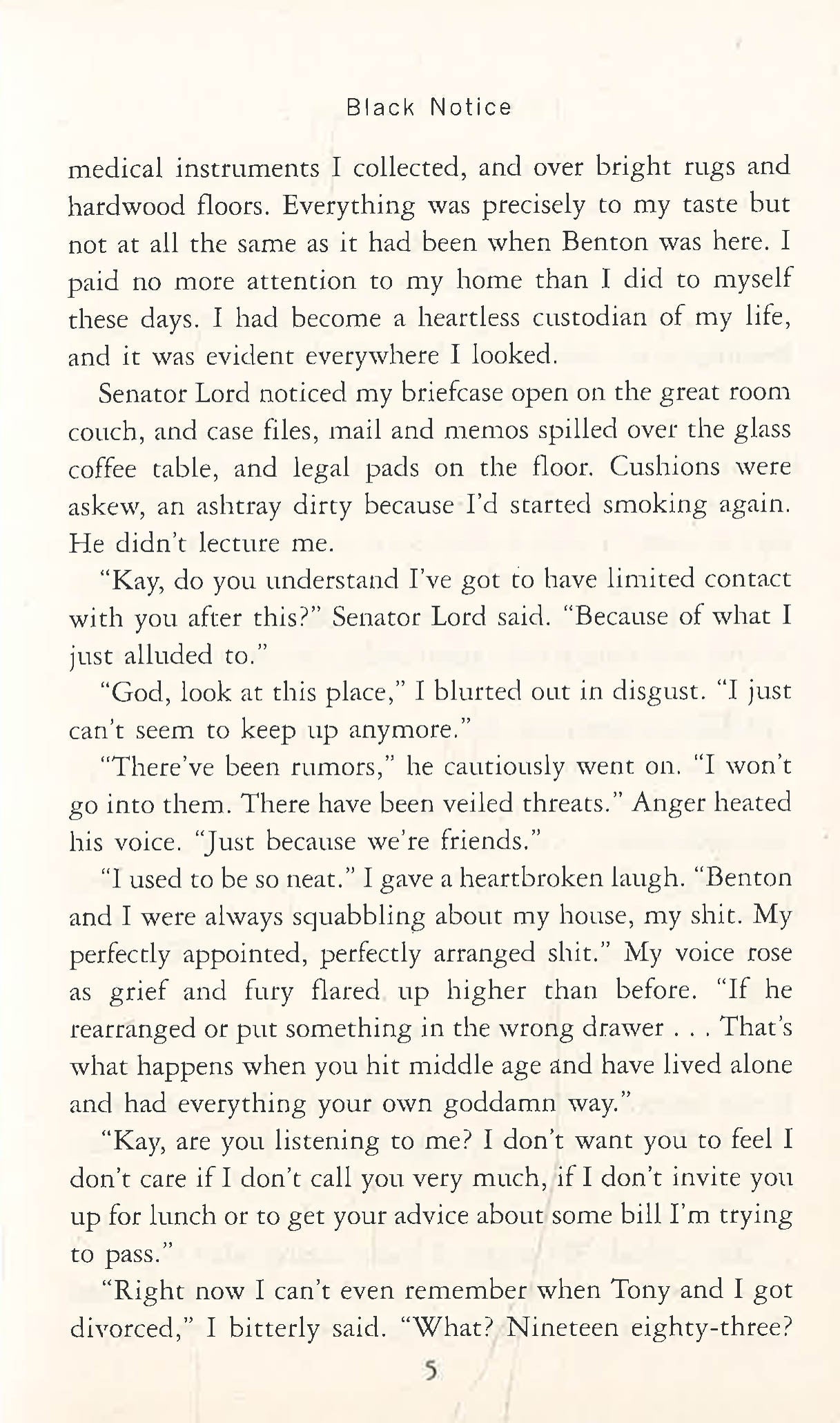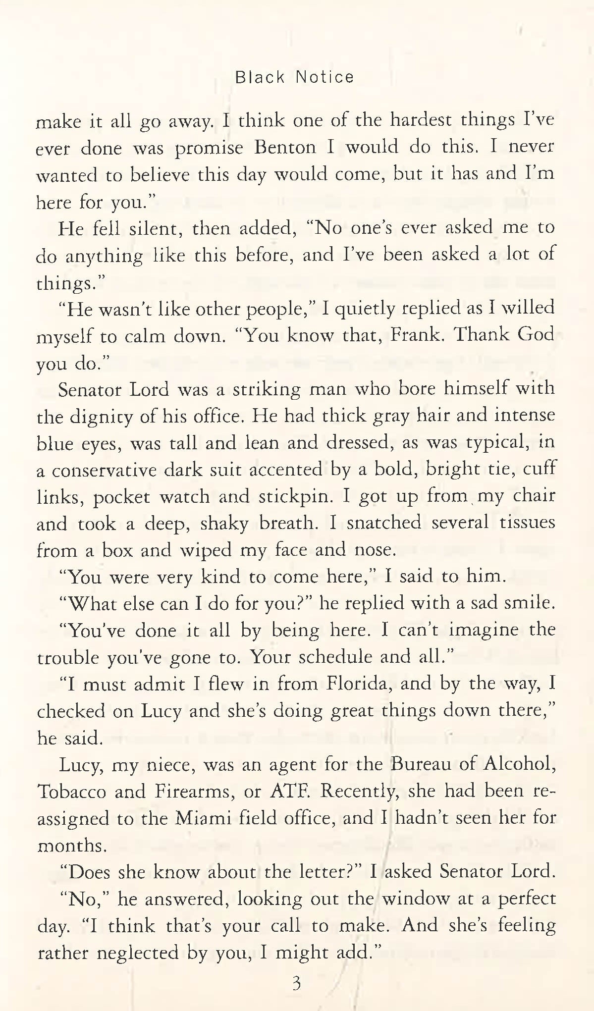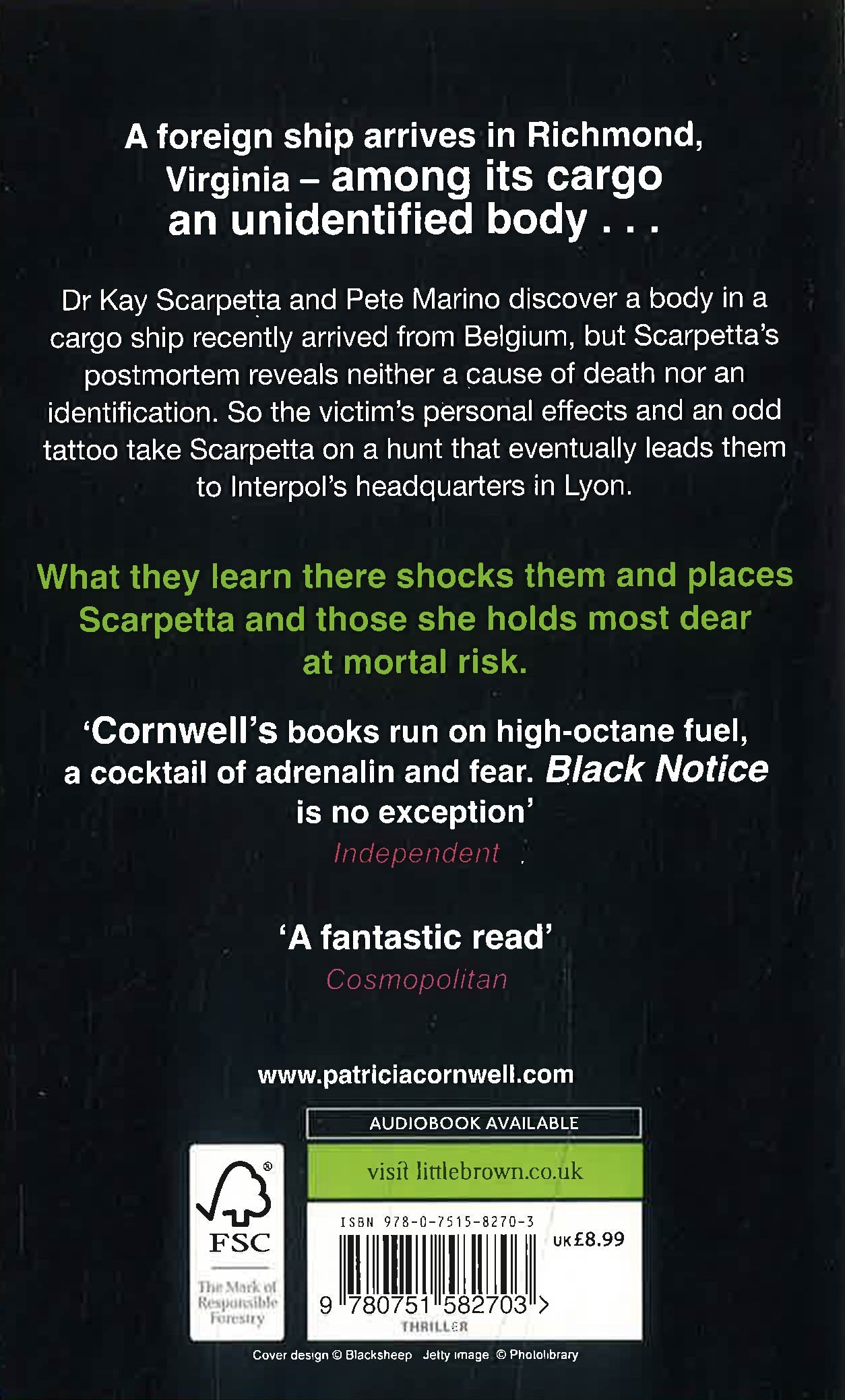 The case begins when a cargo ship arriving at Richmond, Virginia’s Deep Water Terminal from Belgium is discovered to be transporting a locked, sealed container holding the decomposed remains of a stowaway. The post mortem performed by the Chief Medical Examiner, Kay Scarpetta, initially reveals neither a cause of death nor an identification. But the victim’s personal effects and an odd tattoo take Scarpetta on a hunt for information that leads to Interpol’s headquarters in Lyon, where she receives critical instructions: go to the Paris morgue to receive secret evidence and then return to Virginia to carry out a mission. It is a mission that could ruin her career.In a story which crosses international borders, BLACK NOTICE puts Dr Kay Scarpetta directly in harm’s way and places her and those she holds dear at mortal risk.