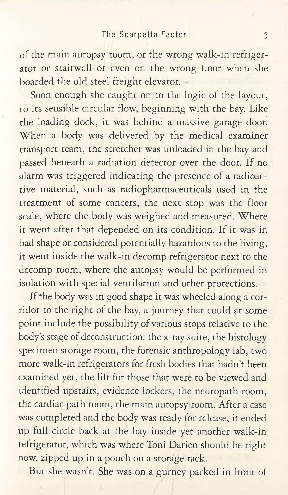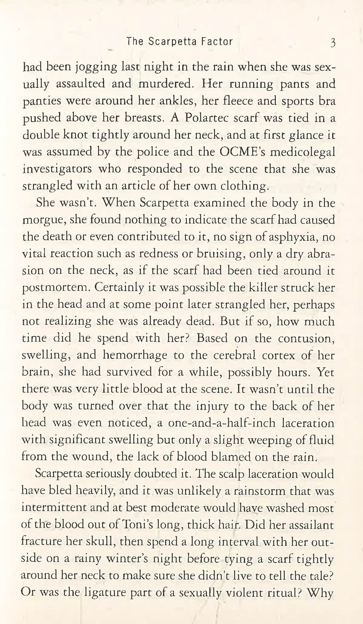 Scarpetta's CNN producer wants her to launch a TV show called The Scarpetta Factor. Given the bizarre events already in play, she fears that her growing fame will generate the illusion that she has a "special factor," a mythical ability to solve all her cases. She wonders if she will end up like other TV personalities: her own stereotype.