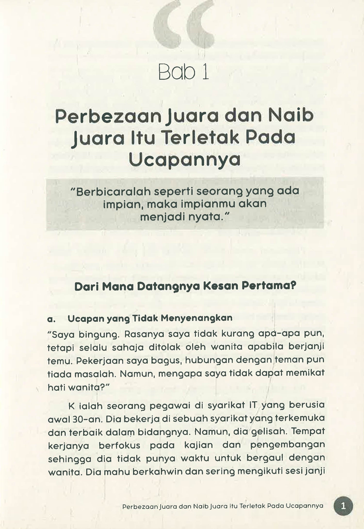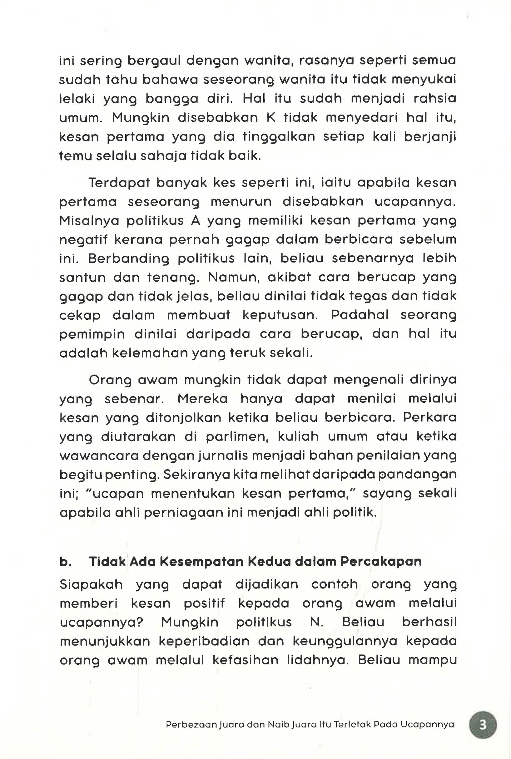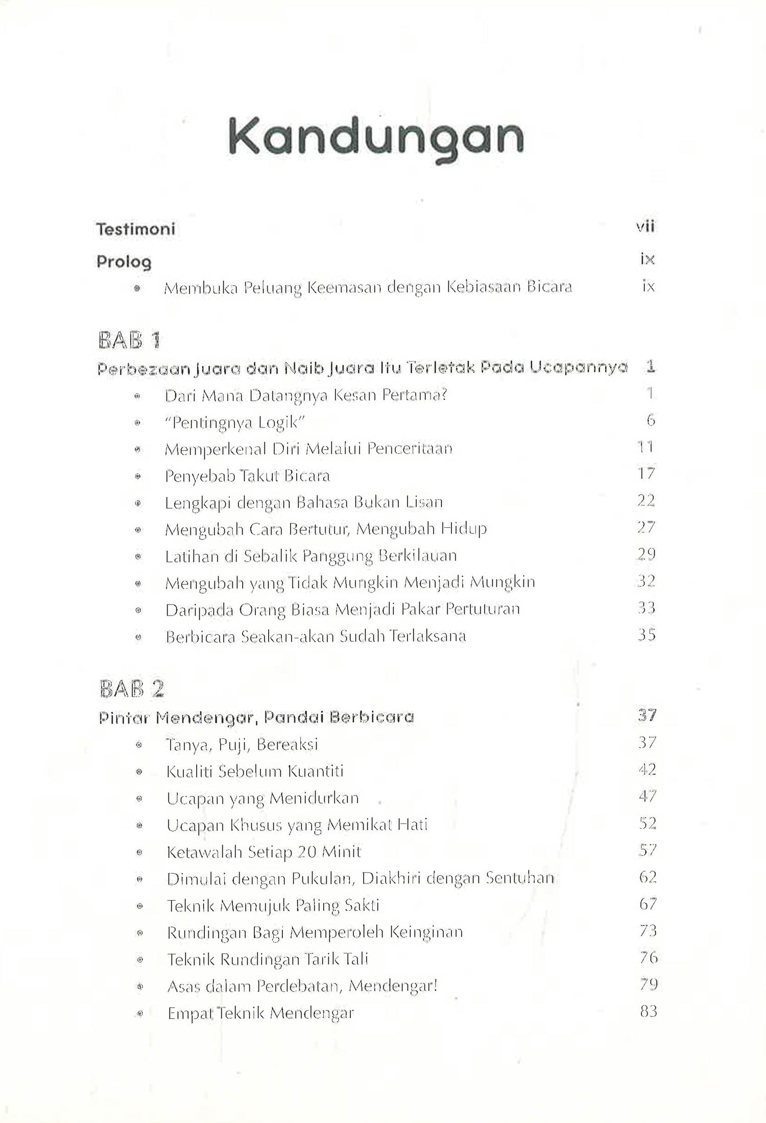 Kemahiran berkomunikasi adalah kayu ukur persaingan dalam kehidupan hari ini. Oh Su Hyang, pakar komunikasi terkemuka di Korea Selatan, tampil menghasilkan buku mengenai pelbagai teknik komunikasi yang berharga. Namun, apakah yang dimaksudkan dengan kemahiran berkomunikasi yang baik? Ia bukan sekadar menyebut perkataan dengan jelas, malah mampu menggetarkan jiwa para pendengar. Ucapan seorang juara memiliki daya tarikan. Ucapan seorang pengacara majlis mampu menghidupkan suasana. Bagi mencapai objektif komunikasi, pujukan dan negosiasi, anda perlukan beberapa metode yang efisien. Buku ini dihasilkan untuk dipraktikkan oleh sesiapa sahaja. Anda dapat belajar daripada pengalaman-pengalaman orang terkenal dan menguasai rahsia mereka. Dengan komitmen dan kesungguhan, kita pasti dapat menguasai kemahiran berkomunikasi dan menghasilkan impak yang positif.