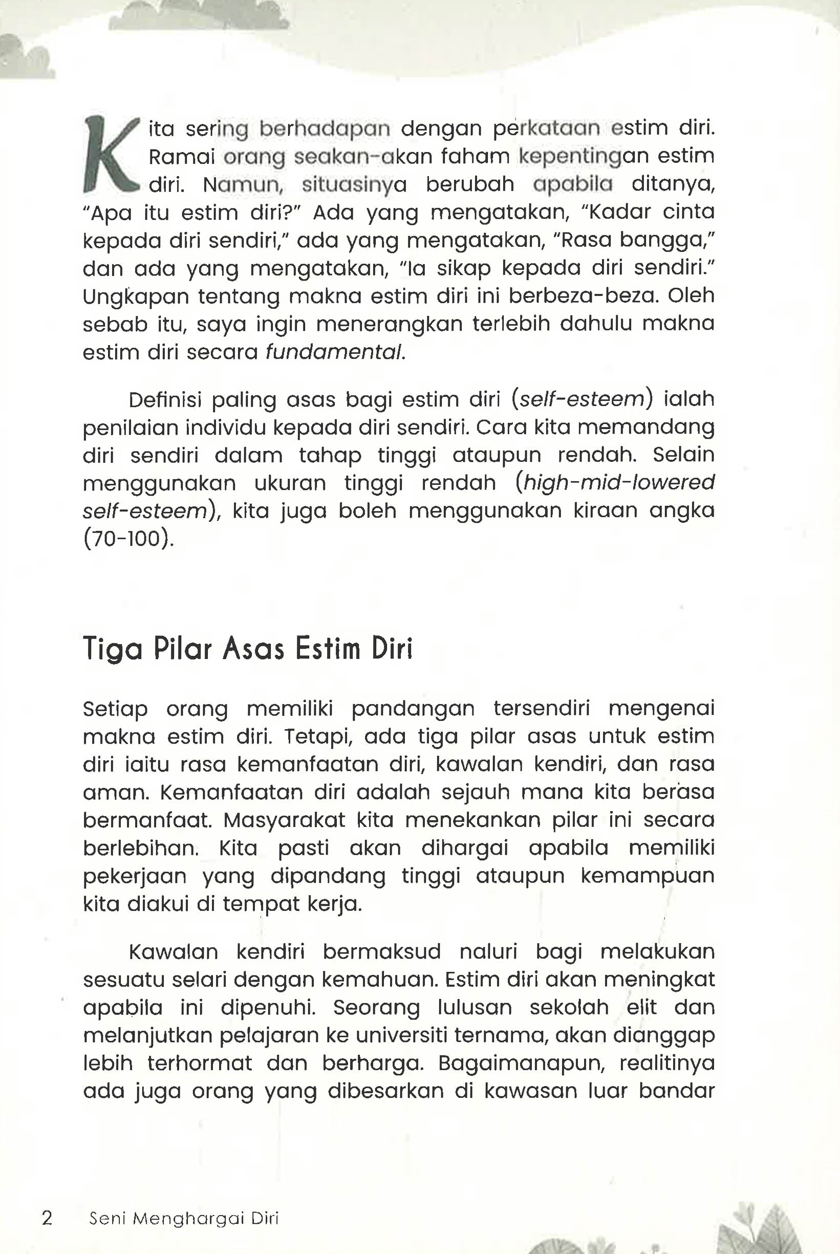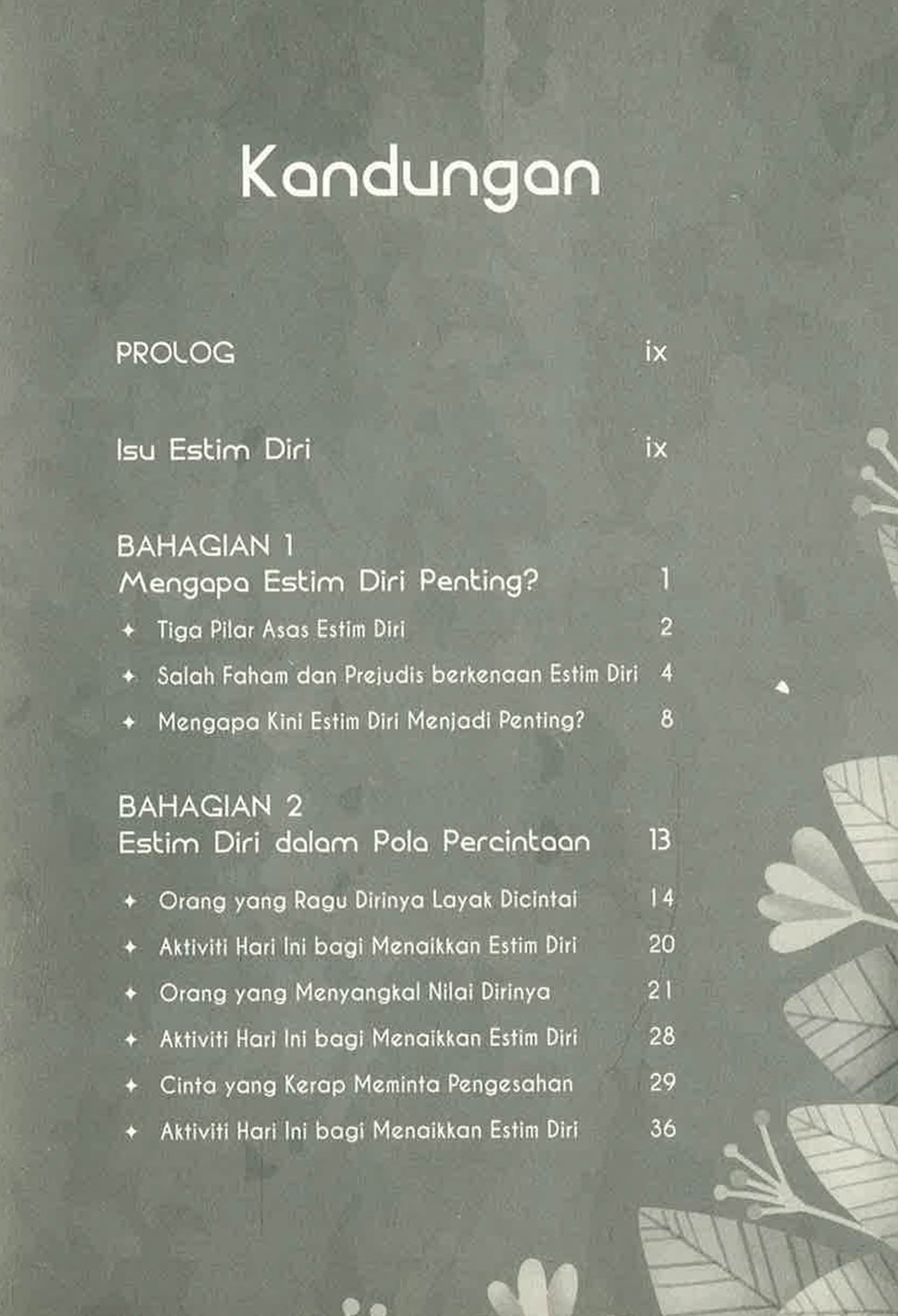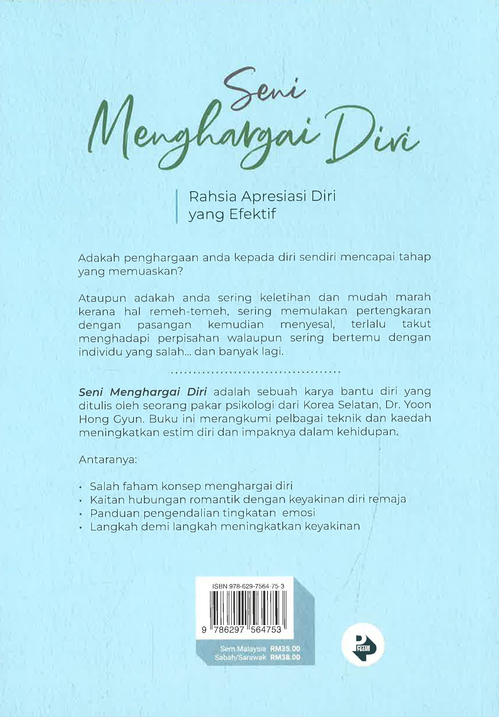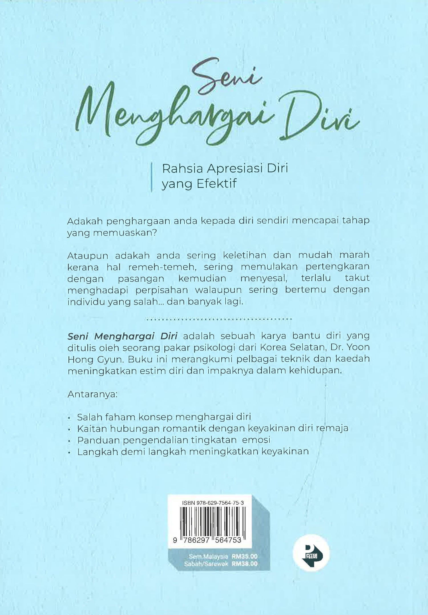 Adakah penghargaan anda kepada diri sendiri mencapai tahap yang memuaskan? Ataupun adakah anda sering keletihan dan mudah marah kerana hal remeh-temeh, sering memulakan pertengkaran dengan pasangan kemudian menyesal, terlalu takut menghadapi perpisahan walaupun sering bertemu dengan individu yang salah… dan banyak lagi. —— Seni Menghargai Diri adalah sebuah karya bantu diri yang ditulis oleh seorang pakar psikologi dari Korea Selatan, Dr. Yoon Hong Gyun. Buku ini merangkumi pelbagai teknik dan kaedah meningkatkan estim diri dan impaknya dalam kehidupan. Antaranya: -Salah faham konsep menghargai diri - Kaitan hubungan romantik dengan keyakinan diri remaja -Panduan pengendalian tingkatan emosi -Langkah demi langkah meningkatkan keyakinan