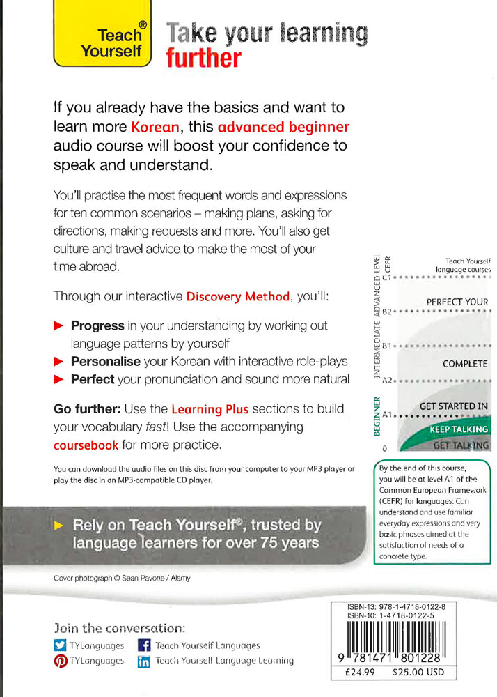 When going abroad do you want to: - Communicate more accurately and precisely? - Get to places other travellers don't? - Do more than just 'get by'? - Have fun and more authentic experiences? ...Then you need to Keep Talking! Through 10 common scenarios plus culture and travel advice this advanced beginner level audio course will get you beyond the basics. - Practise the most frequent words and expressions for common travel situations - Progress in your understanding of naturally paced conversations - Personalize the language with interactive role-plays - Perfect your pronunciation and sound more natural You'll progress in your understanding by working out language patterns for yourself, personalize your Korean with interactive role-plays and perfect your pronunciation to sound more natural. This advanced beginner Korean course contains an MP3 CD. You can download the audio files on this disc from your computer to your MP3 player or play it in an MP3 CD player. Also included is a handy phrasebook and a PDF coursebook for reading and writing practice. Keep Talking Korean - Ten Days to Confidence maps to A1 of the Common European Framework of Reference (CEFR) for languages. Rely on Teach Yourself, trusted by language learners for over 75 years.