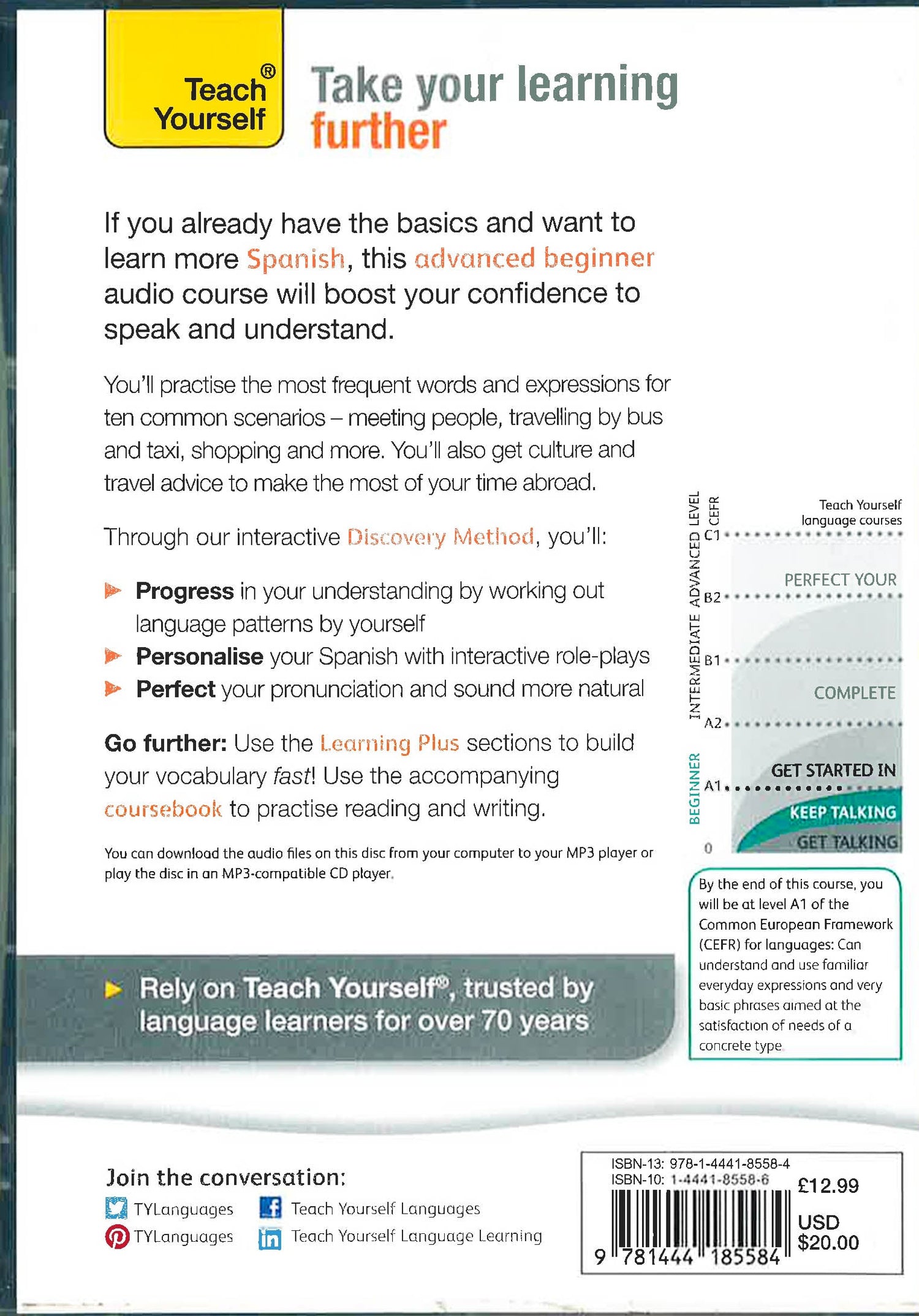 If you already have the basics and want to learn more Spanish, this advanced beginner audio course will boost your confidence to understand and speak Spanish.Practise the most frequent words and expressions for:-explaining where you are from-describing your job-telling the time-booking a table-taking the bus-phoning for a taxi-calling a plumber-shopping in the market-buying clothes-buying shoes.You'll progress in your understanding by working out language patterns for yourself, personalize your Spanish with interactive role-plays and perfect your pronunciation to sound more natural.This advanced beginner Spanish course contains an MP3 CD. You can download the audio files on this disc from your computer to your MP3 player or play it in an MP3 CD player. Also included is a handy phrasebook and a PDF coursebook for reading and writing practice.Keep Talking Spanish - Ten Days to Confidence maps to A1 of the Common European Framework of Reference (CEFR) for languages.Rely on Teach Yourself, trusted by language learners for over 75 years.
