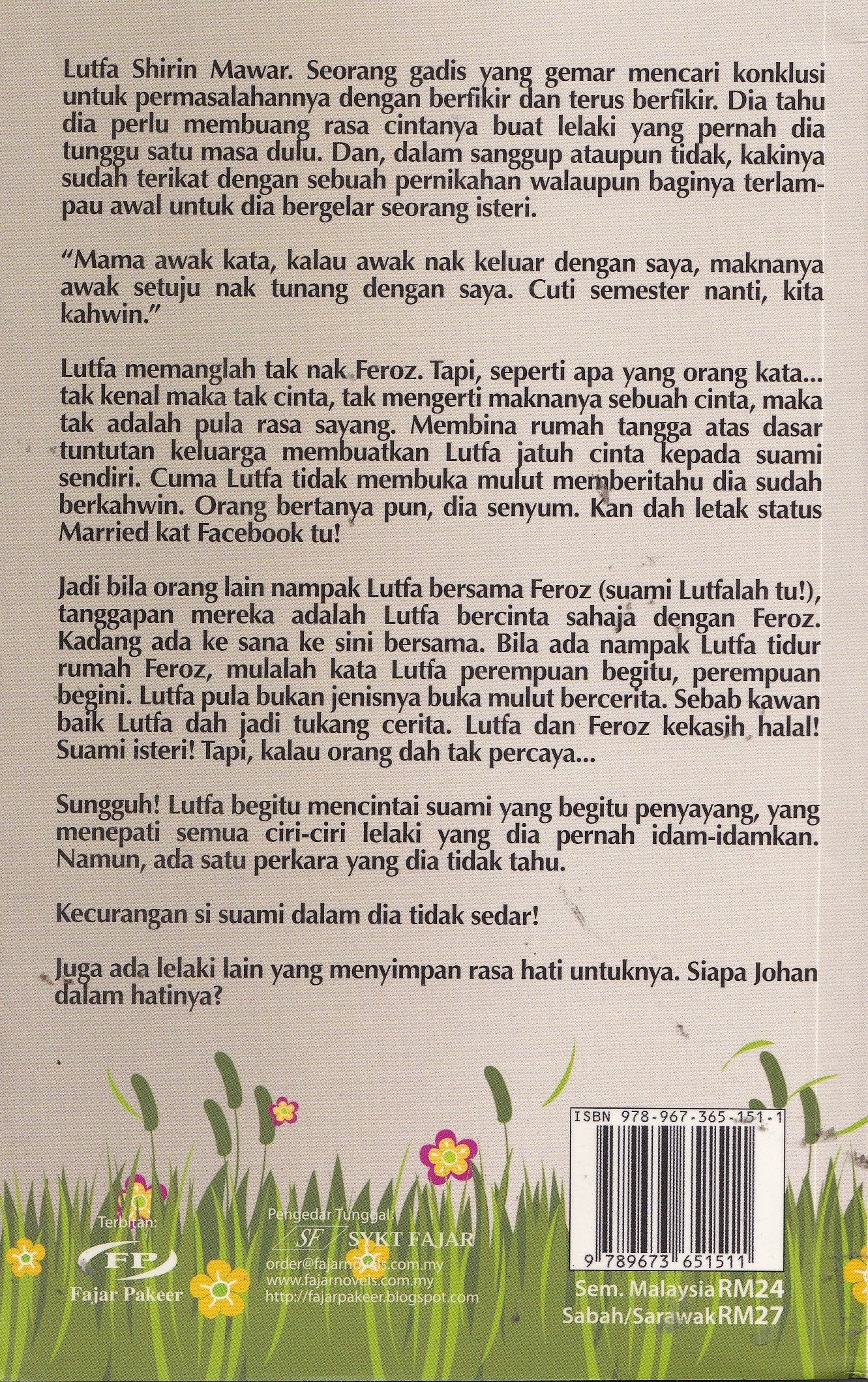 tak adalah pula rasa sayang, membina rumah tangga atas dasar tuntutan keluarga nmembuatkan Lutfa jatuh cinta kepada suami sendiri. Cuma Luta tidak membuka mulut memberitahu dia sudah berkanwIn. Orang bertanya pun, dia senyum. Kan dah letak status Married kat Facebook tu!
