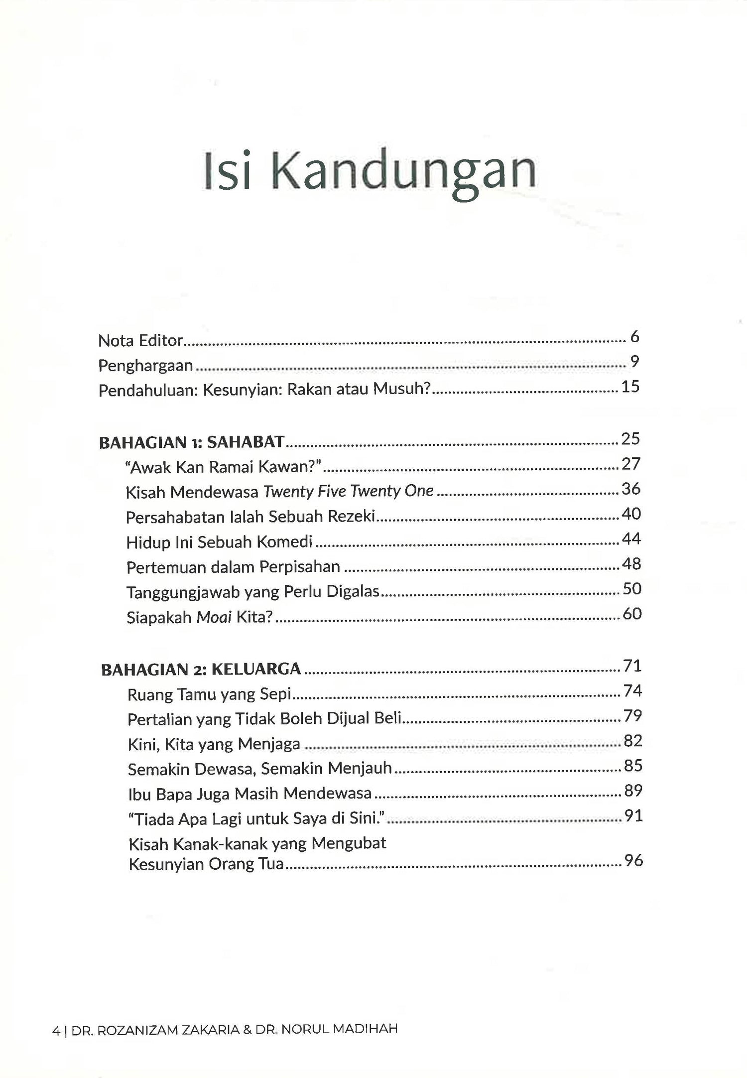 Buku Kenapa Hidup Makin Sunyi? ini mengajak kita untuk berhenti sejenak, merenung perasaan sunyi dan menghargai momen kesendirian sebagai peluang untuk semakin mencintai diri. Dengan kupasan penuh berempati dari perspektif klinikal dan peribadi, para penulis membawa kita meneroka perasaan sunyi dari kaca mata berbeza, serta memandu kita cara untuk menghadapinya.