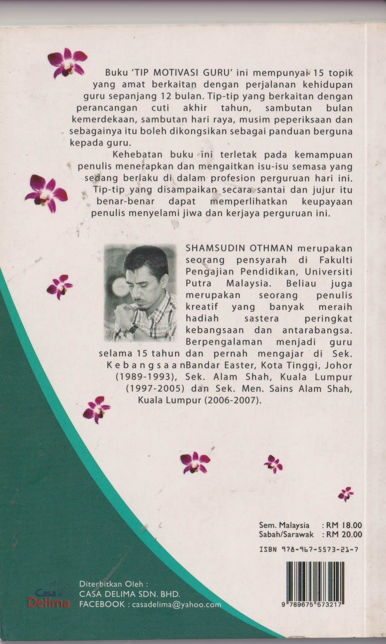 Buku 'TIP MOTIVASI GURU' ini mempunyai 15 topik yang amat berkaitan dengan perjalanan kehidupan kehidupan guru sepanjang 12 bulan. Tip-tip yang berkaitan dengan bulan kemerdekaan, sambutan hari raya, musim peperiksaan dan sebagainya itu boleh dikongsikan sebagai panduan berguna kepada guru. Kehebatan buku ini terletak pada kemampuan kemampuan penulis menerapkan dan mengaitkan isu-isu semasa yang sedang berlaku di dalam profesion perguruan hari ini. Tip-tip yang disampaikan secara santai dan jujur itu benar-benar dapat memperlihatkan keupayaan penulis menyelami jiwa dan kerjaya perguruan ini.