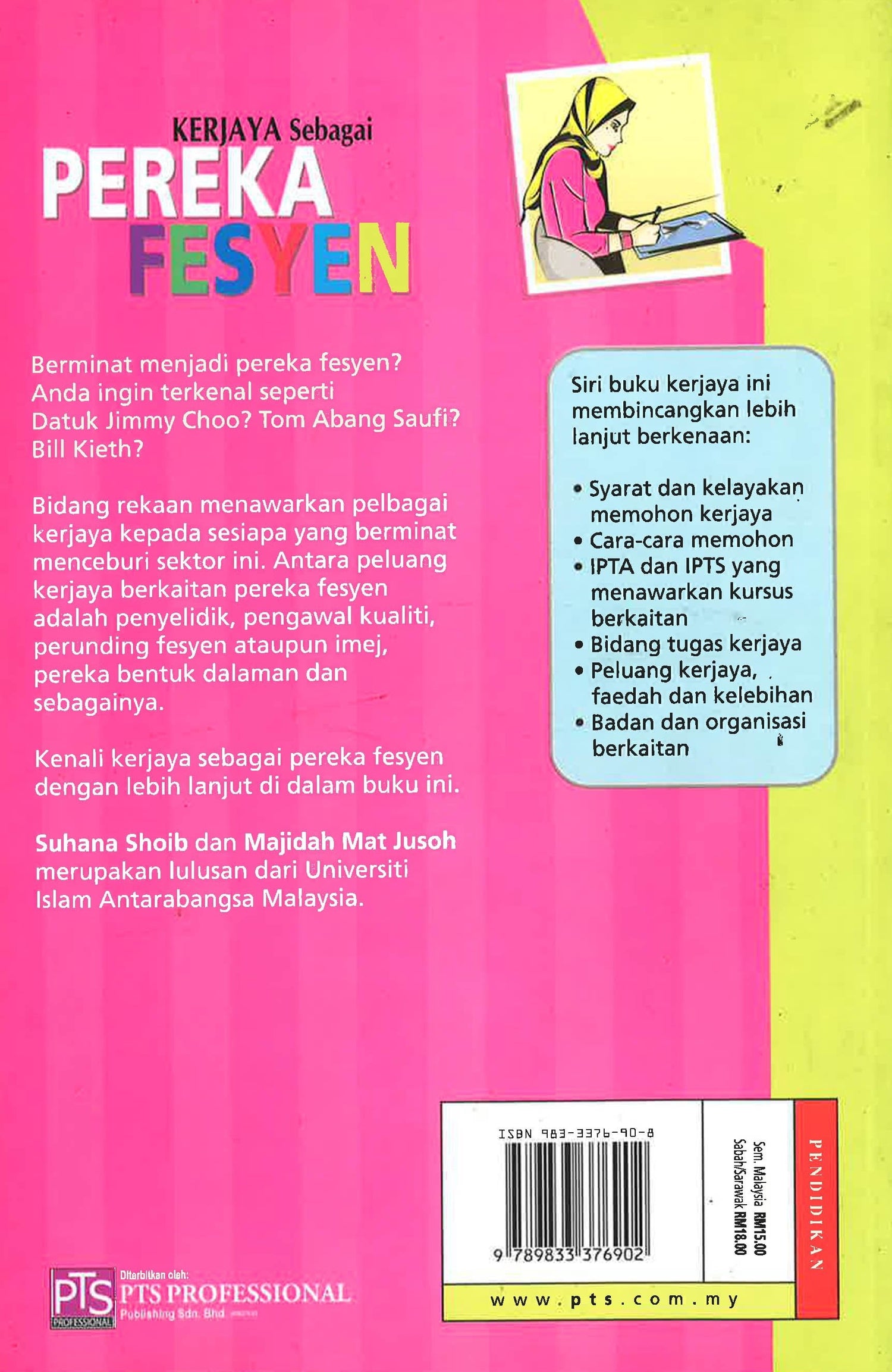 Berminat menjadi pereka fesyen? Anda ingin terkenal seperti Datuk Jimmy Choo? Tom Abang Saufi? Bill Kieth? Bidang rekaan menawarkan pelbagai kerjaya kepada sesiapa yang berminat menceburi sektor ini. Antara peluang kerjaya berkaitan pereka fesyen adalah penyelidik, pengawal kualiti, perunding fesyen ataupun imej, pereka bentuk dalaman dan sebagainya. Kenali kerjaya sebagai pereka fesyen dengan lebih lanjut di dalam buku ini.
