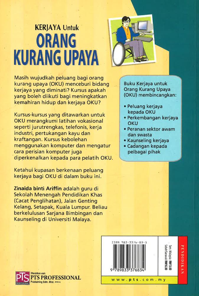 Masih wujudkah peluang bagi orang kurang upaya (OKU) menceburi bidang kerjaya yang diminati? Kursus apakah yang boleh diikuti bagi meningkatkan kemahiran hidup dan kerjaya OKU? Kursus-kursus yang ditawarkan untuk OKU merangkumi latihan vokasional seperti jurutrengkas, telefonis, kerja industri, pertukangan kayu dan kraftangan. Kursus kebolehan menggunakan komputer dan mengatur cara perisian komputer juga diperkenalkan kepada para pelatih OKU. Ketahui kupasan berkenaan peluang kerjaya bagi OKU di dalam buku ini.