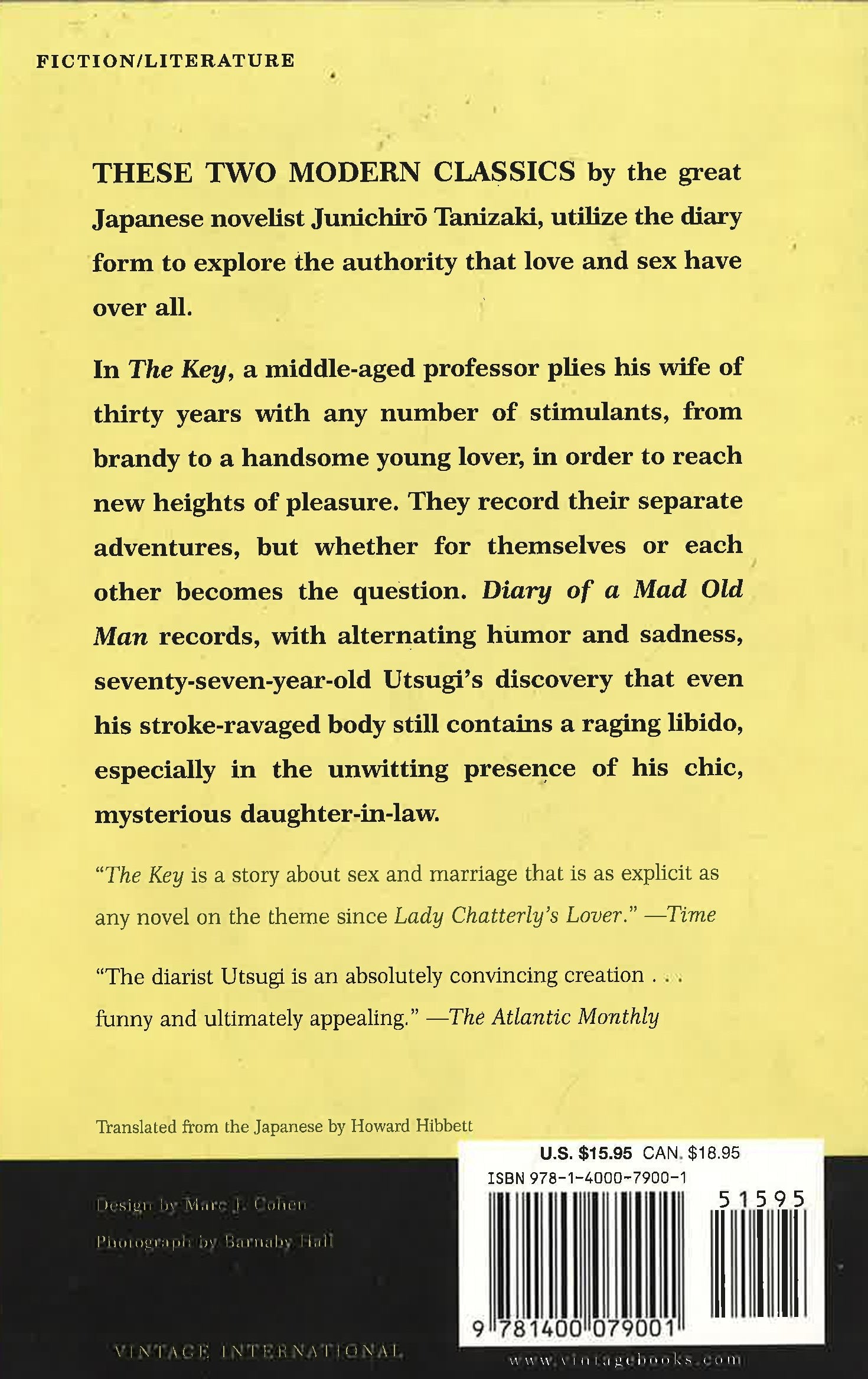 These two modern classics by the great Japanese novelist Junichiro Tanizaki, both utilize the diary form to explore the authority that love and sex have over all. In The Key, a middle-aged professor plies his wife of thirty years with any number of stimulants, from brandy to a handsome young lover, in order to reach new heights of pleasure. Their alternating diaries record their separate adventures, but whether for themselves or each other becomes the question. Diary of a Mad Old Man records, with alternating humor and sadness, seventy-seven-year-old Utsugi's discovery that even his stroke-ravaged body still contains a raging libido, especially in the unwitting presence of his chic, mysterious daughter-in-law.