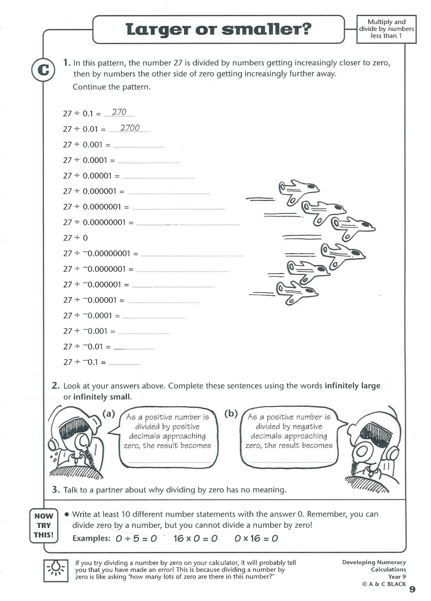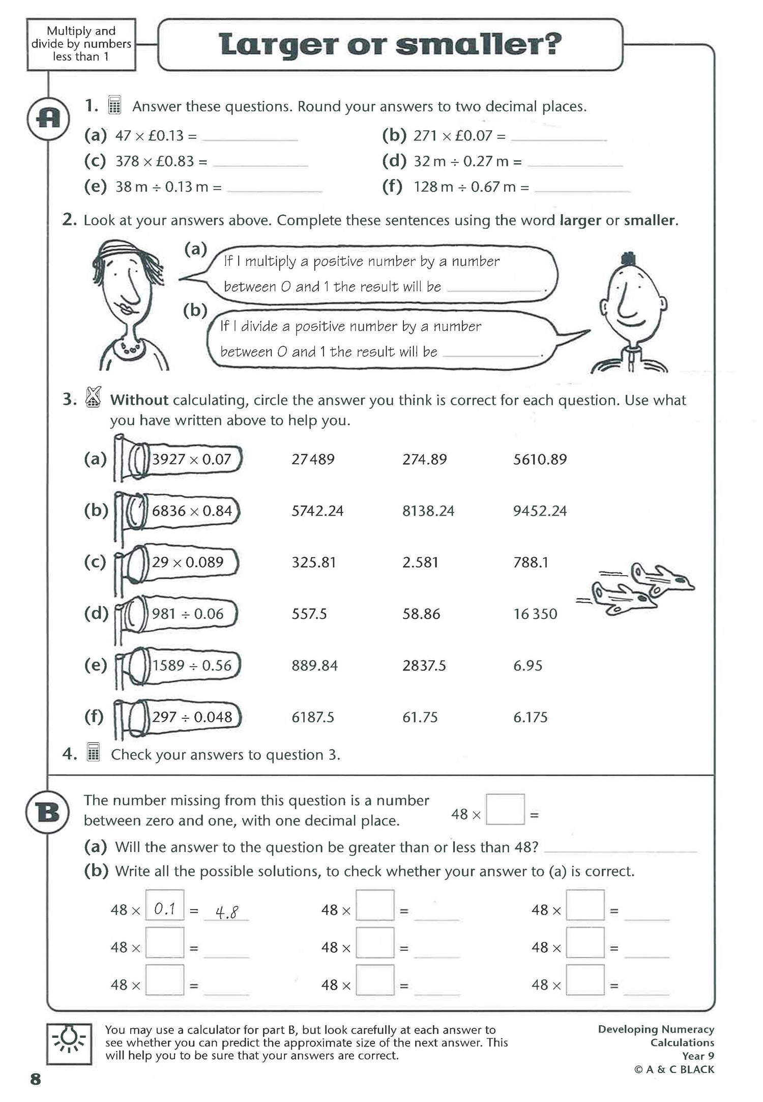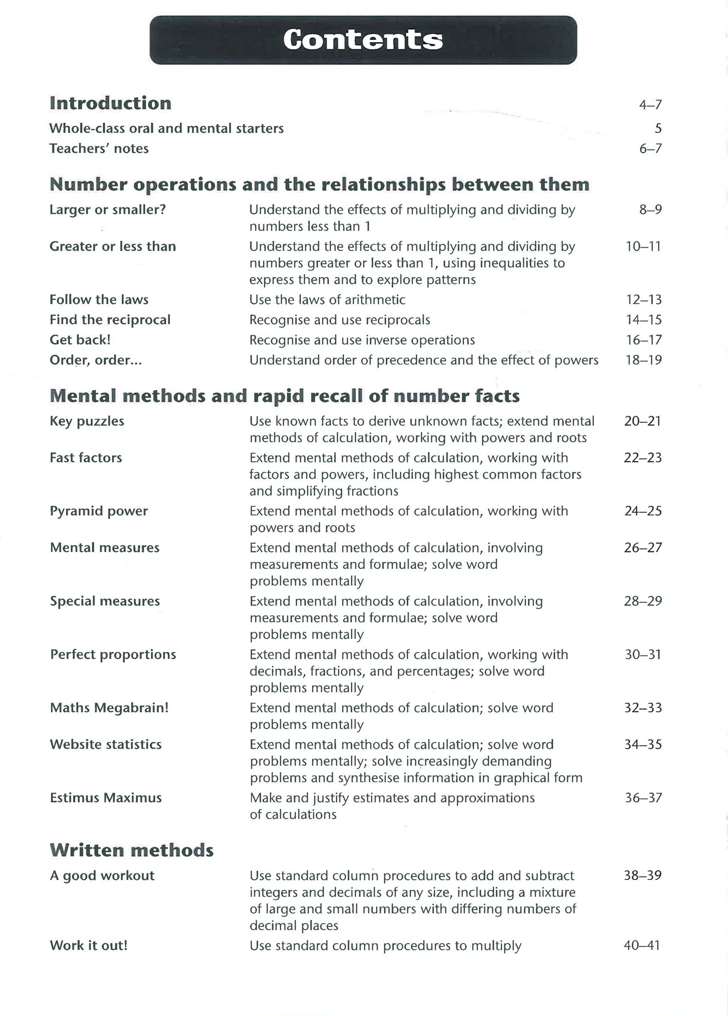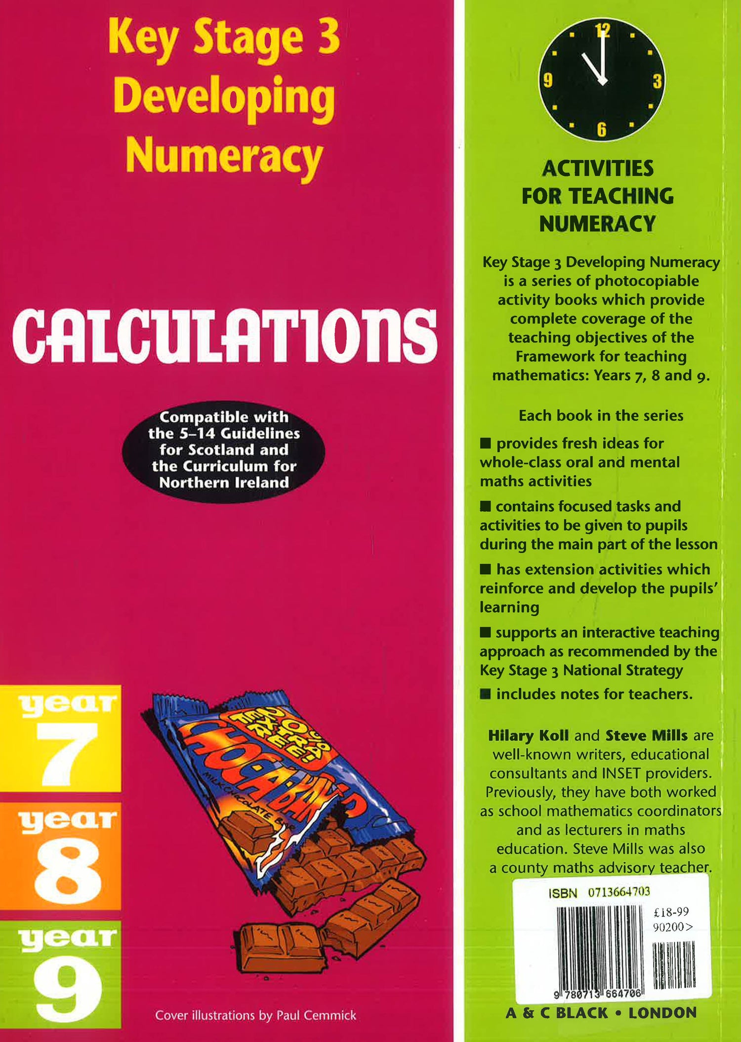 A photocopiable maths activity book for Key Stage 3 students in Year 9. It seeks to cover all the key objectives of the Calculations" strand of the National Numeracy Strategy framework. There are over 50 pages of photocopiable activities, and minimal teacher preparation is required. There are ideas for whole-class oral and mental maths "starter" activities (as recommended by the framework). Each activity is divided into three progressive steps for easy differentiation, and extension learning activities are provided to reinforce and develop the pupils' learning. There are notes for teachers. The text is part of a series in which there is one book for each year group at Key Stage 3, from Year 7 to Year 9."